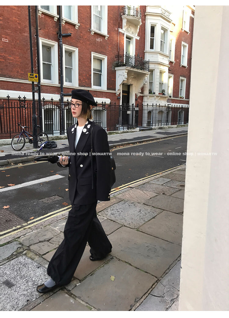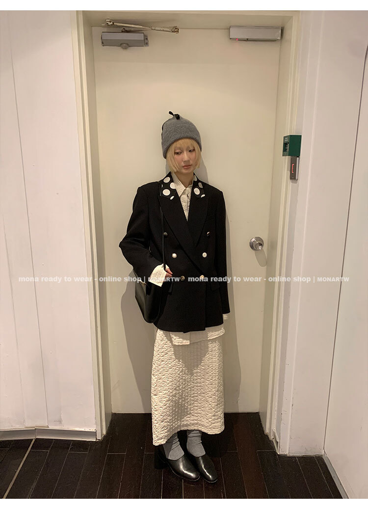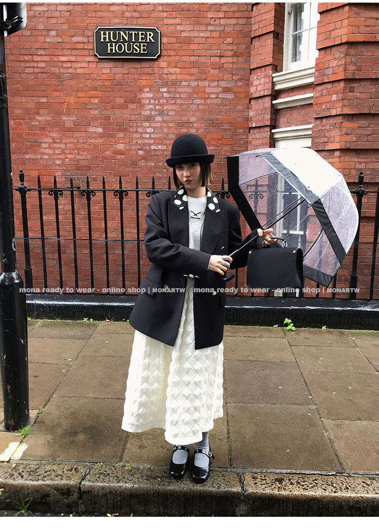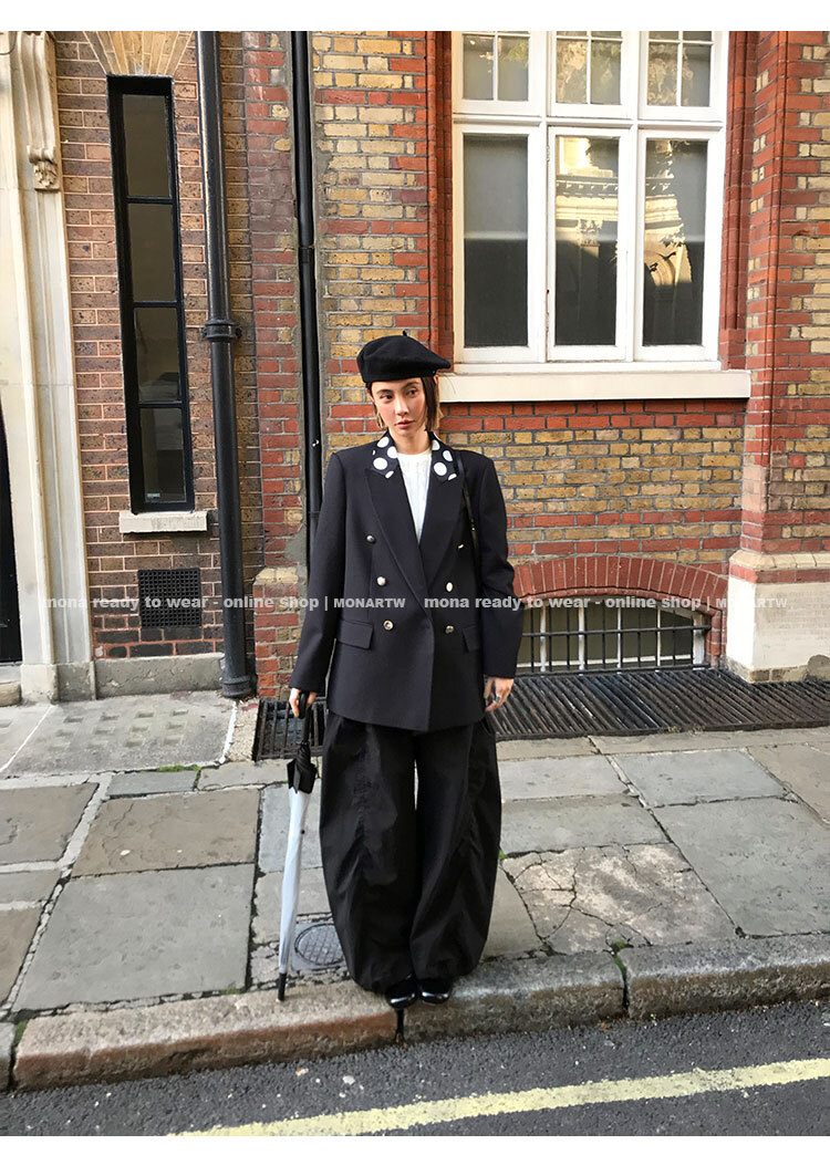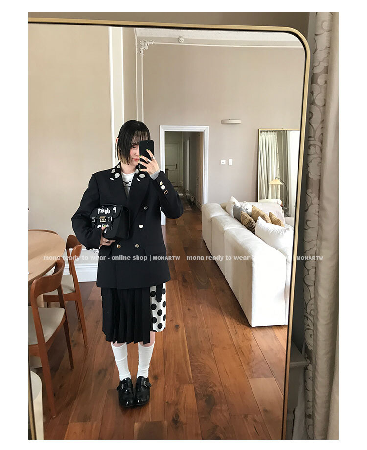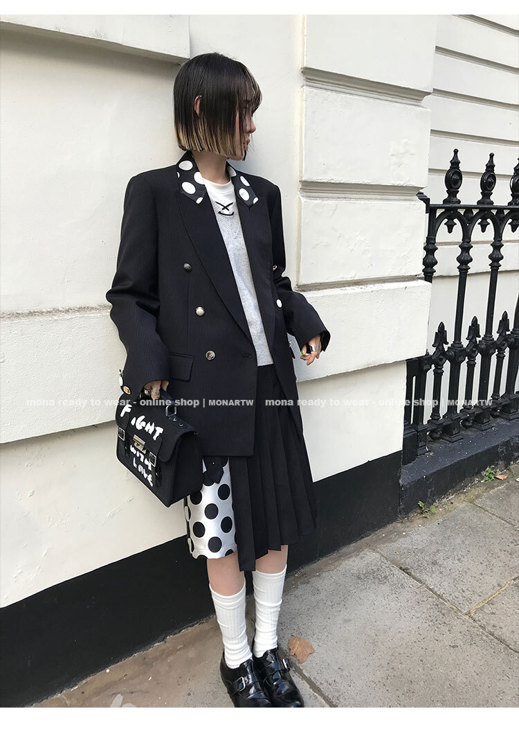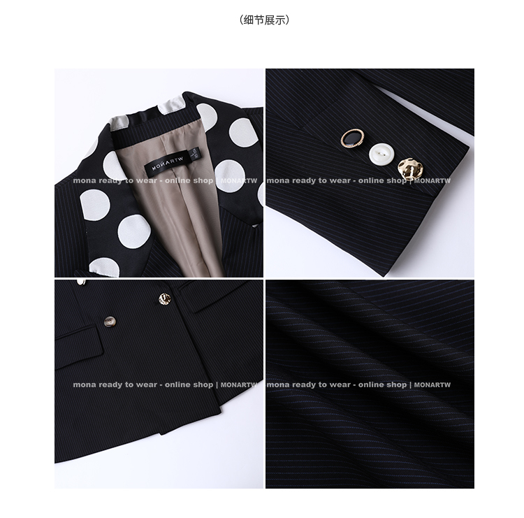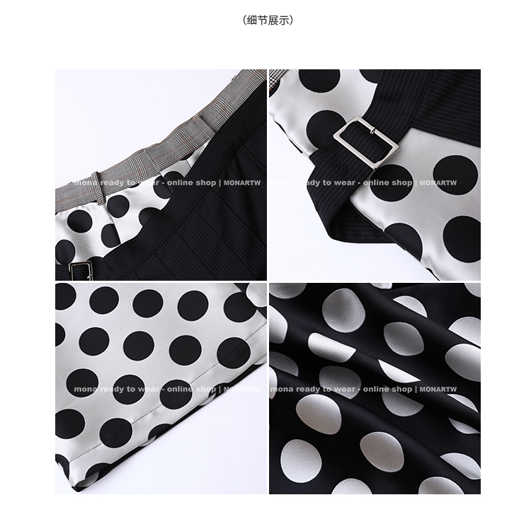 裙褲部分前後片使用客製化圓點提花布料,與領子相呼應