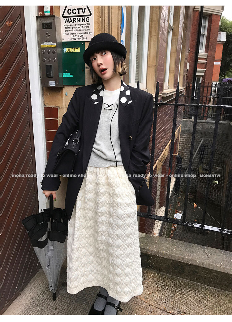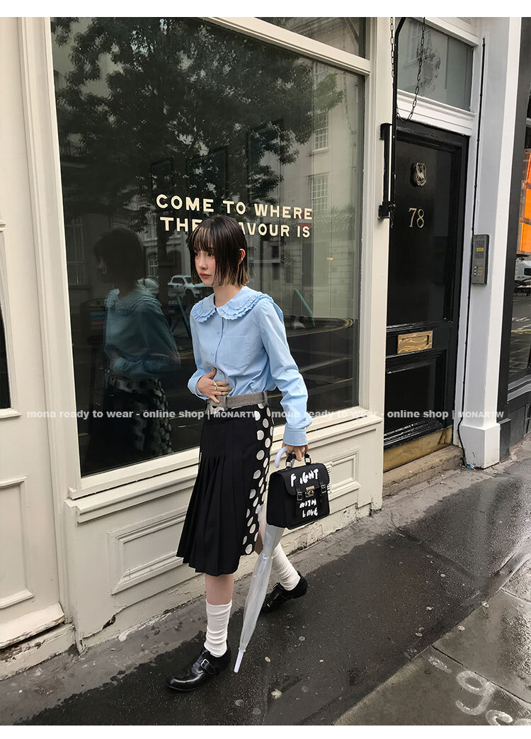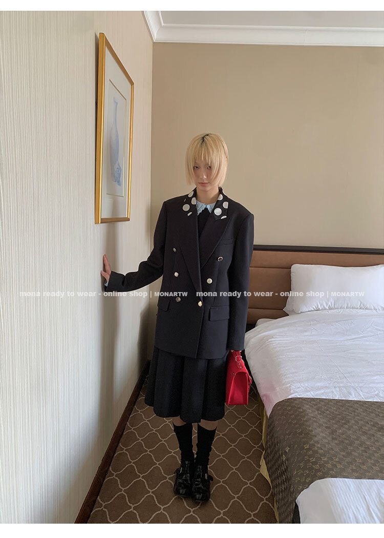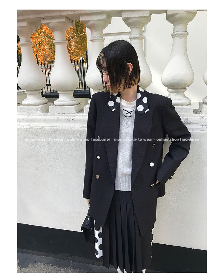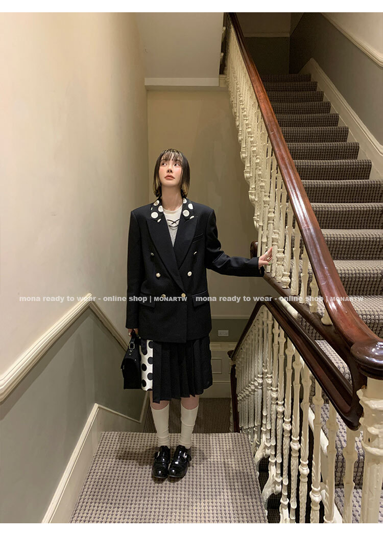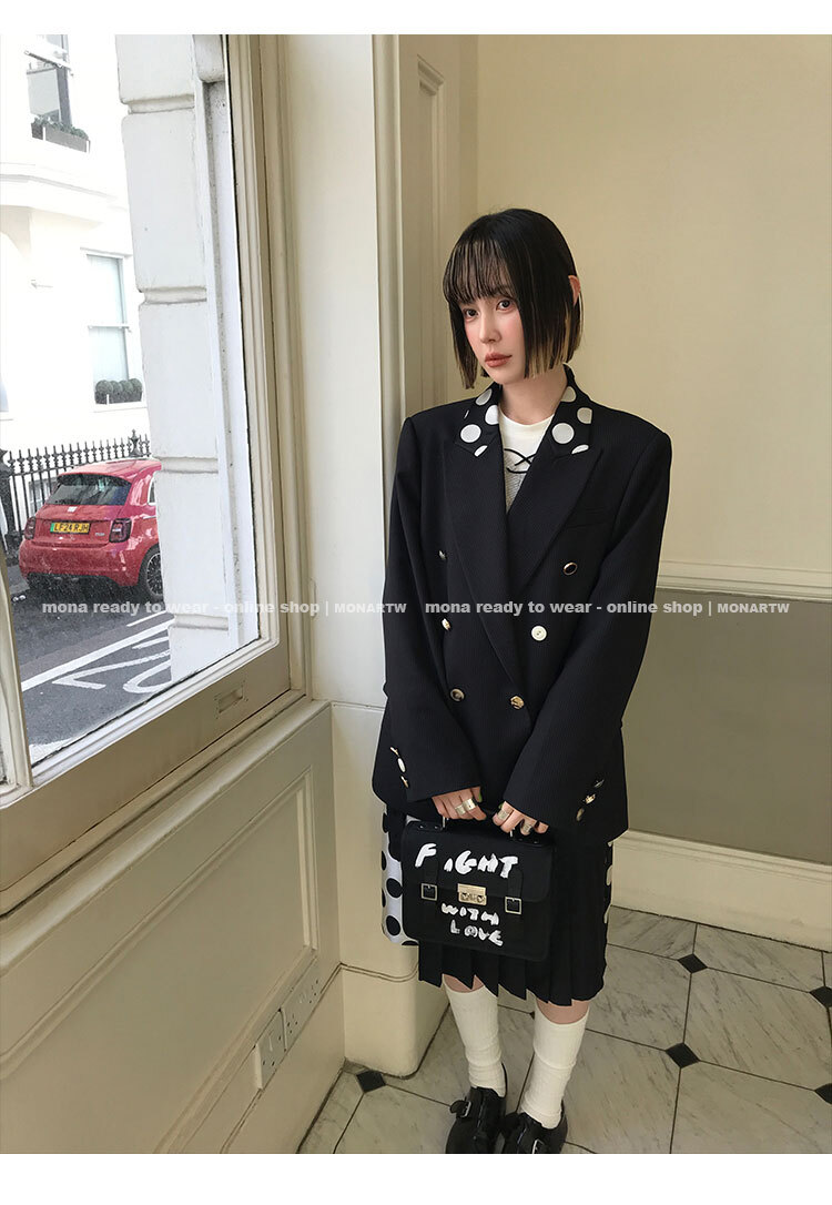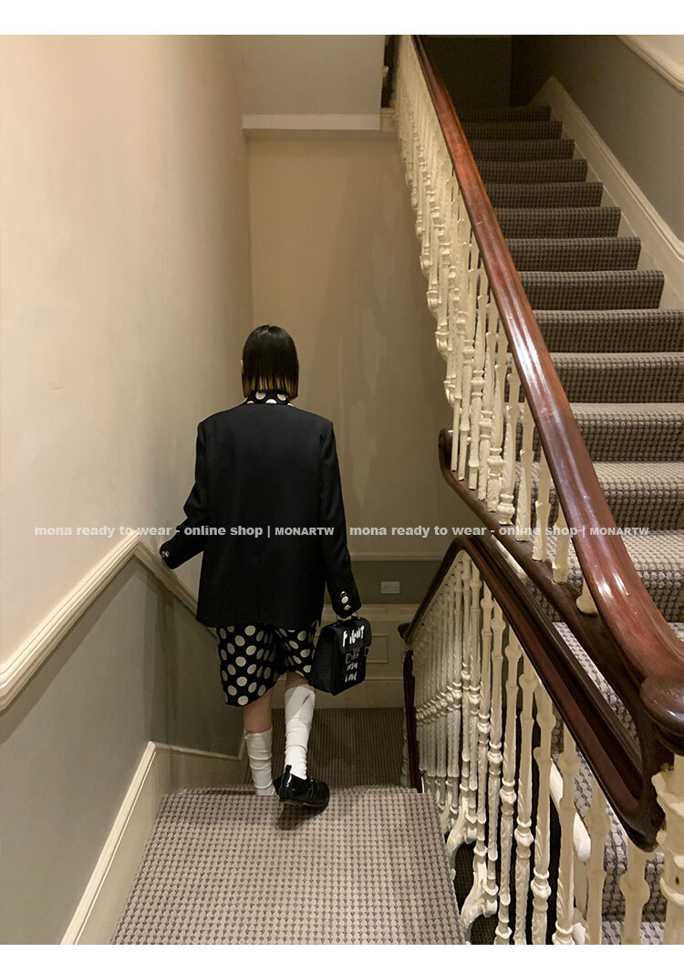 裙褲部分前後片使用客製化圓點提花布料,與領子相呼應