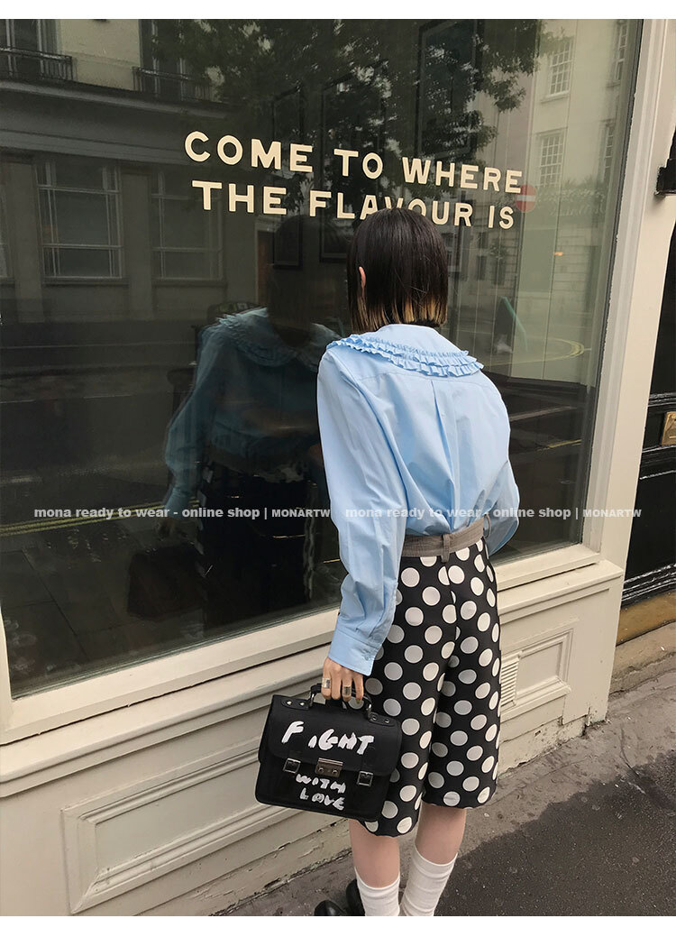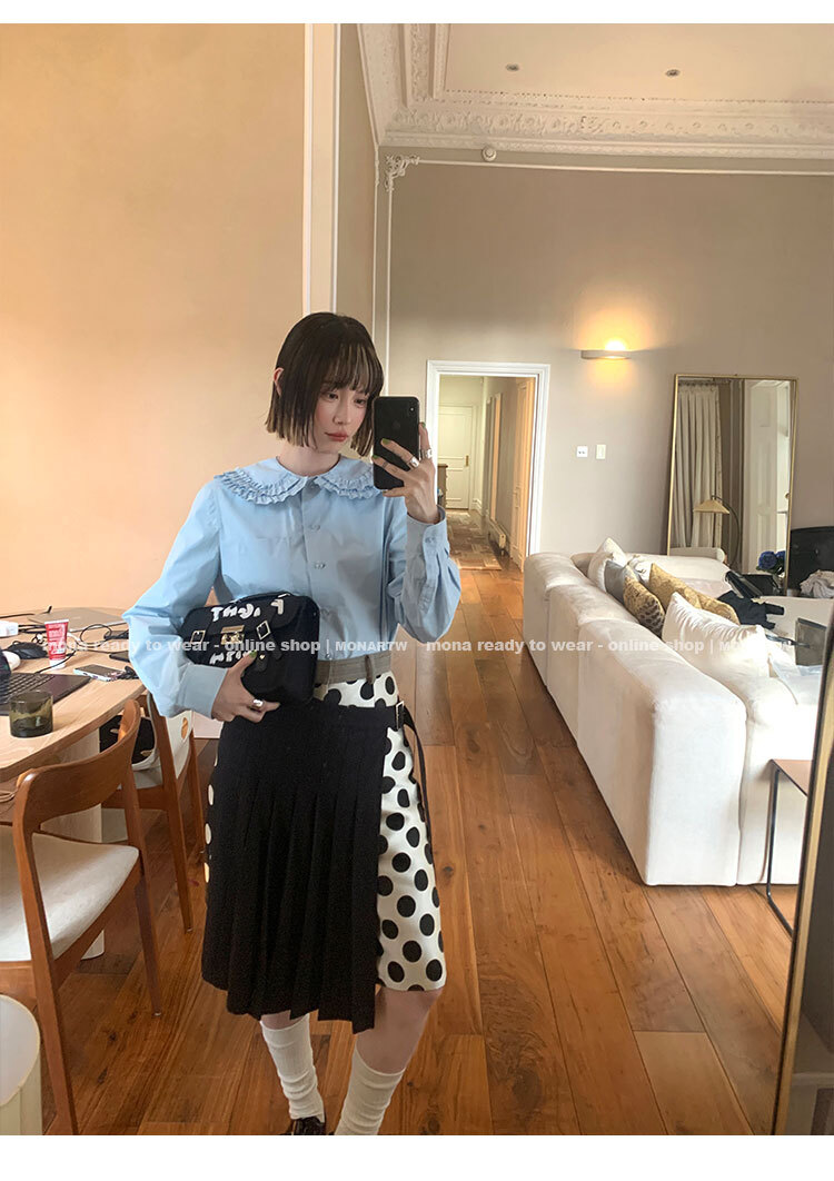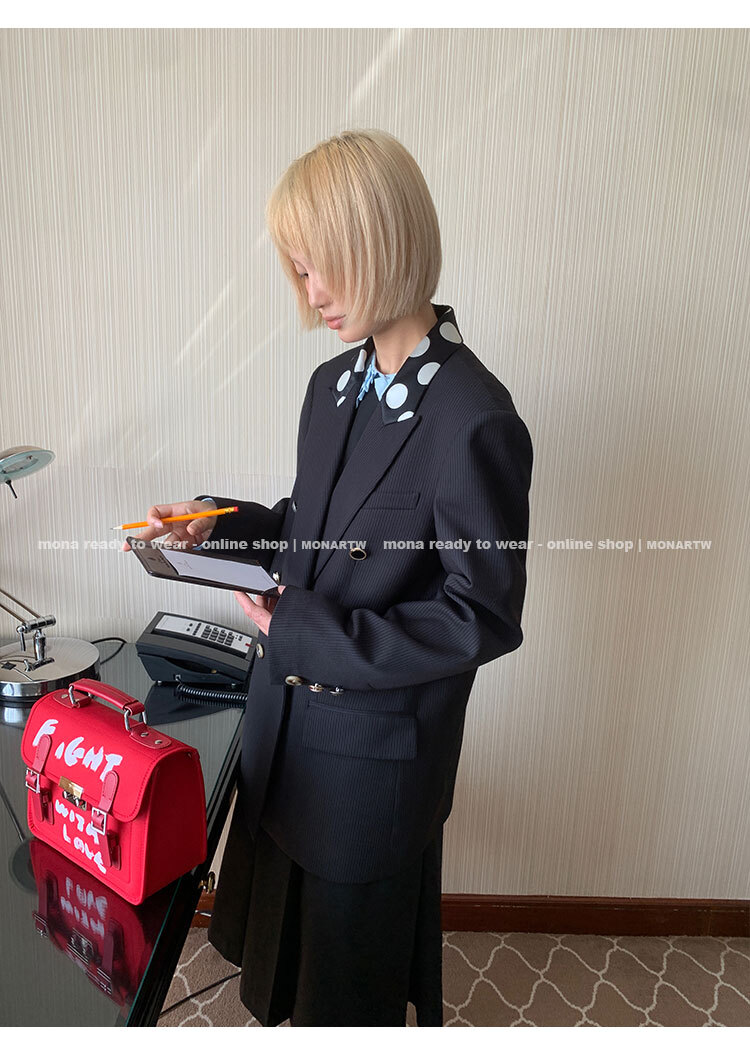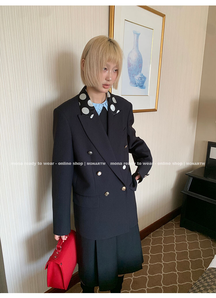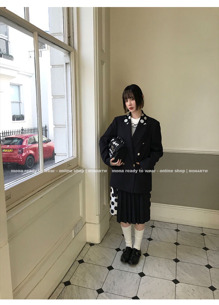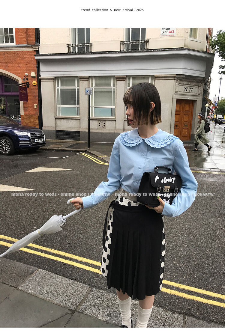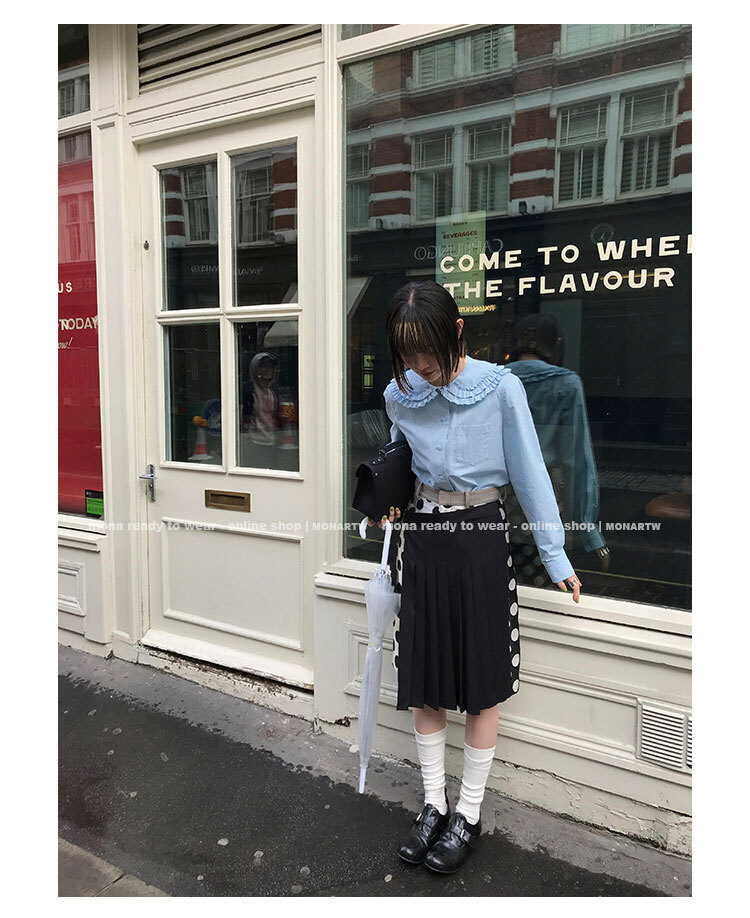 裙褲部分前後片使用客製化圓點提花布料,與領子相呼應