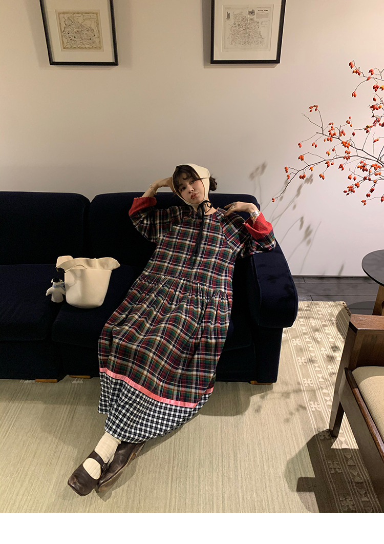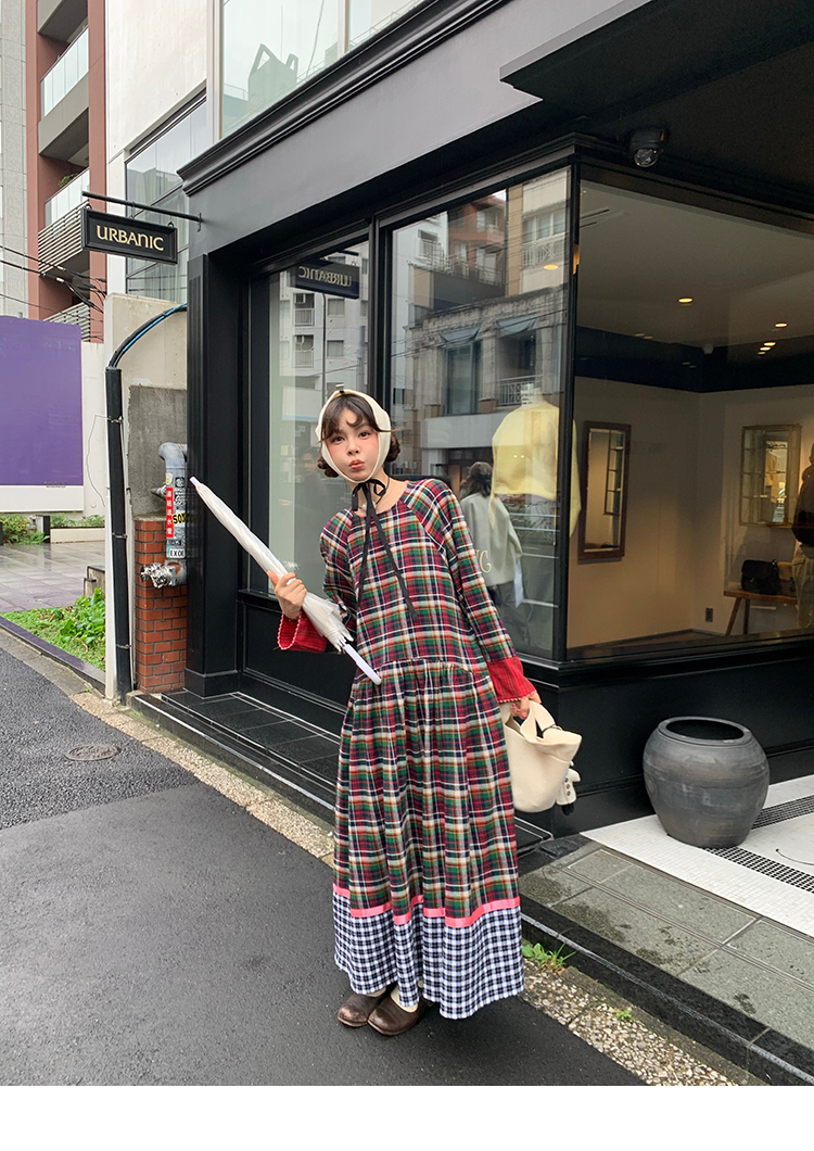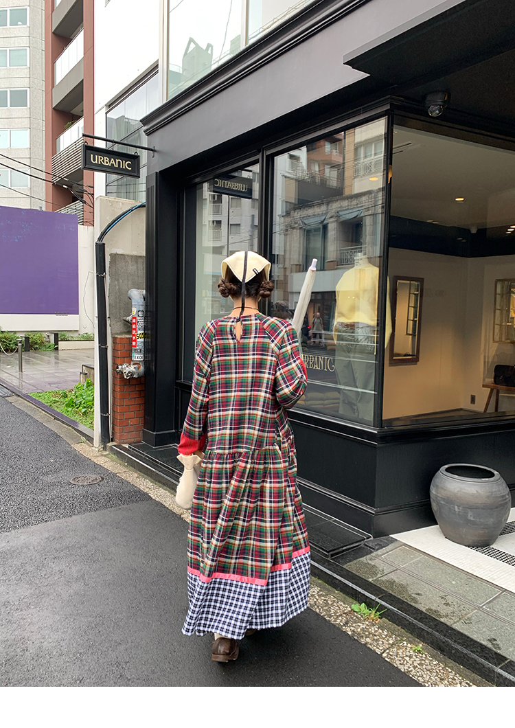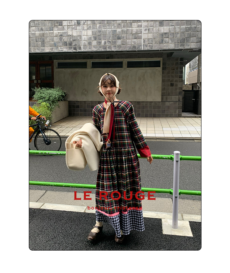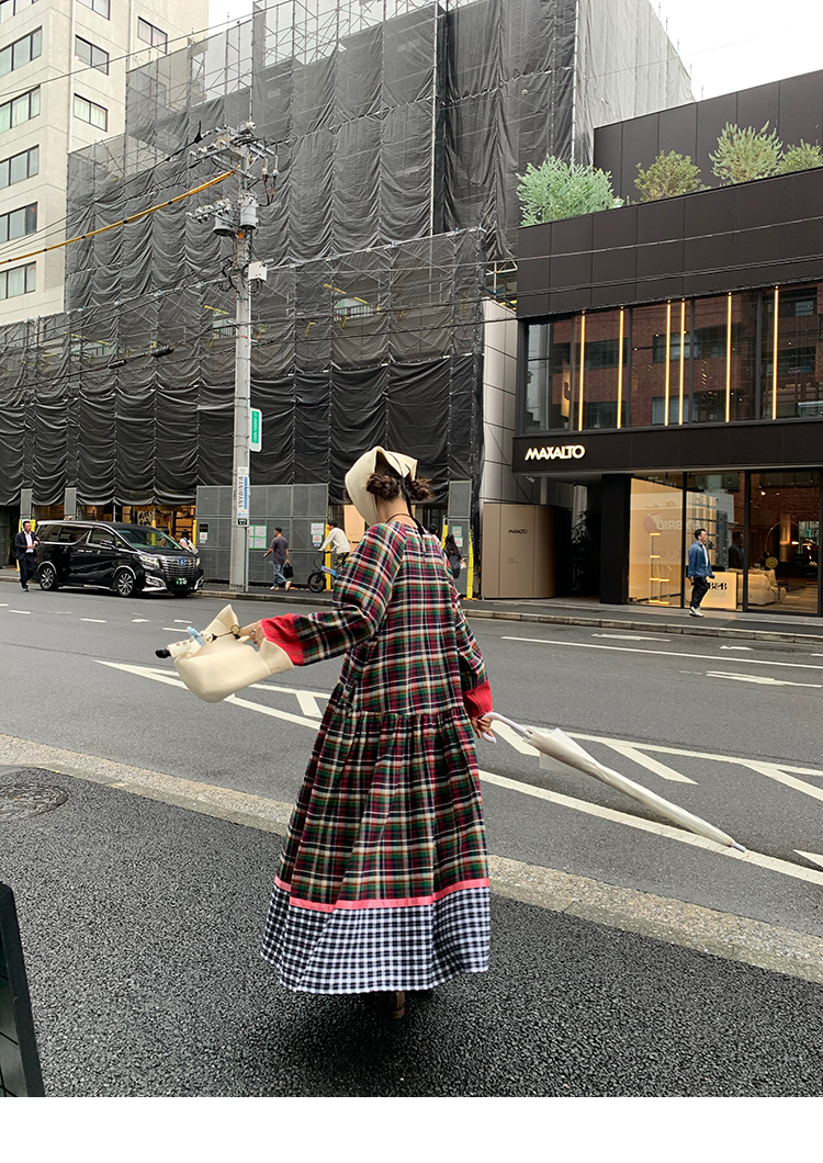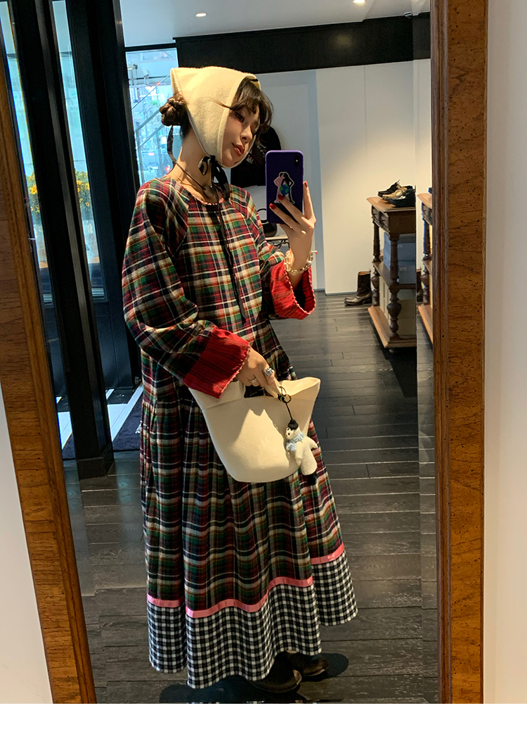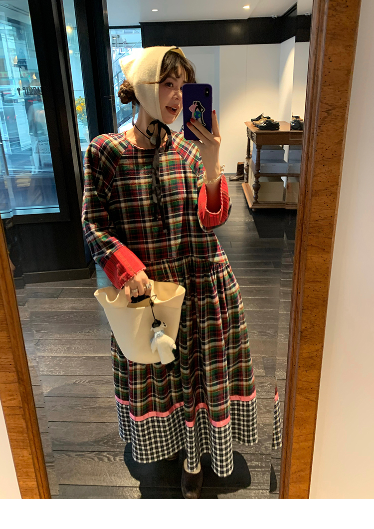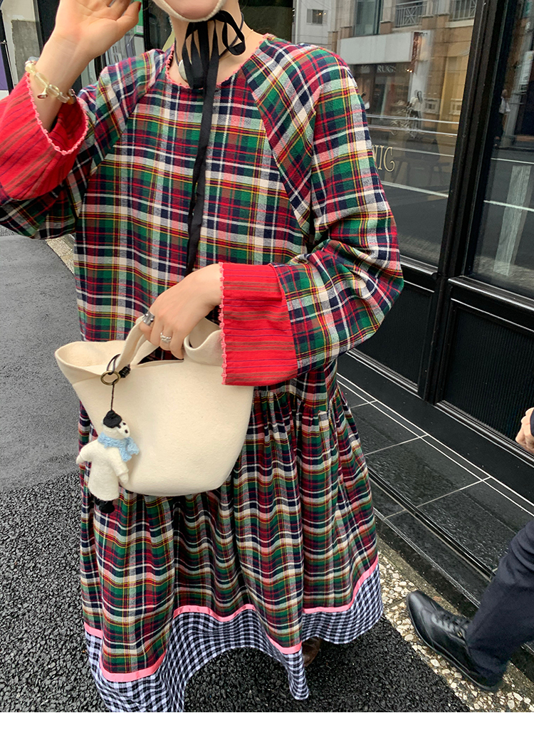 *o-ha-you*【FMNM25Q464】倫敦文藝少女紅綠格拼色曲牙花邊連衣裙長洋裝