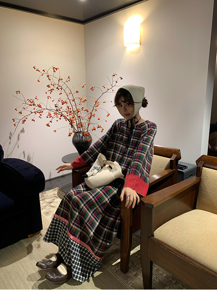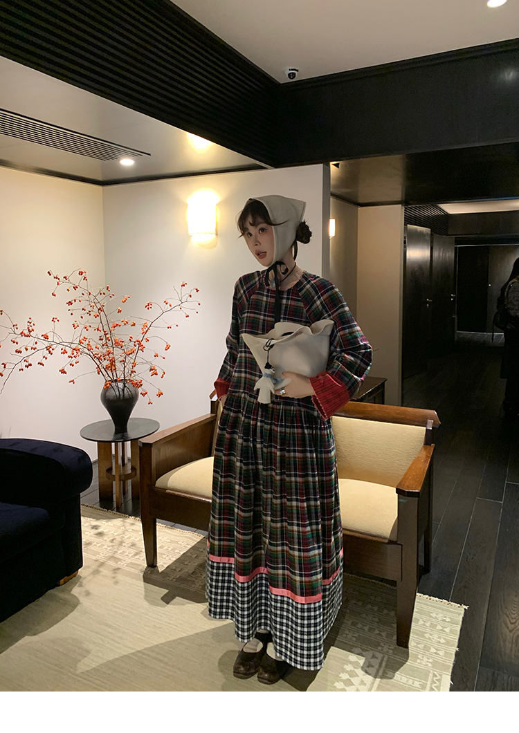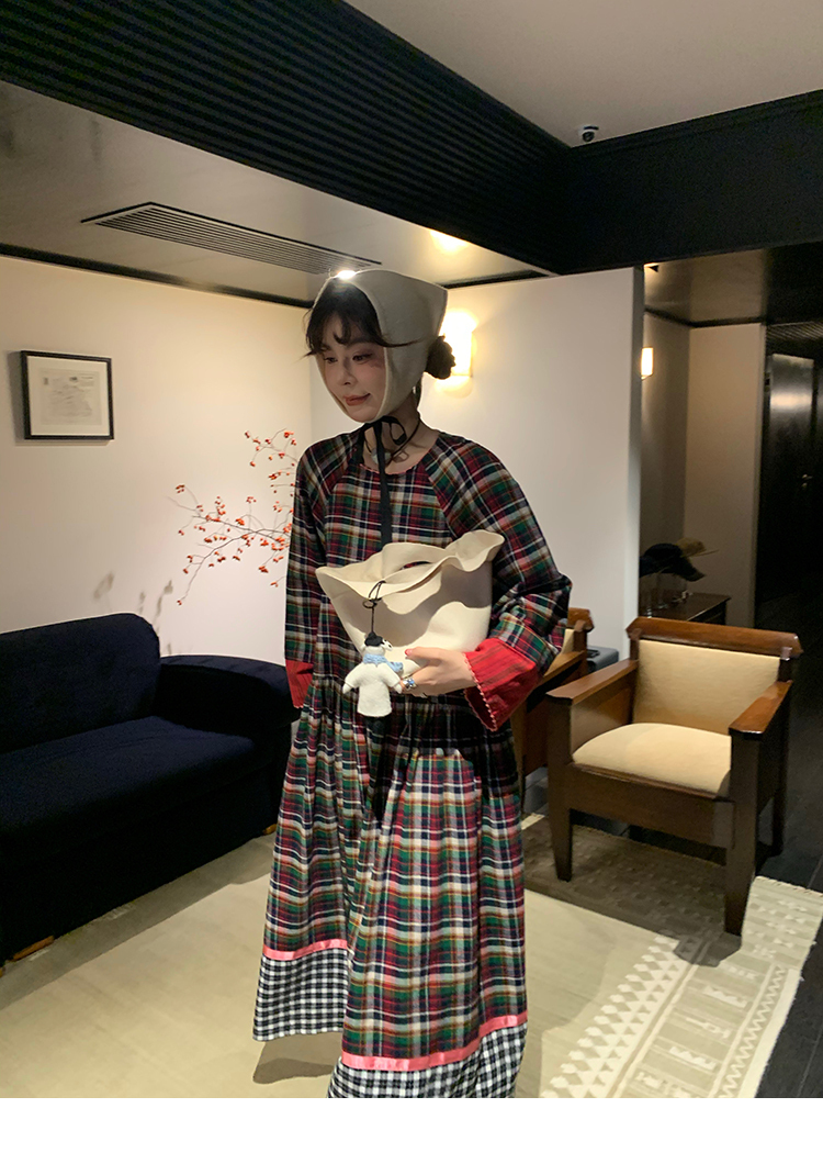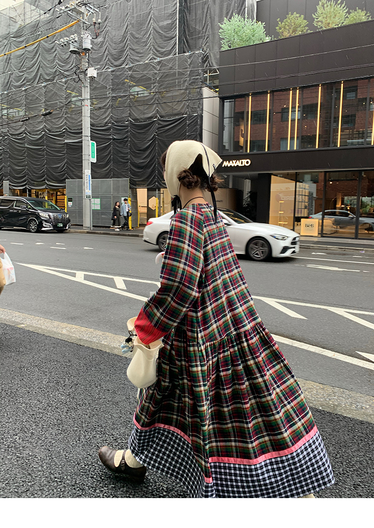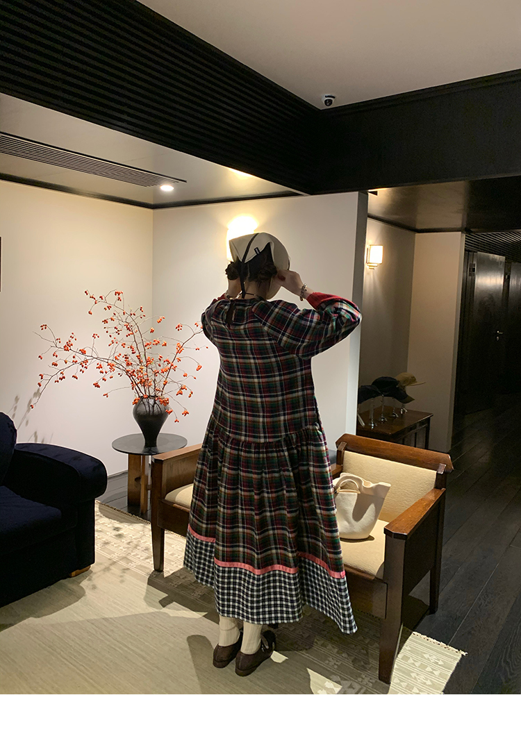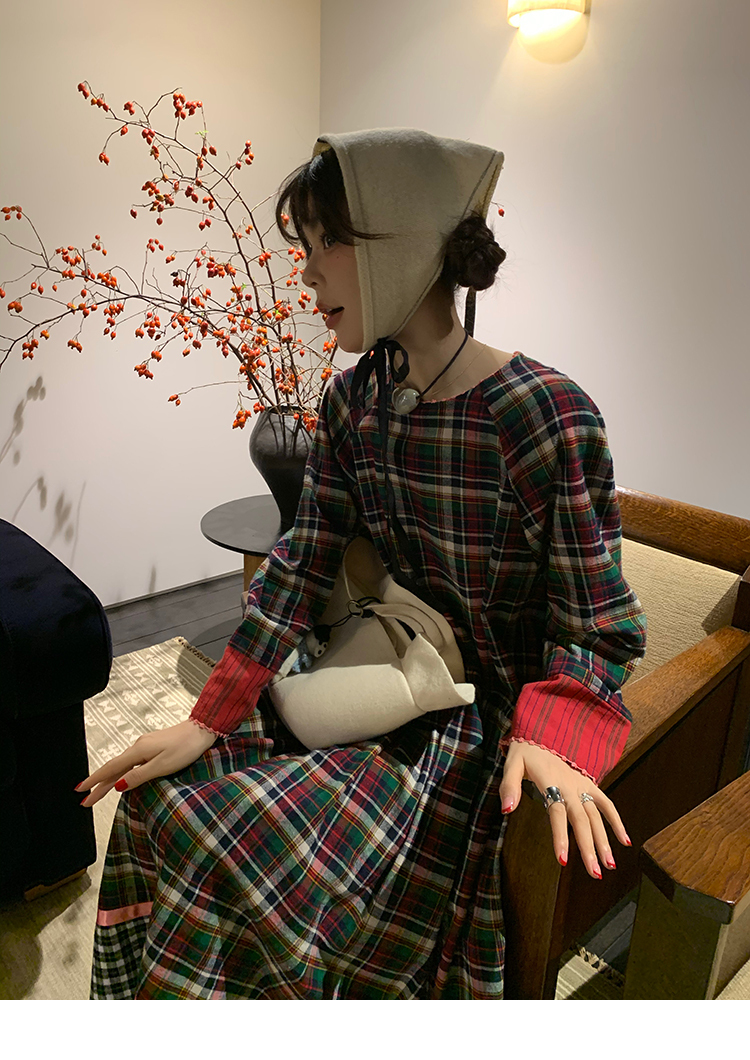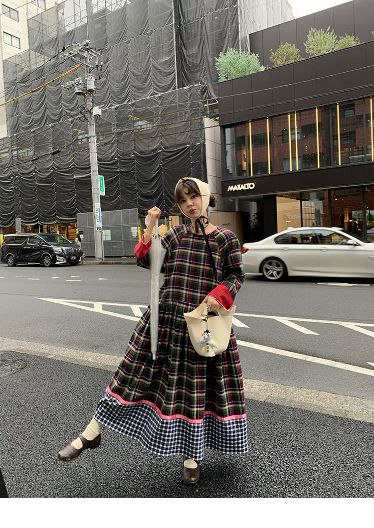 *o-ha-you*【FMNM25Q464】倫敦文藝少女紅綠格拼色曲牙花邊連衣裙長洋裝