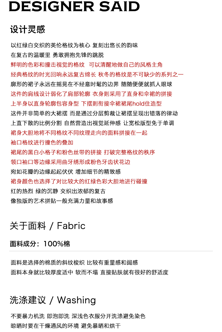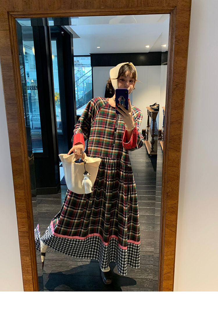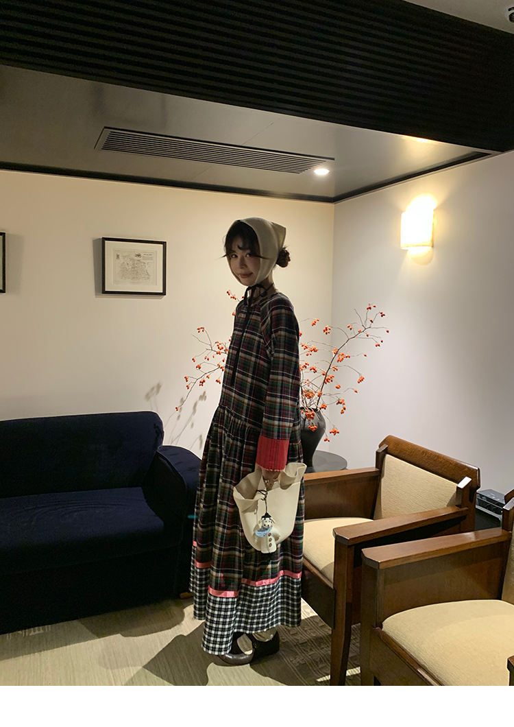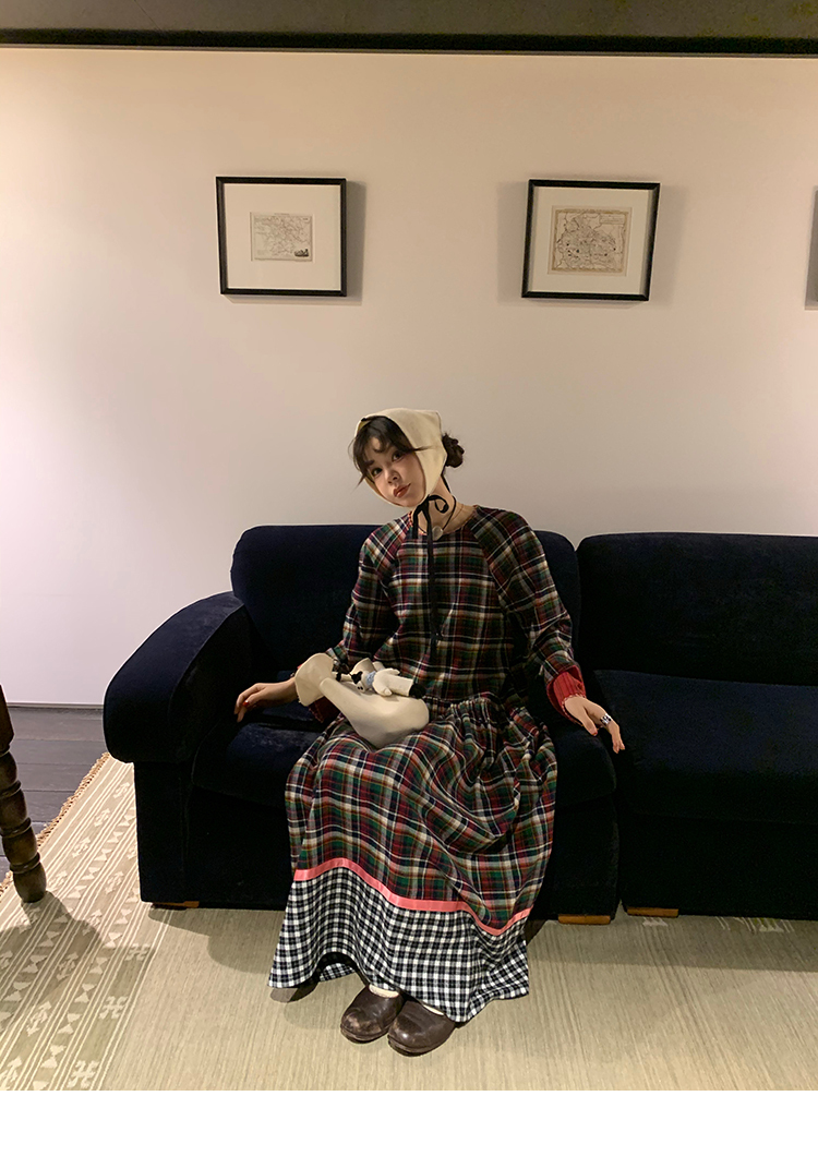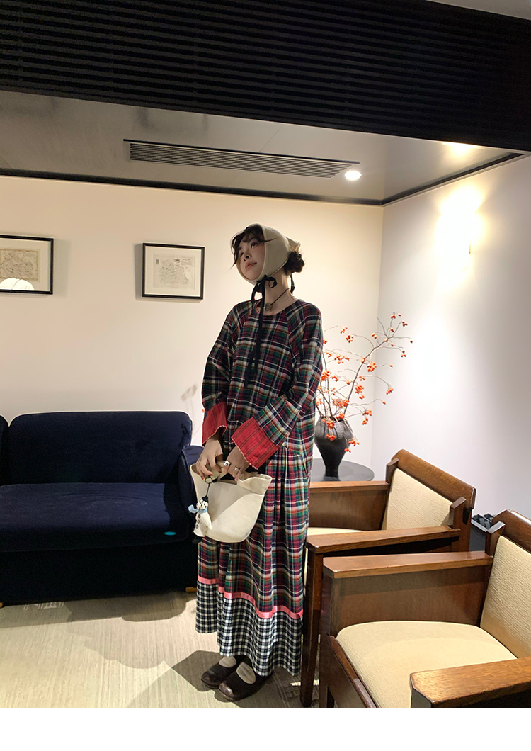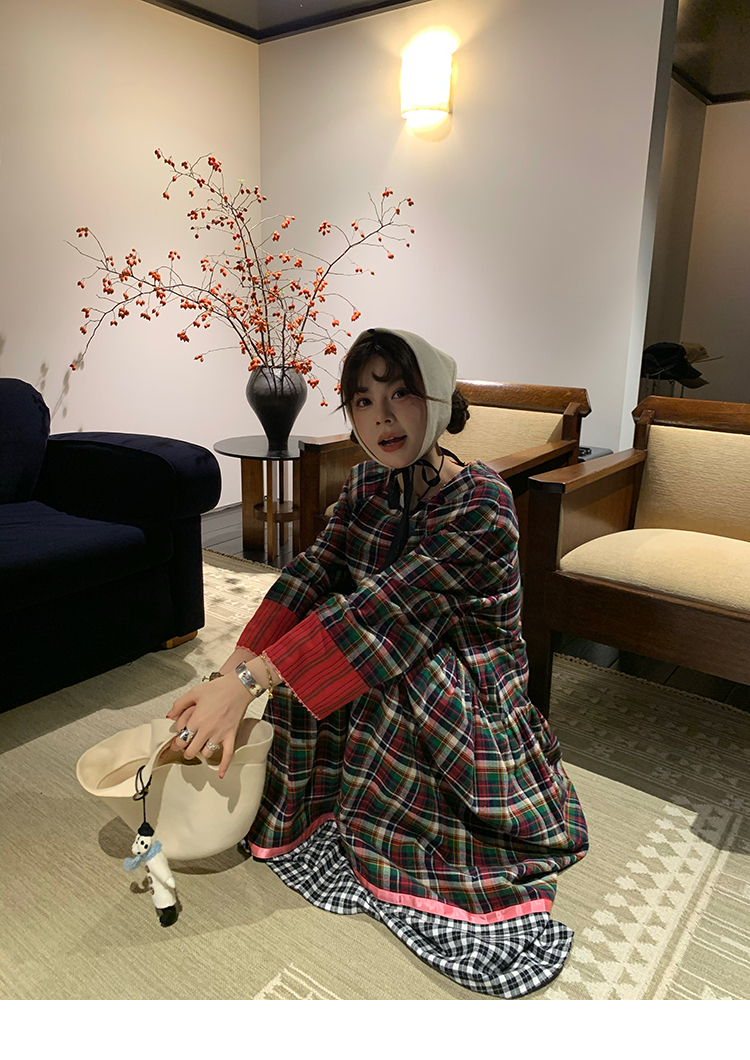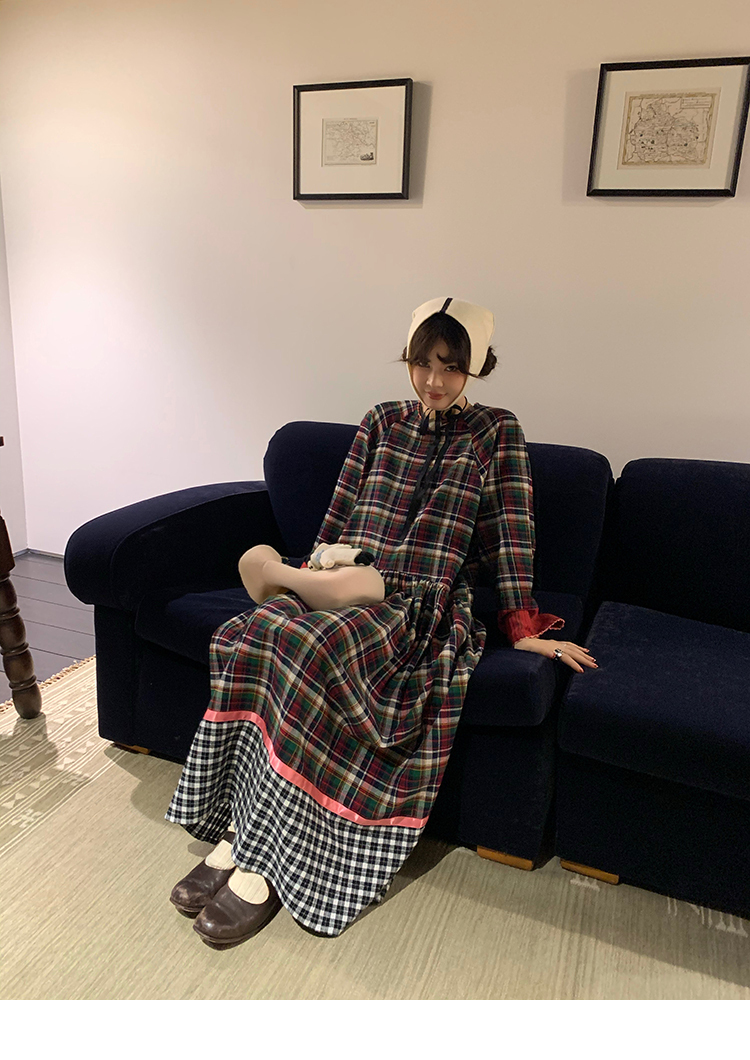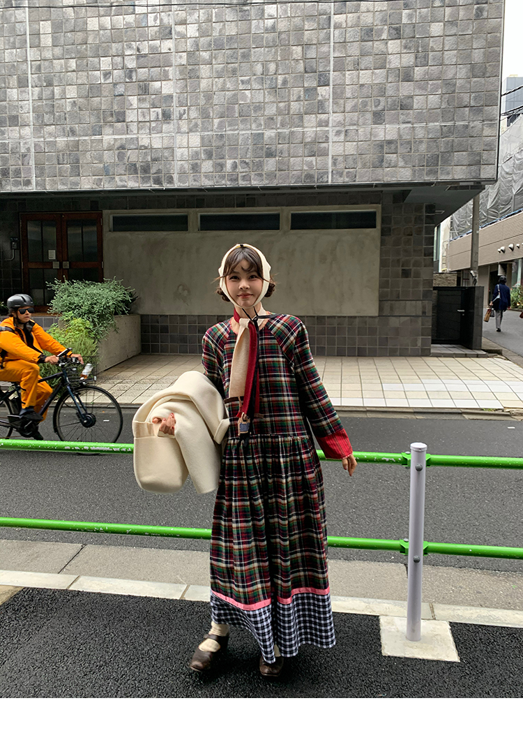 *o-ha-you*【FMNM25Q464】倫敦文藝少女紅綠格拼色曲牙花邊連衣裙長洋裝