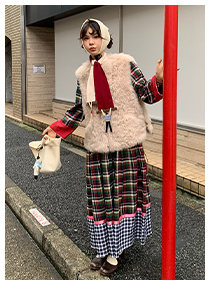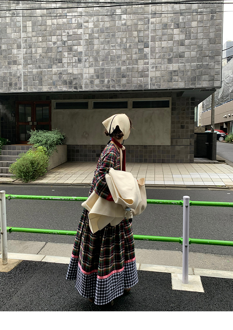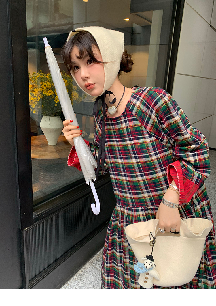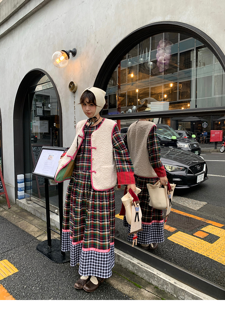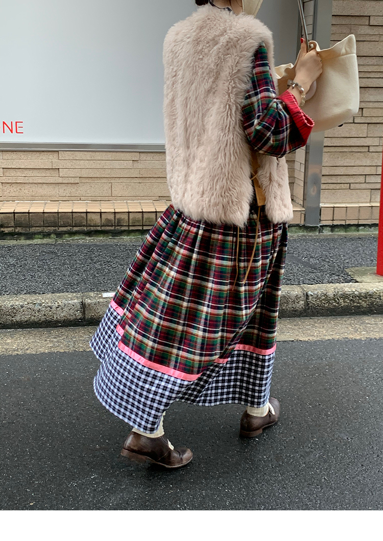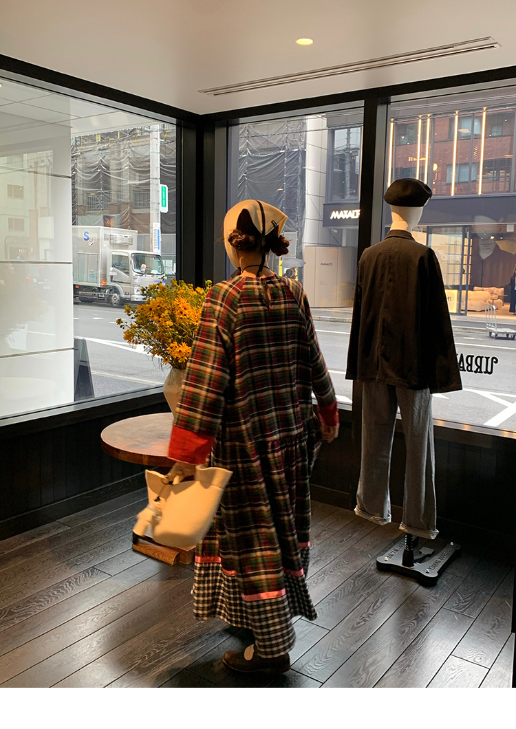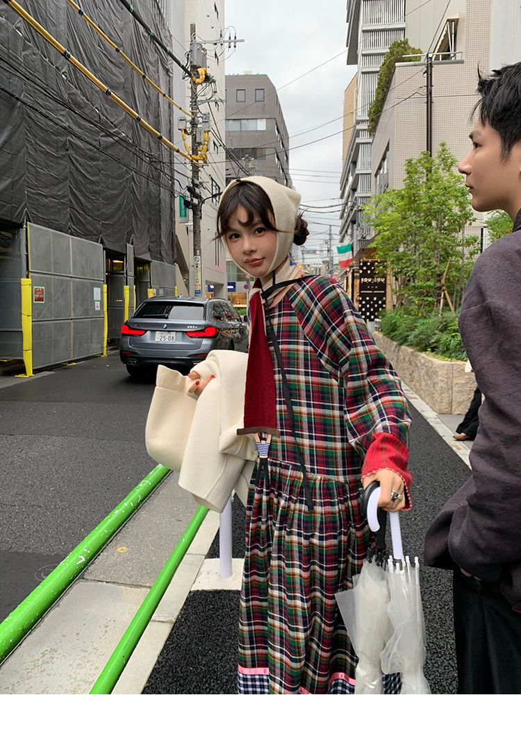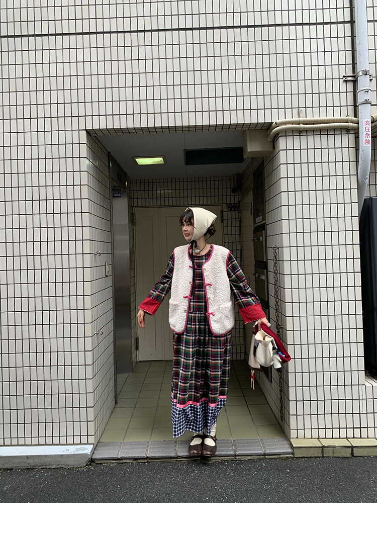 *o-ha-you*【FMNM25Q464】倫敦文藝少女紅綠格拼色曲牙花邊連衣裙長洋裝