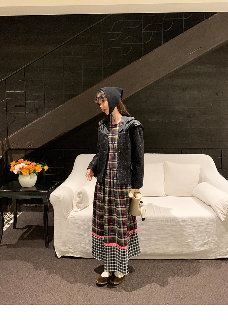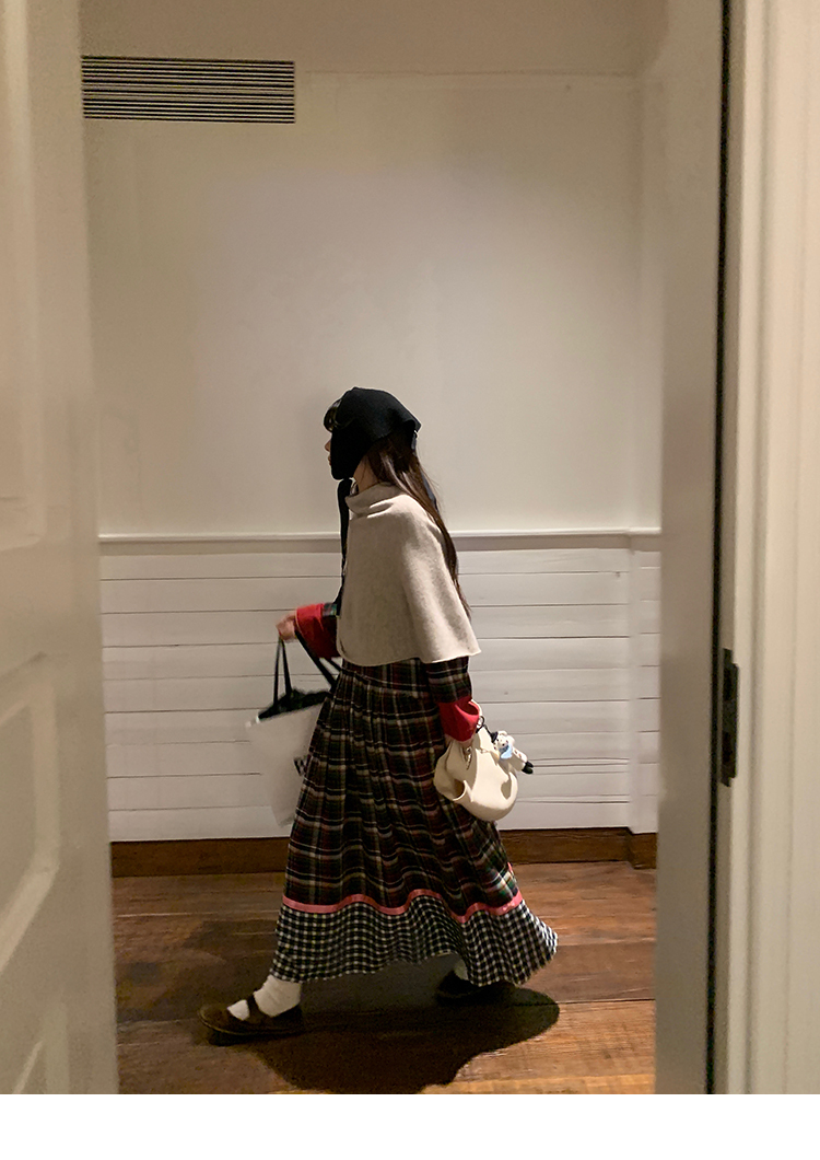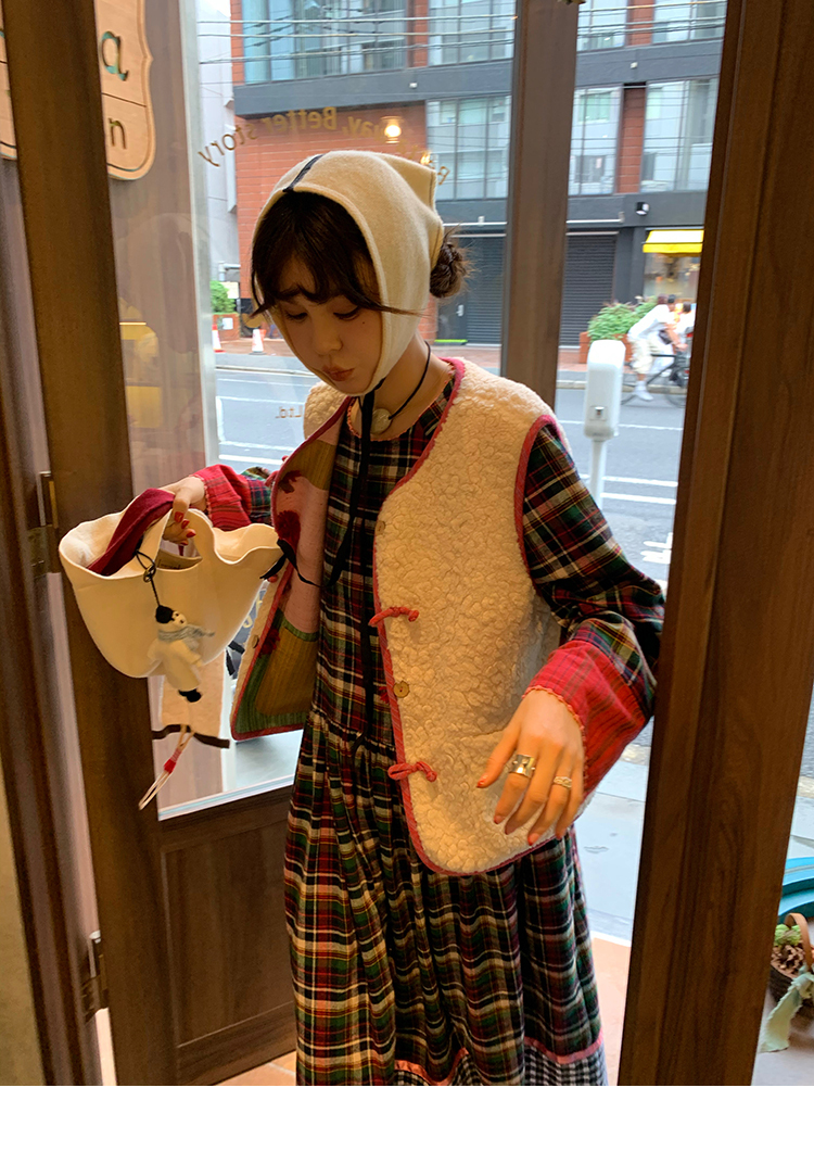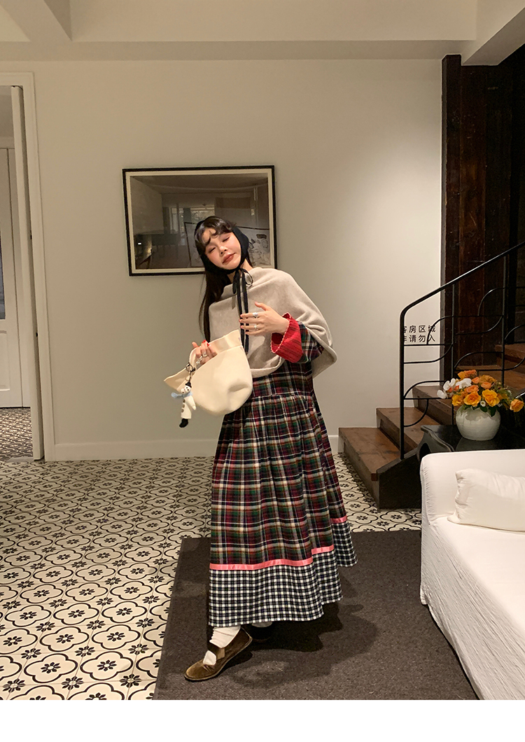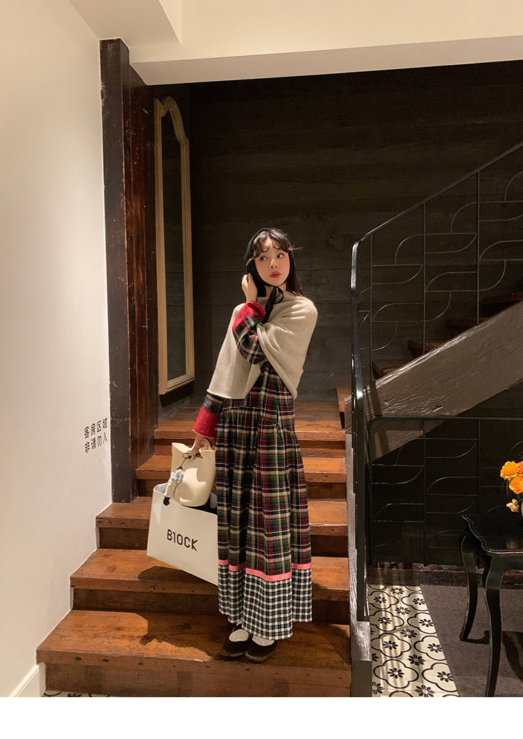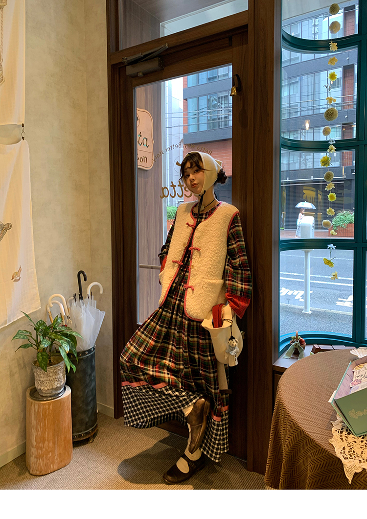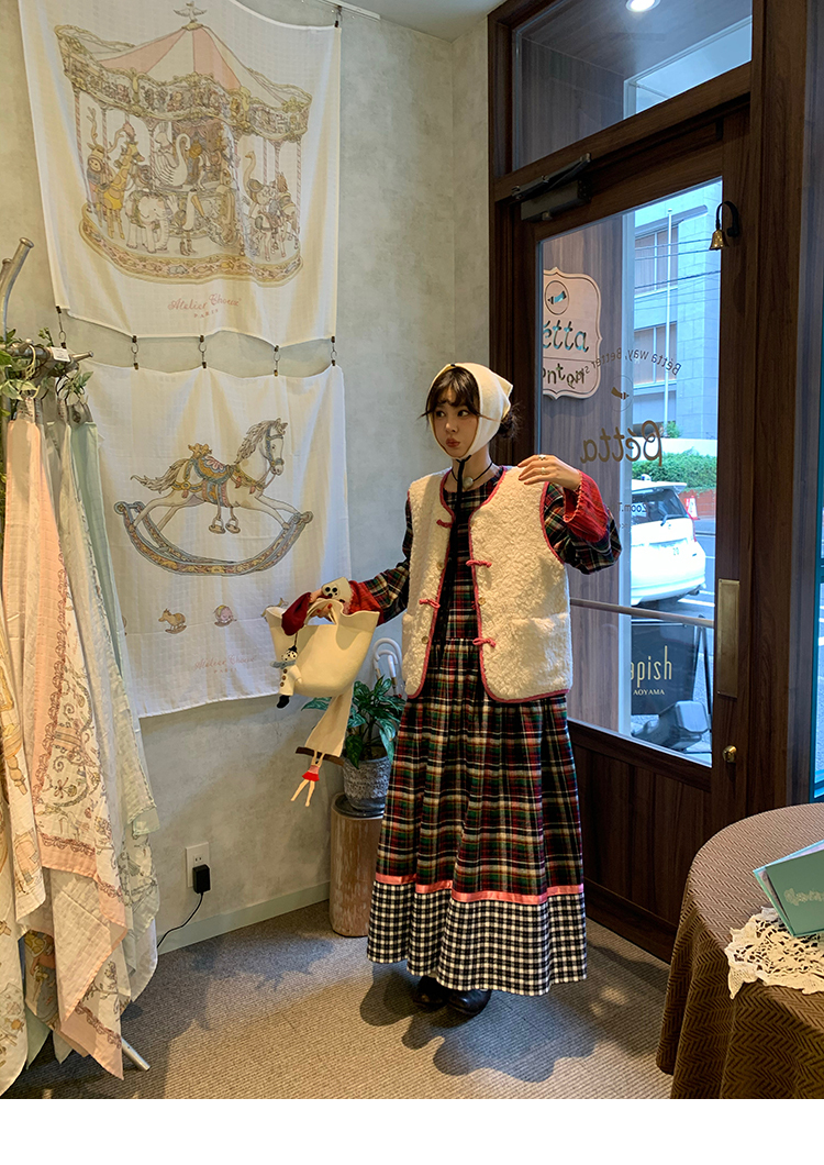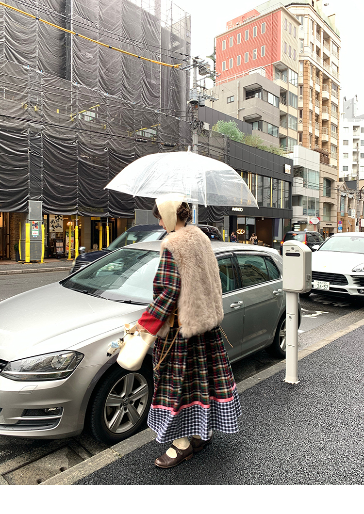*o-ha-you*【FMNM25Q464】倫敦文藝少女紅綠格拼色曲牙花邊連衣裙長洋裝
