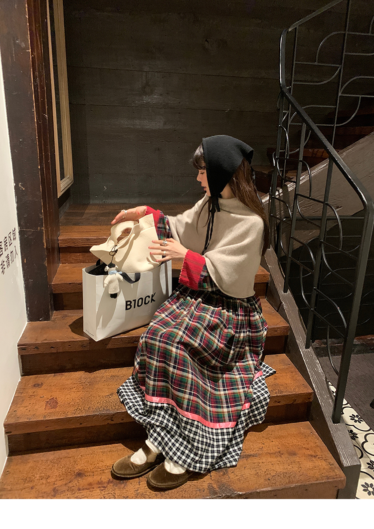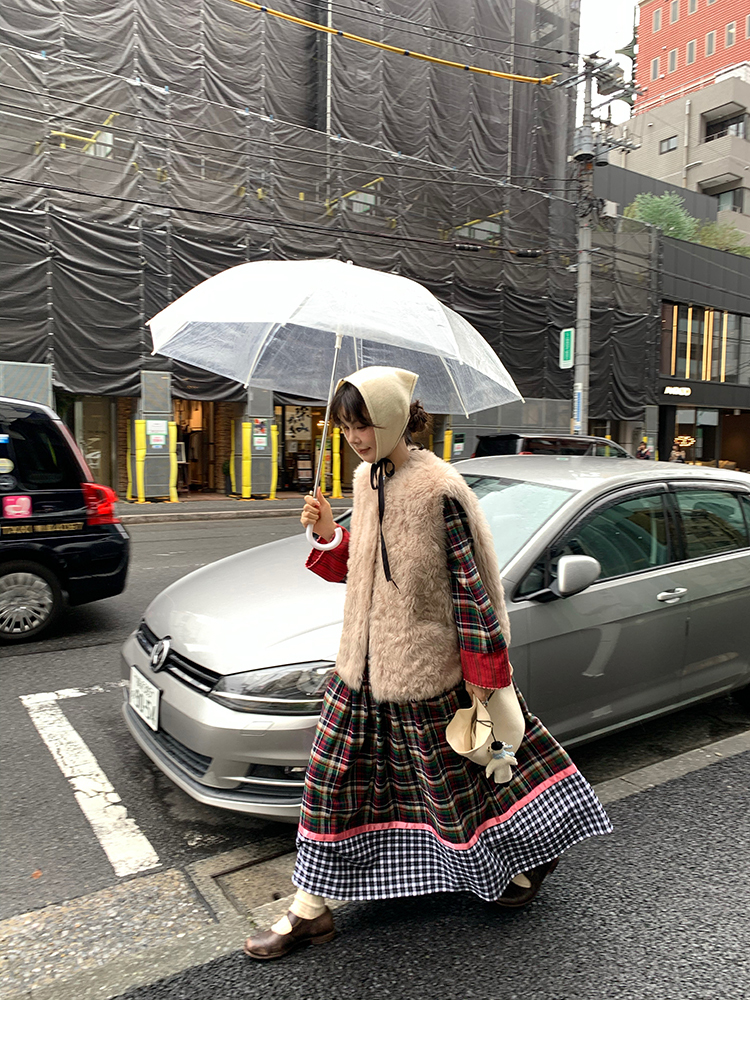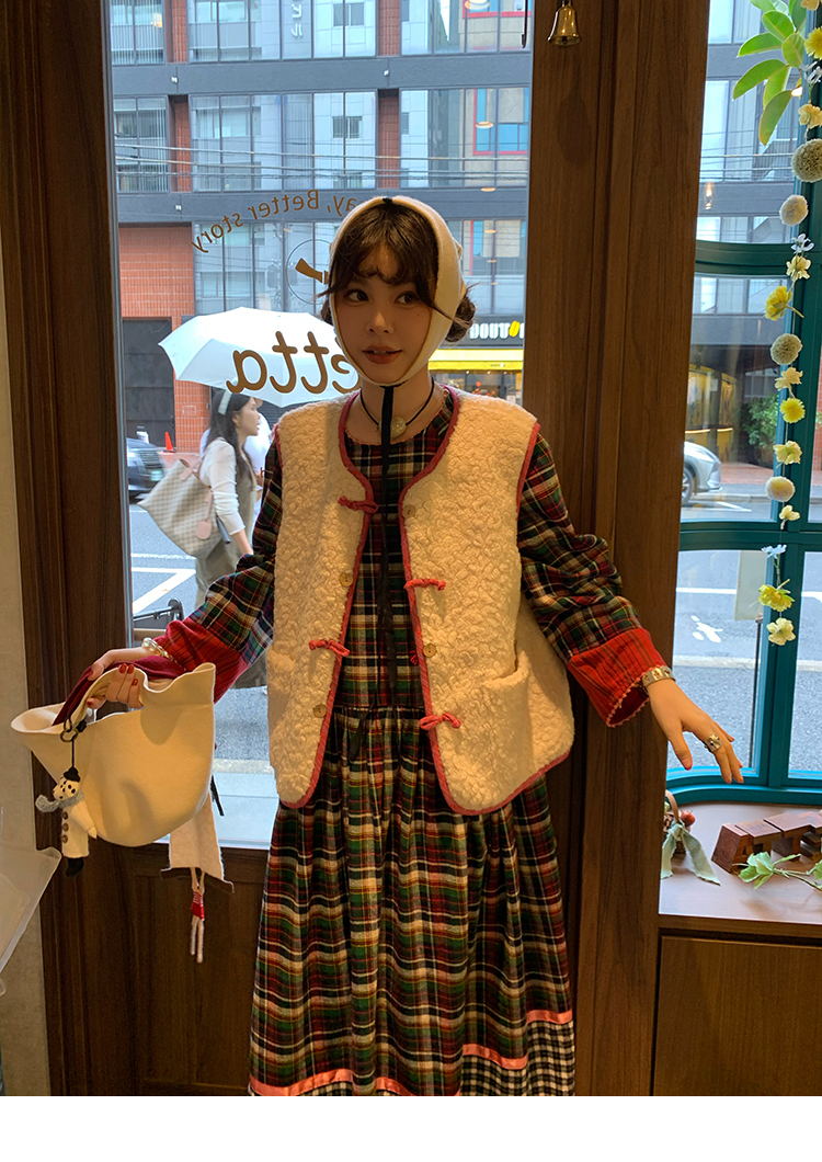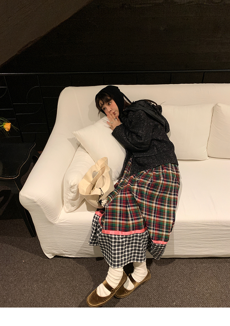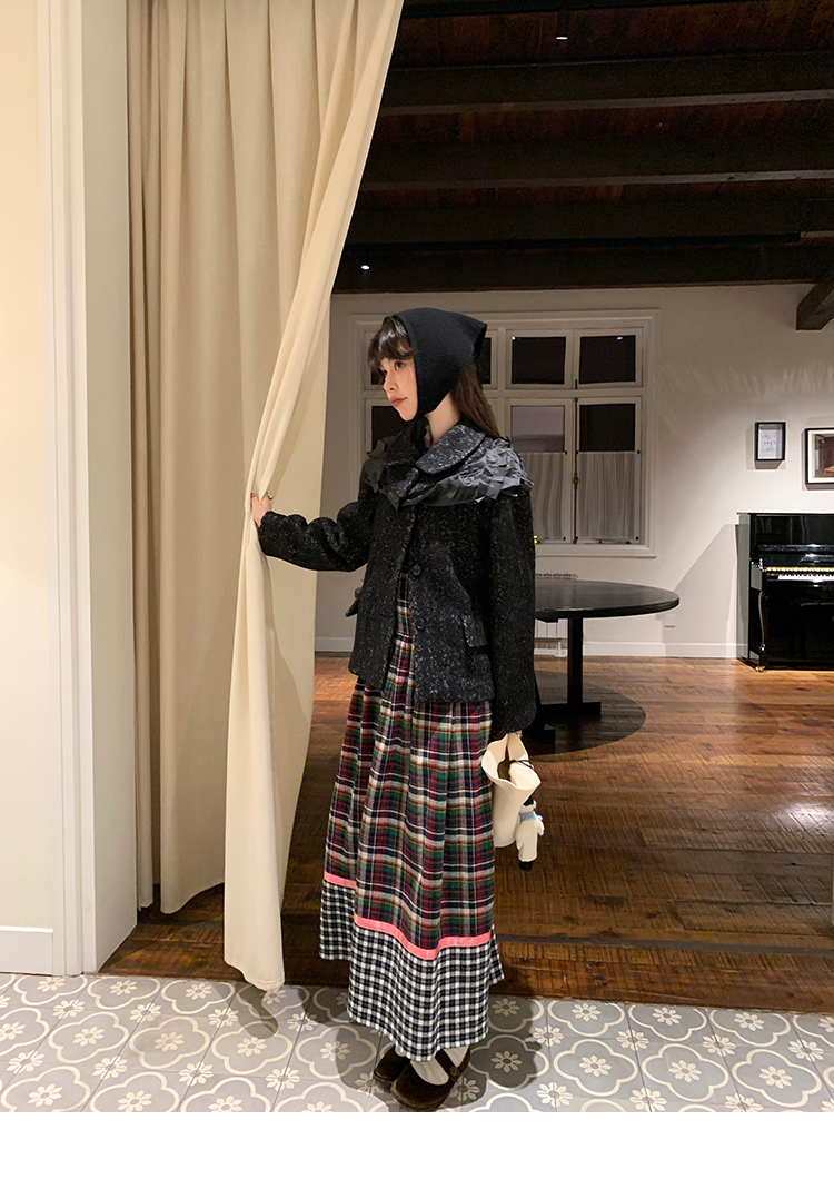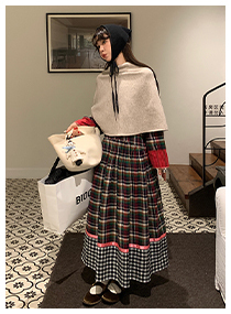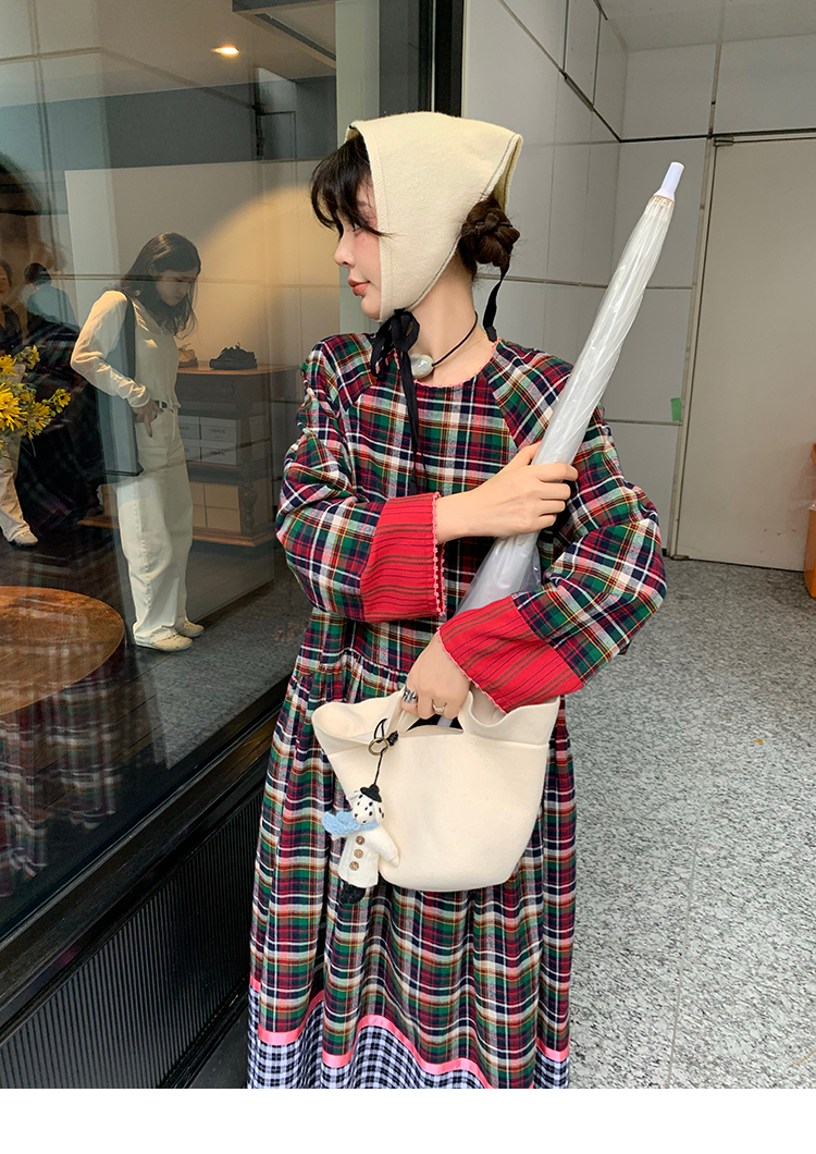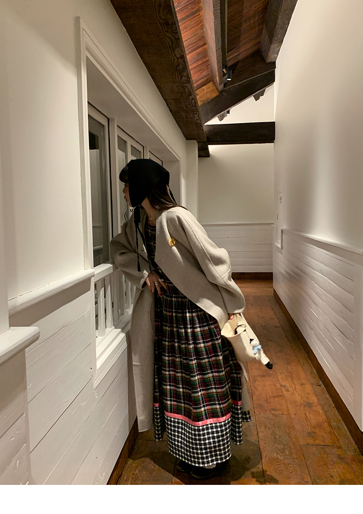 *o-ha-you*【FMNM25Q464】倫敦文藝少女紅綠格拼色曲牙花邊連衣裙長洋裝