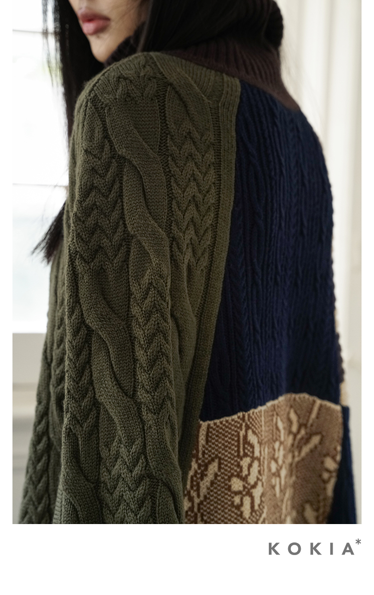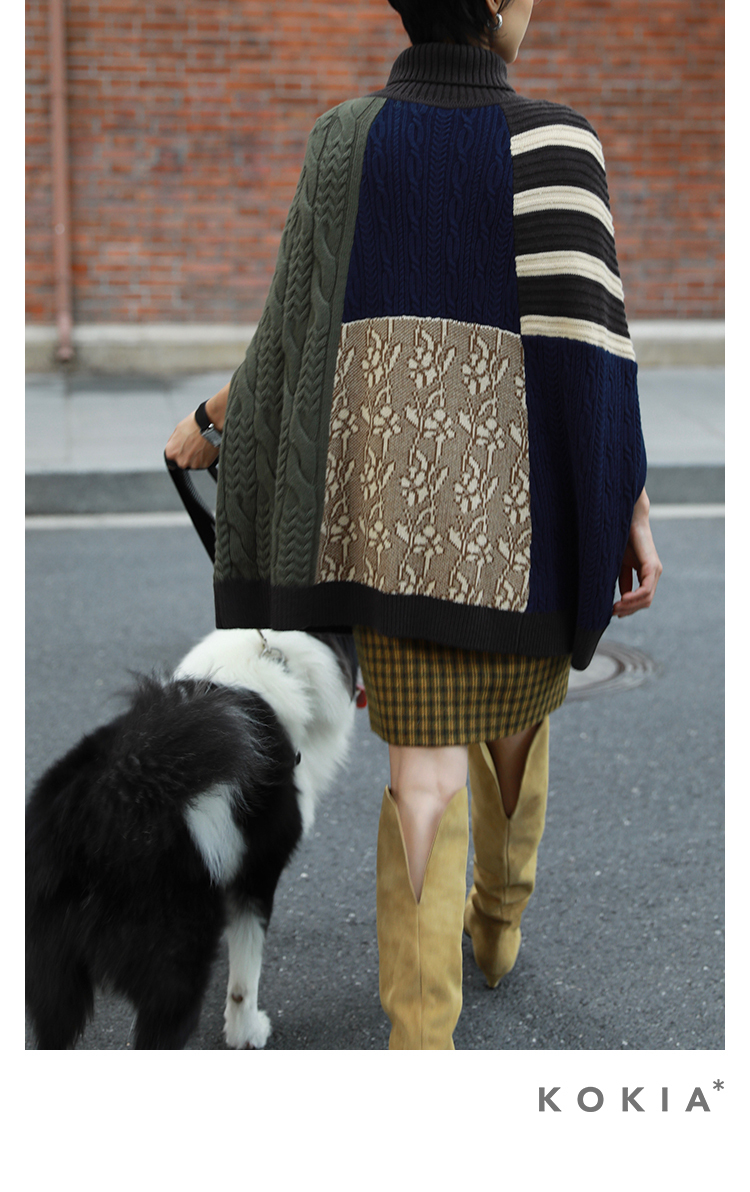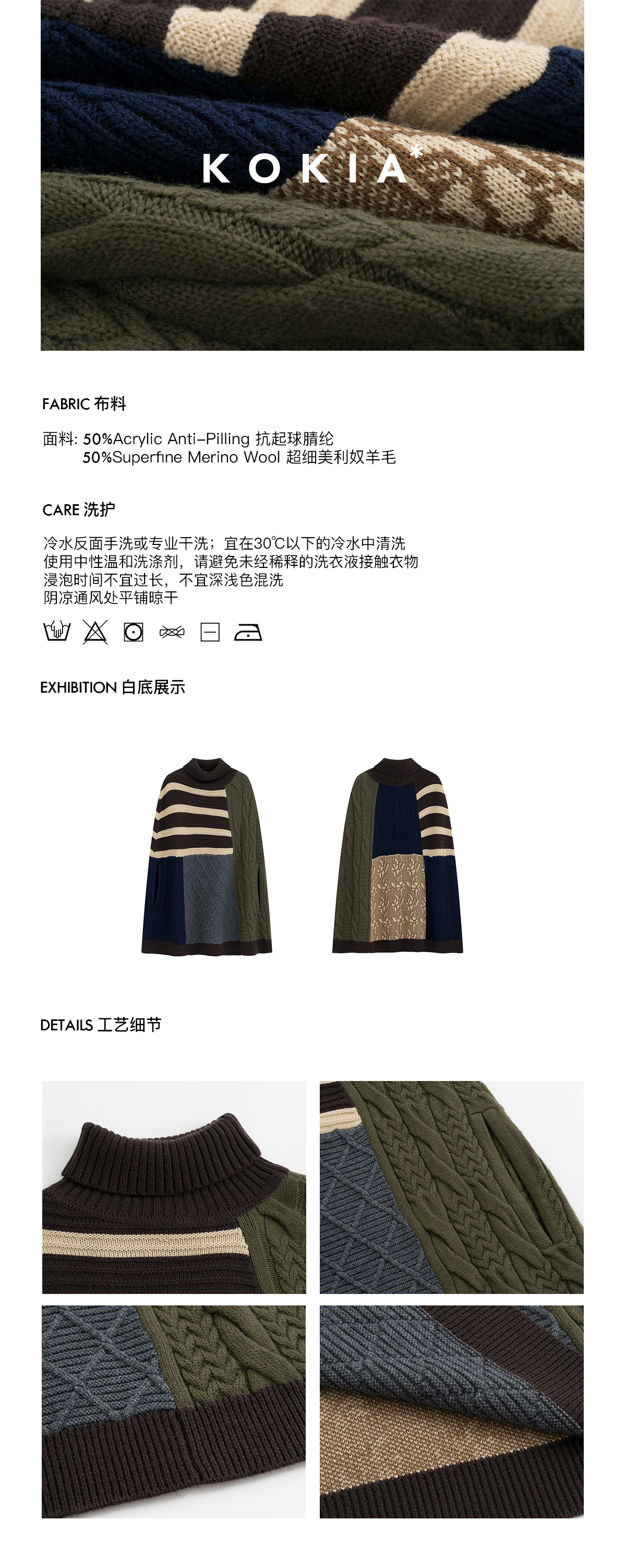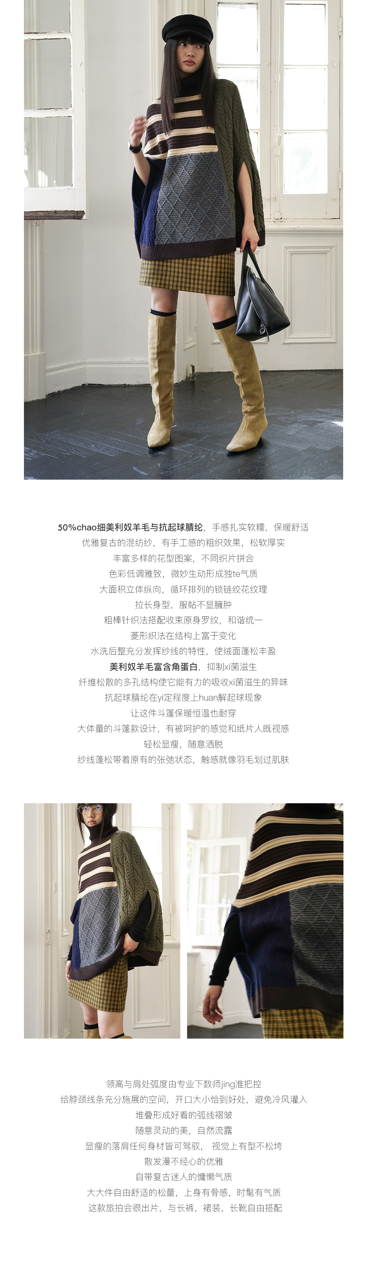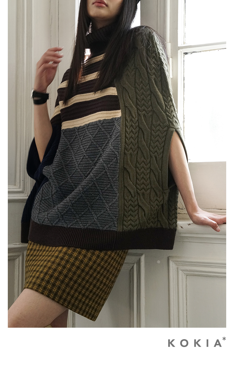 *o-ha-you*【FMNW338】重工Merino羊毛絞花菱格麻花提花拼色高領斗篷毛衣外套