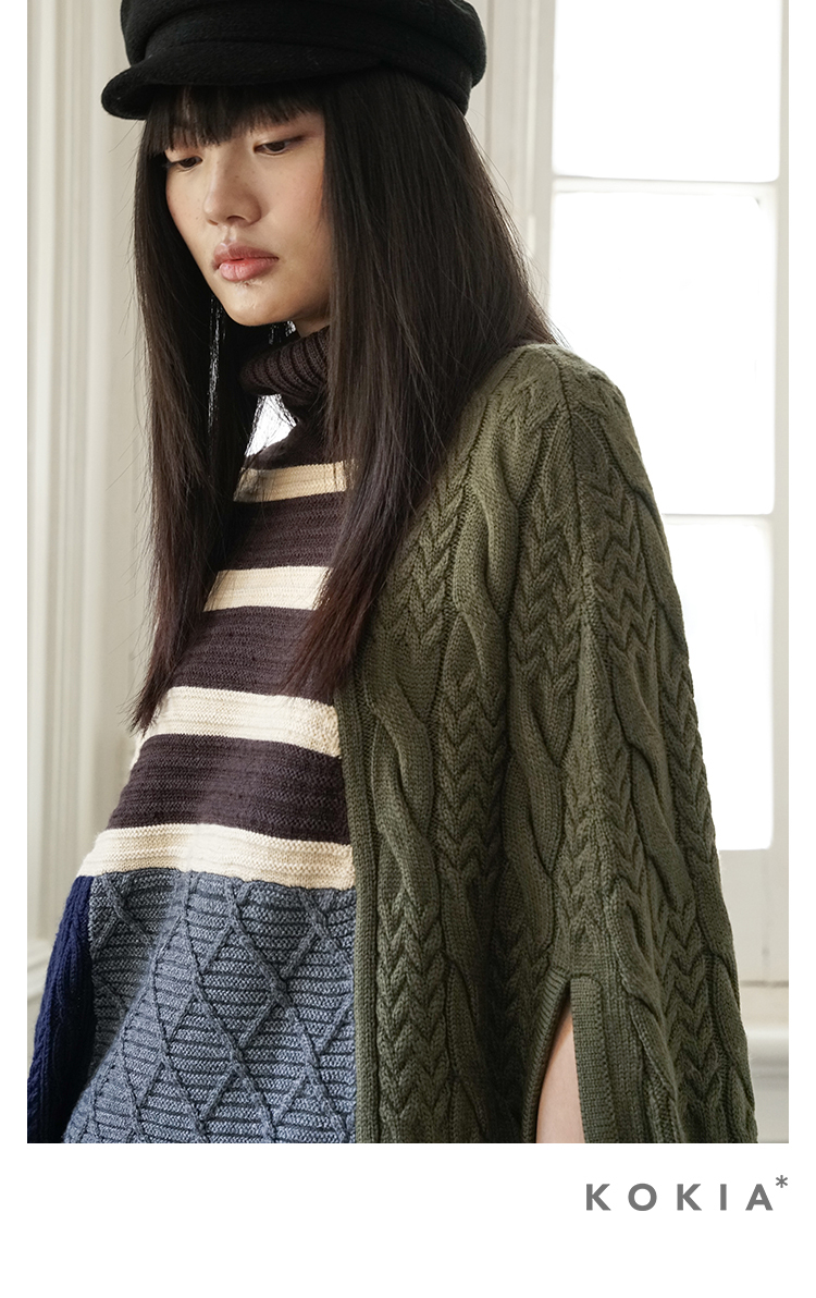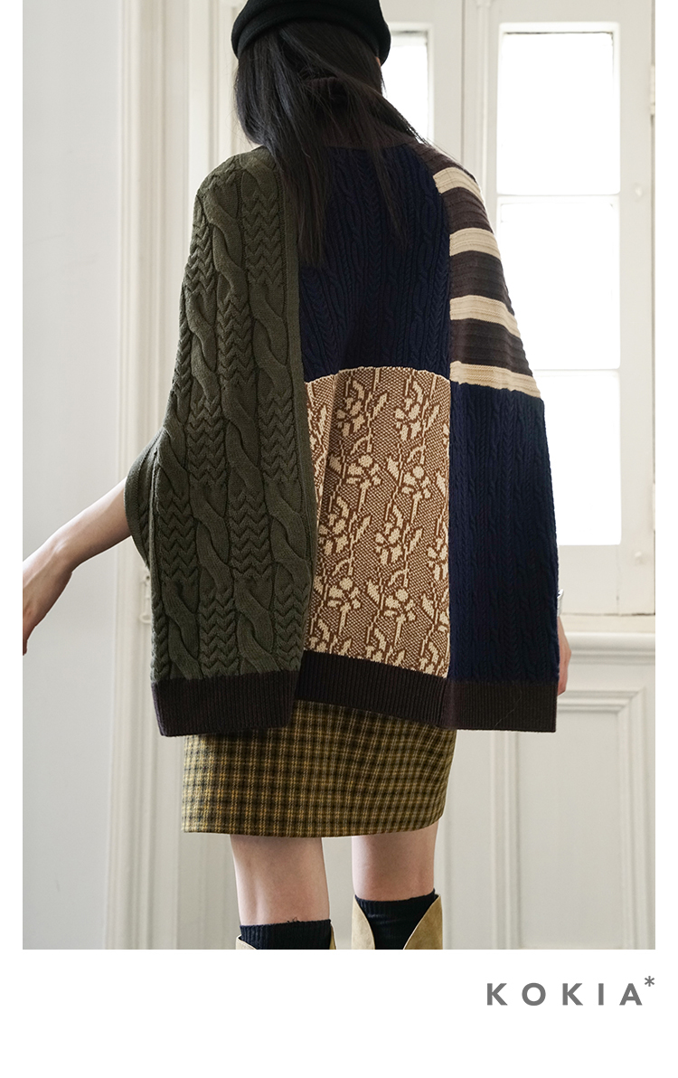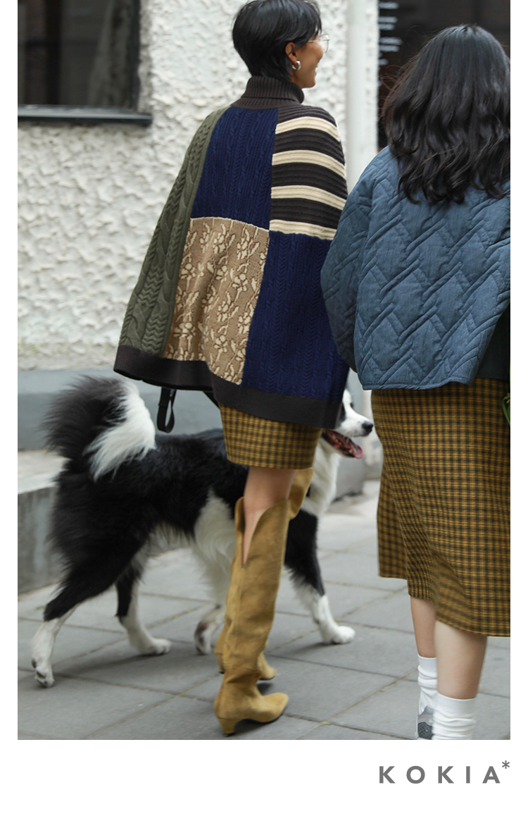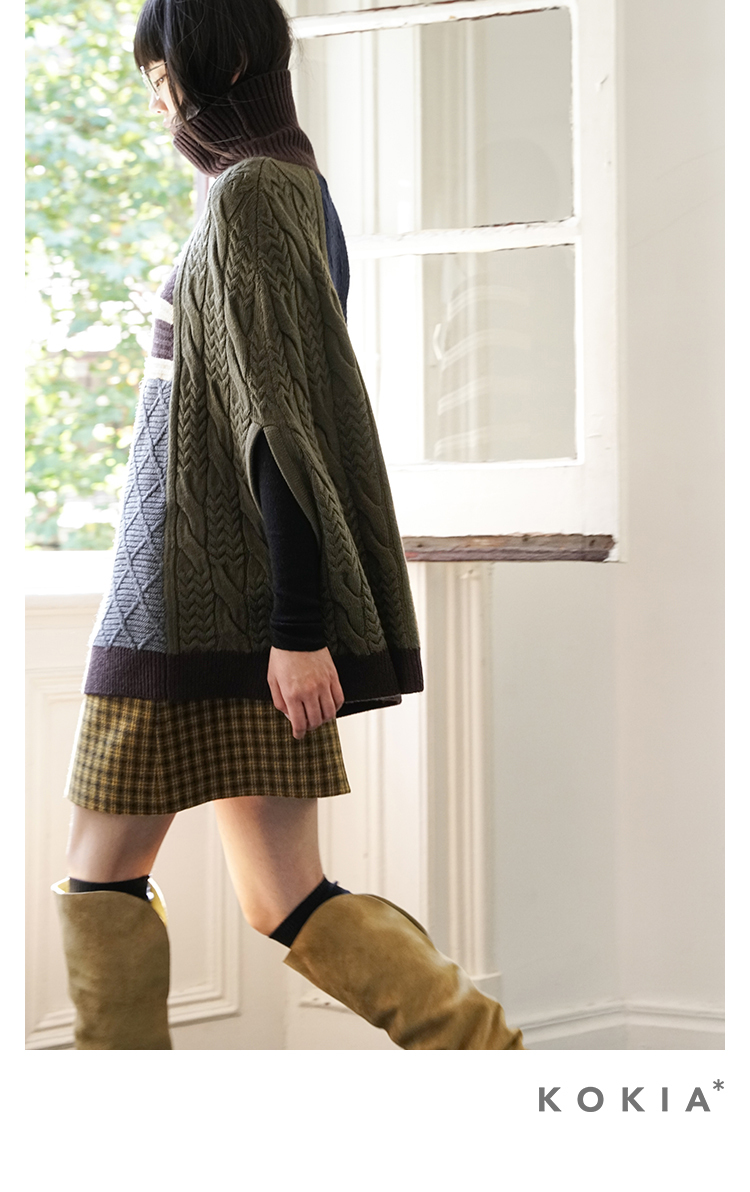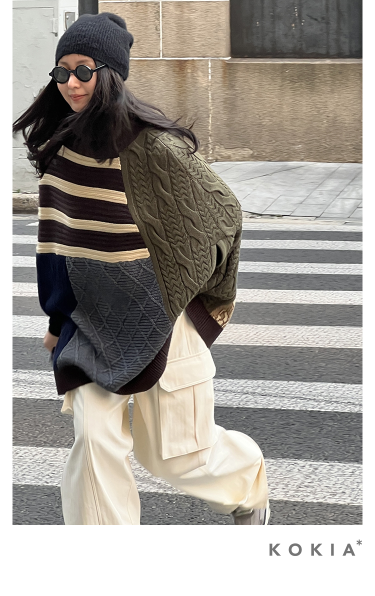 *o-ha-you*【FMNW338】重工Merino羊毛絞花菱格麻花提花拼色高領斗篷毛衣外套