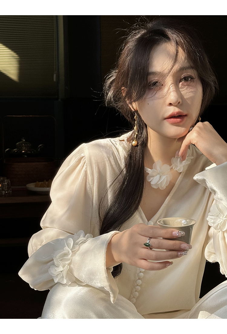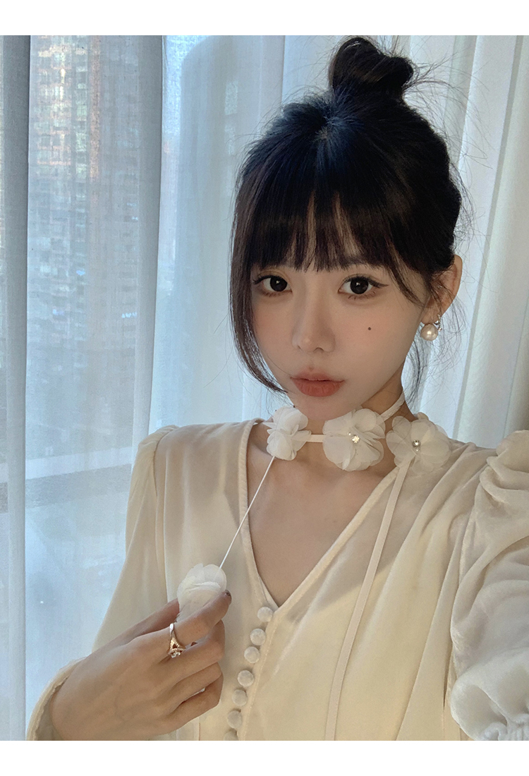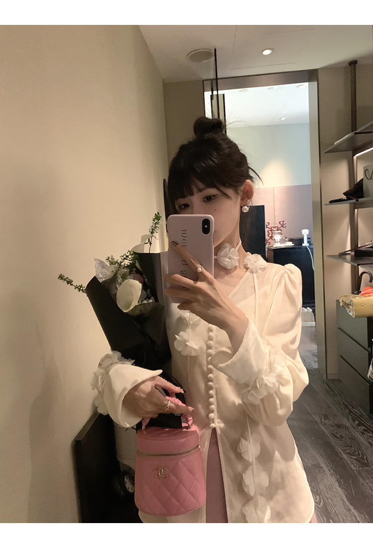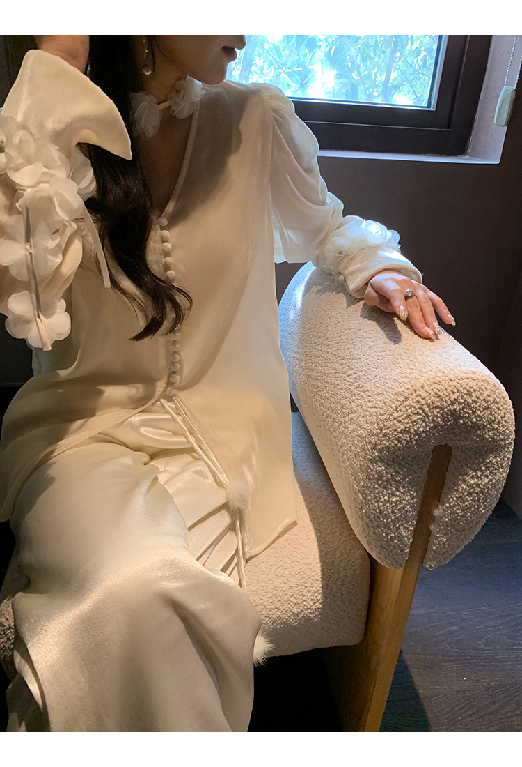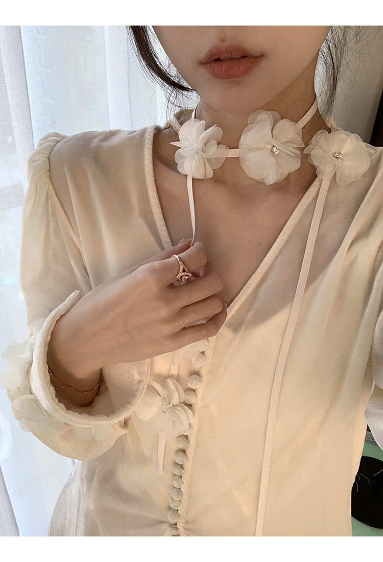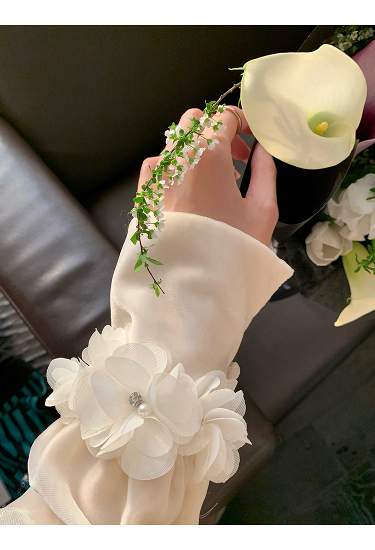 领型设计V领设计结合立体花朵飘带,采用莼手工制作花朵,点缀银钻珍珠,非常耗时耗力