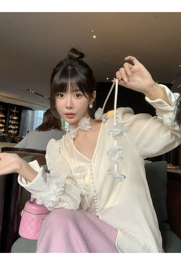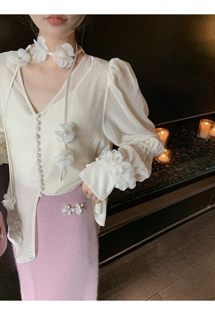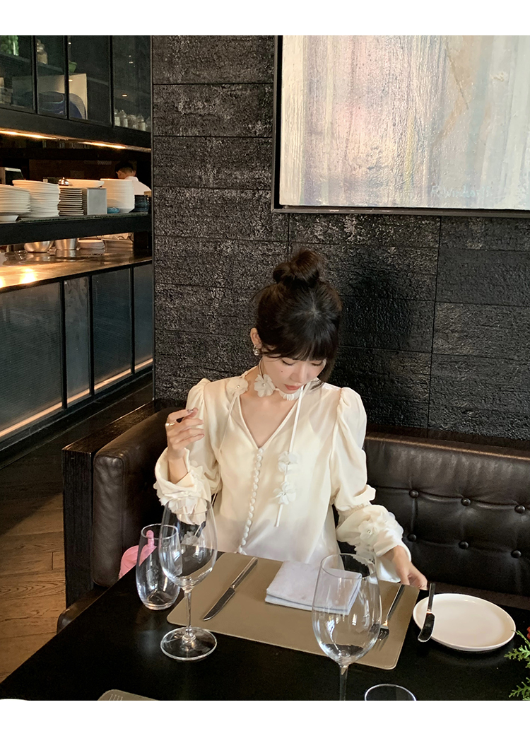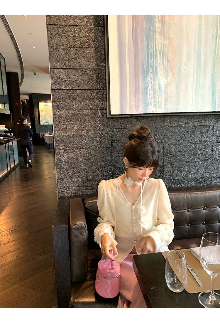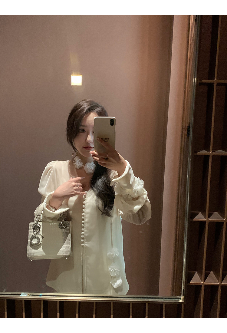 领型设计V领设计结合立体花朵飘带,采用莼手工制作花朵,点缀银钻珍珠,非常耗时耗力