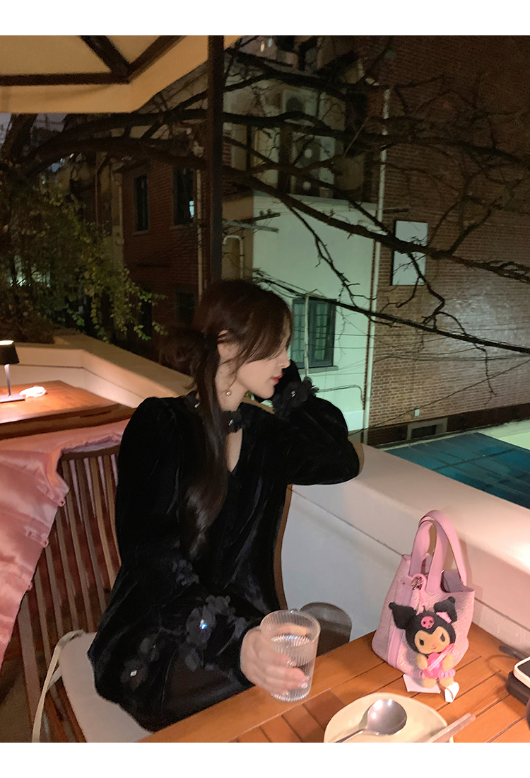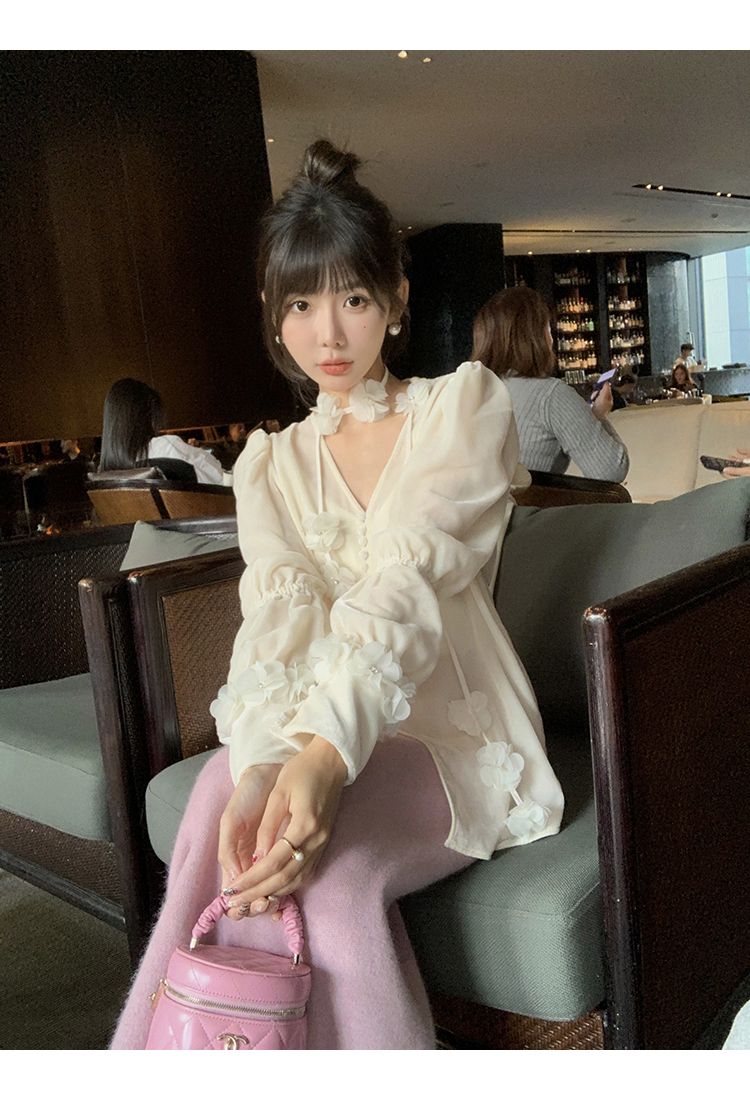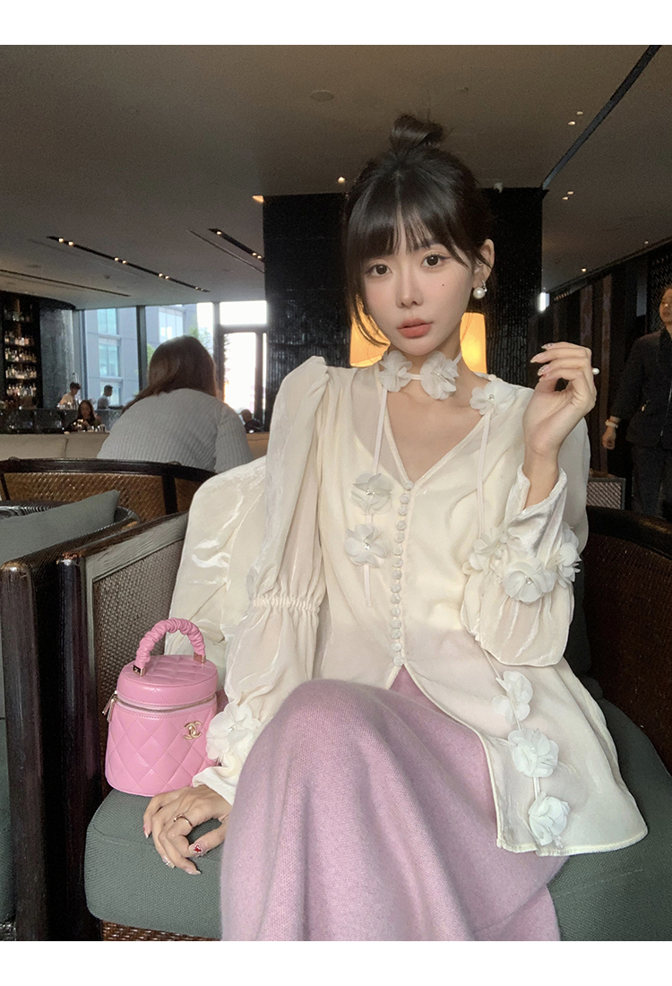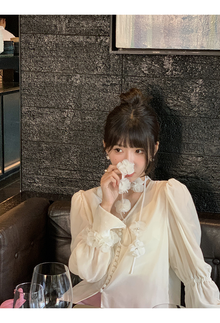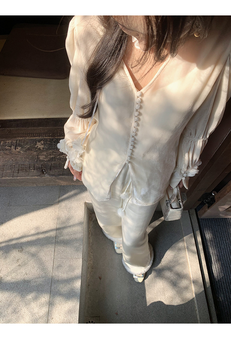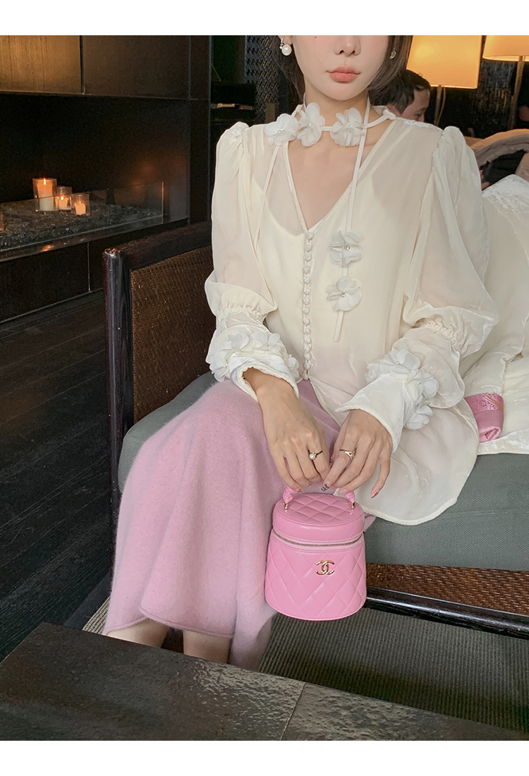 领型设计V领设计结合立体花朵飘带,采用莼手工制作花朵,点缀银钻珍珠,非常耗时耗力