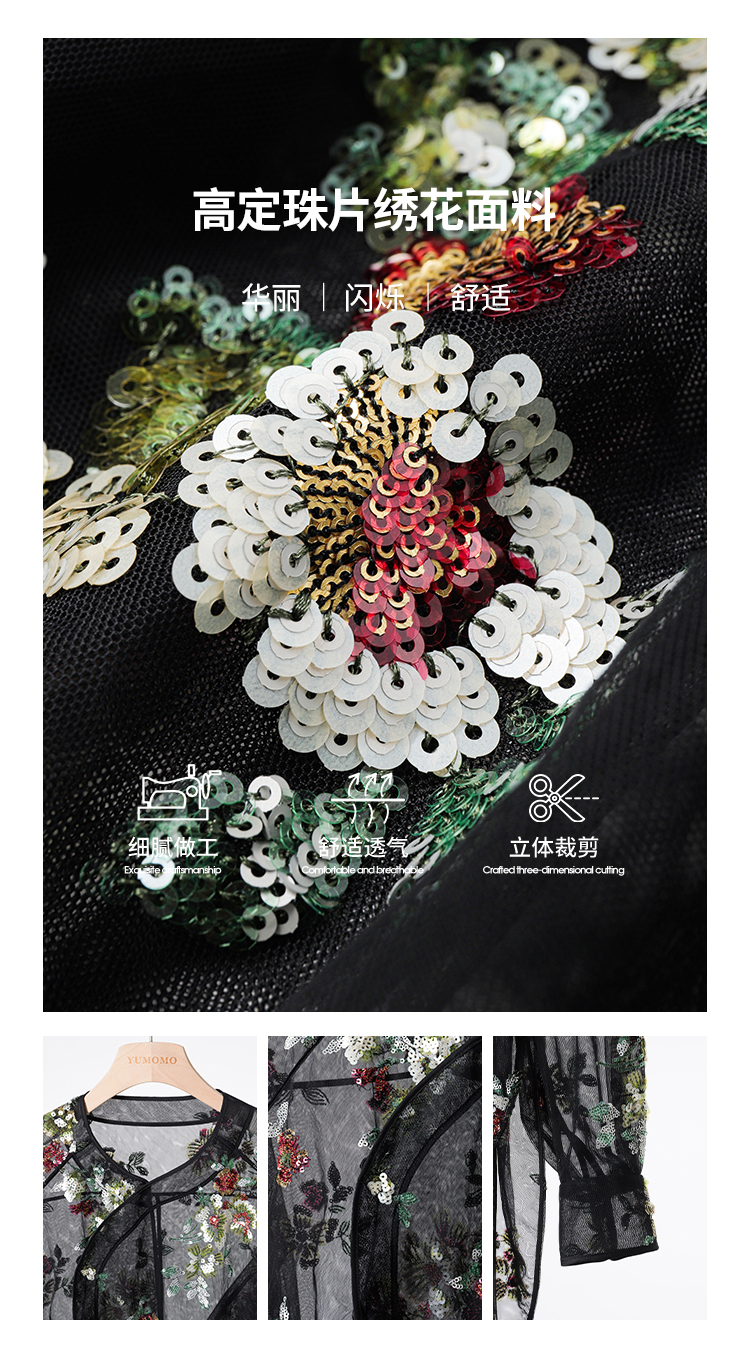甄選高定珠片繡花布料,選用的布料是網眼珠片繡,
