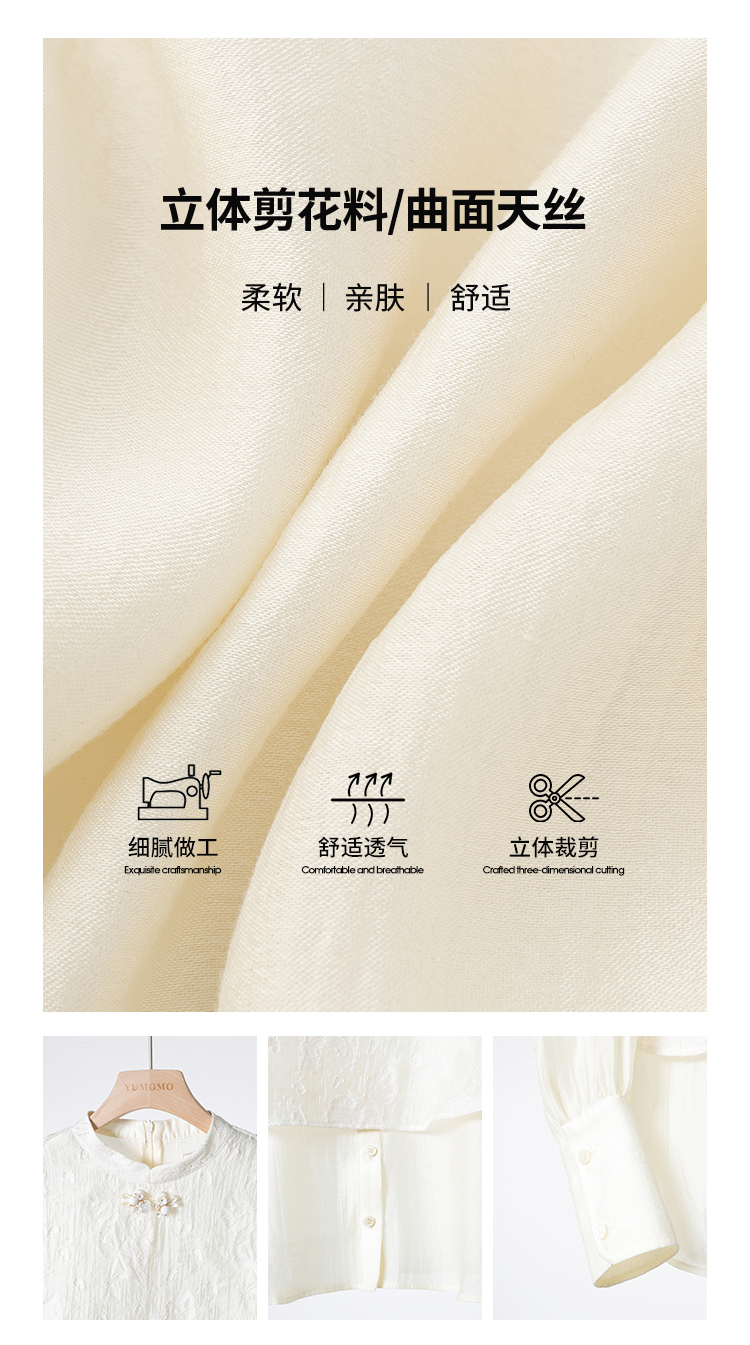 上衣前胸背採用立體剪花料,大身部位採用曲面天絲布料,