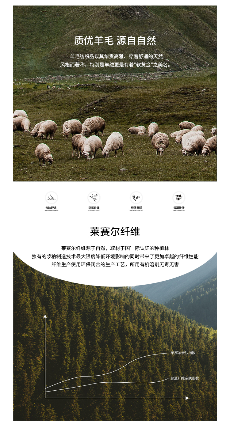 天絲和羊毛都是公認的柔軟纖維,所以布料具有良好的手感和穿著體驗,