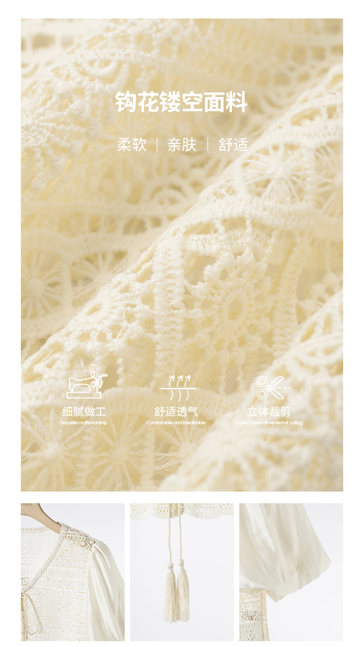 布料品名: 上衣:鉤花鏤空布料 袖口:萊賽爾天絲混紡料