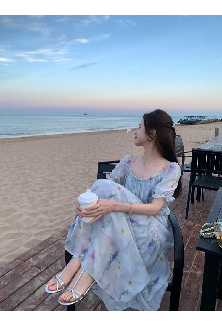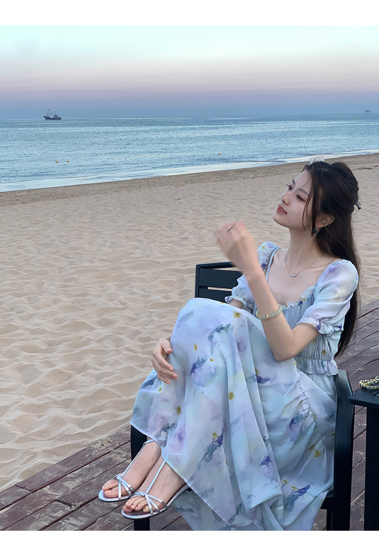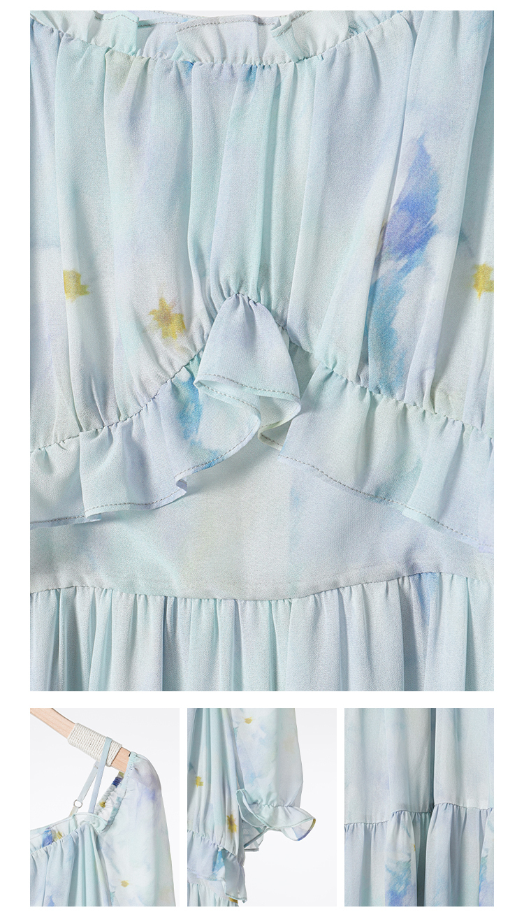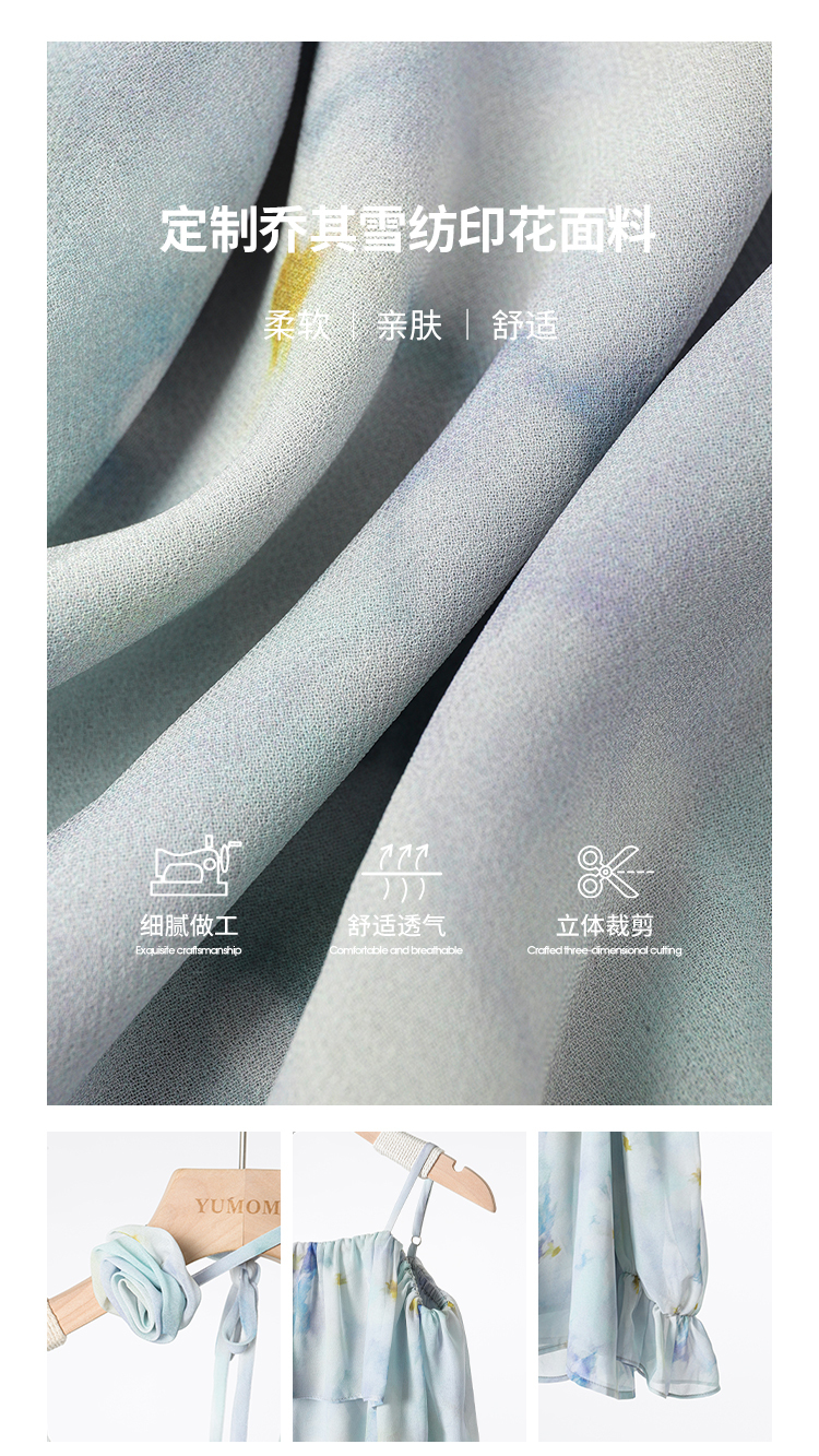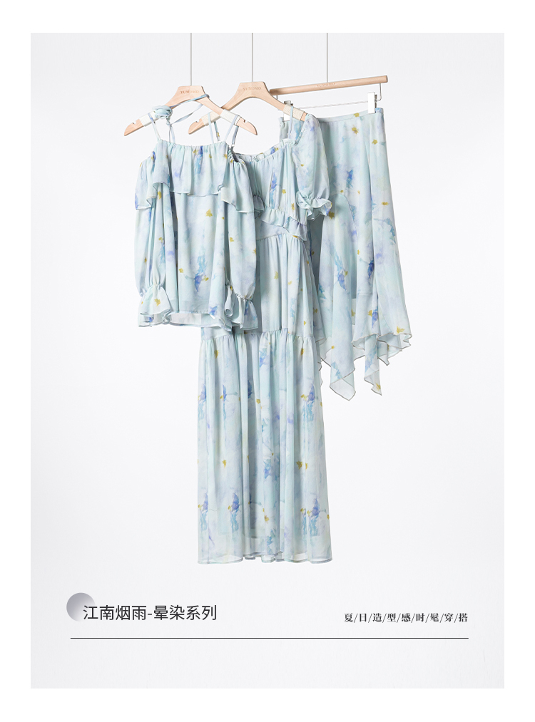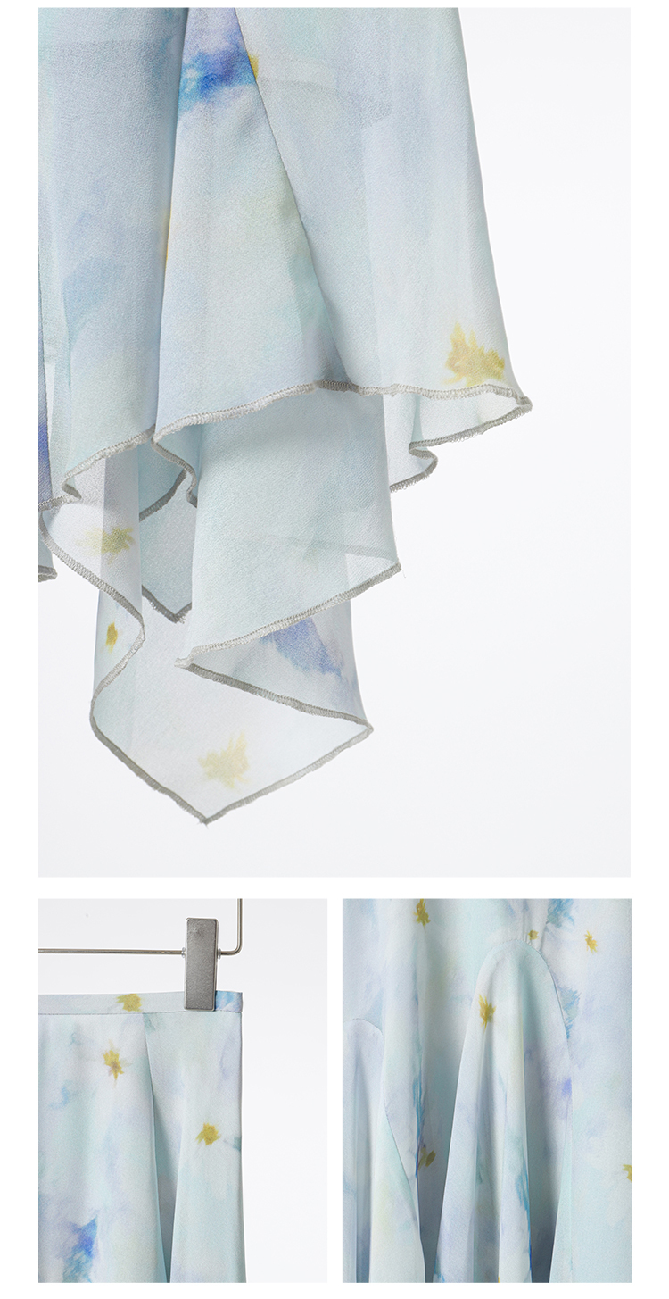 意像水彩花卉圖案,朦朧通透,質地輕薄細膩,穿著輕盈飄逸。