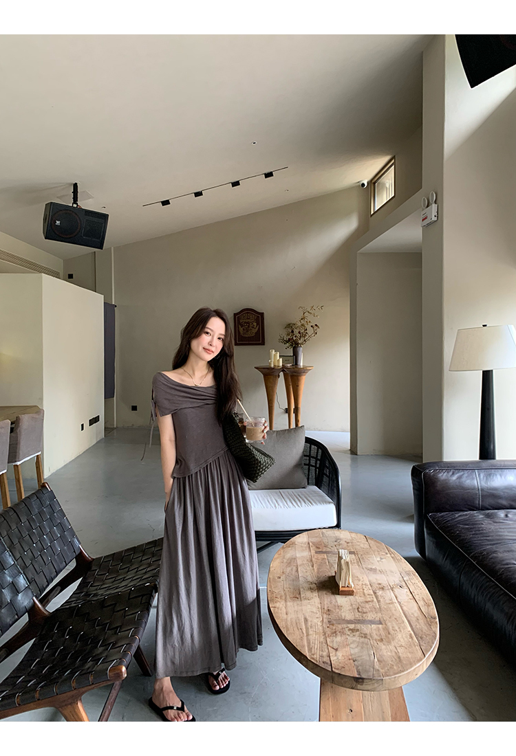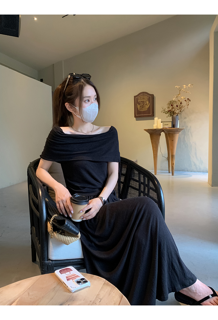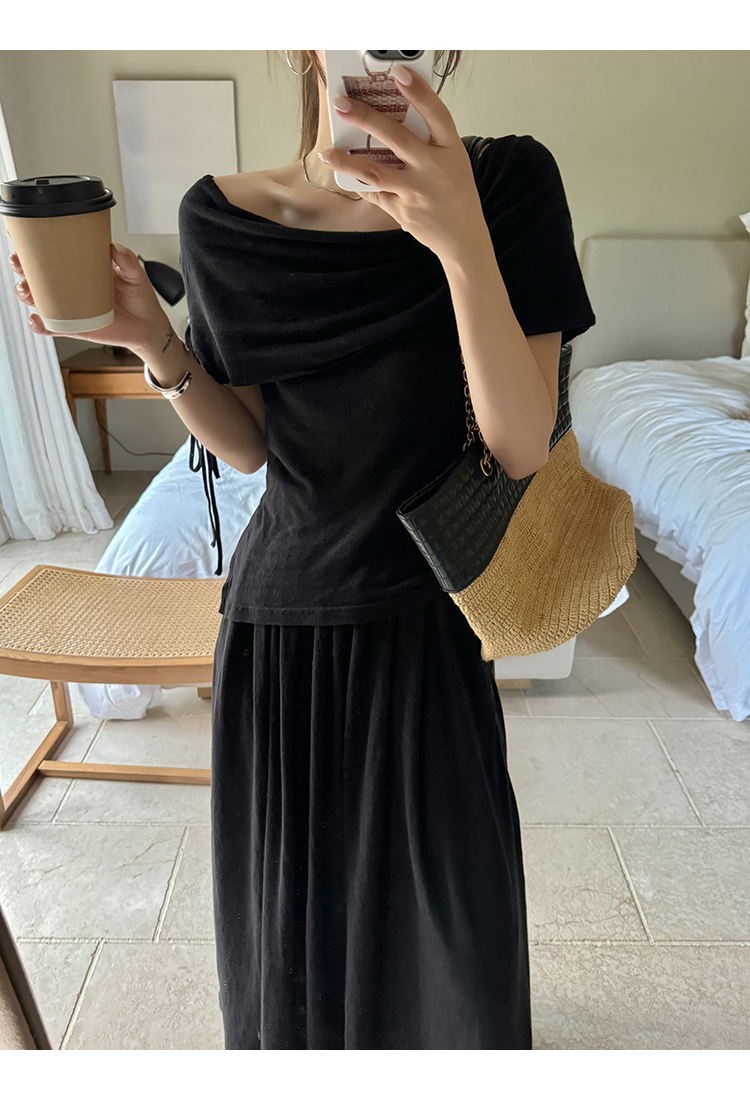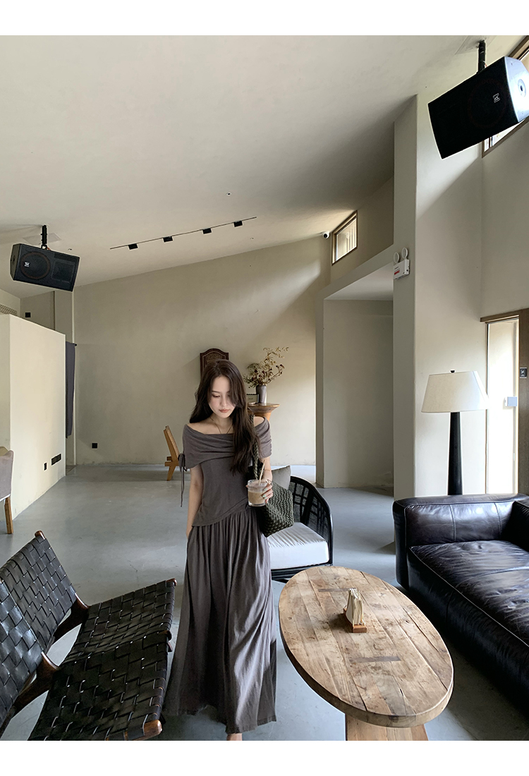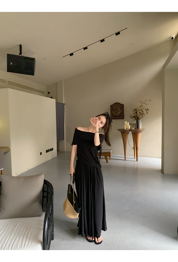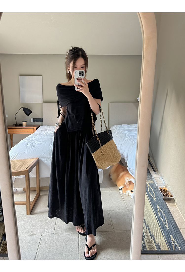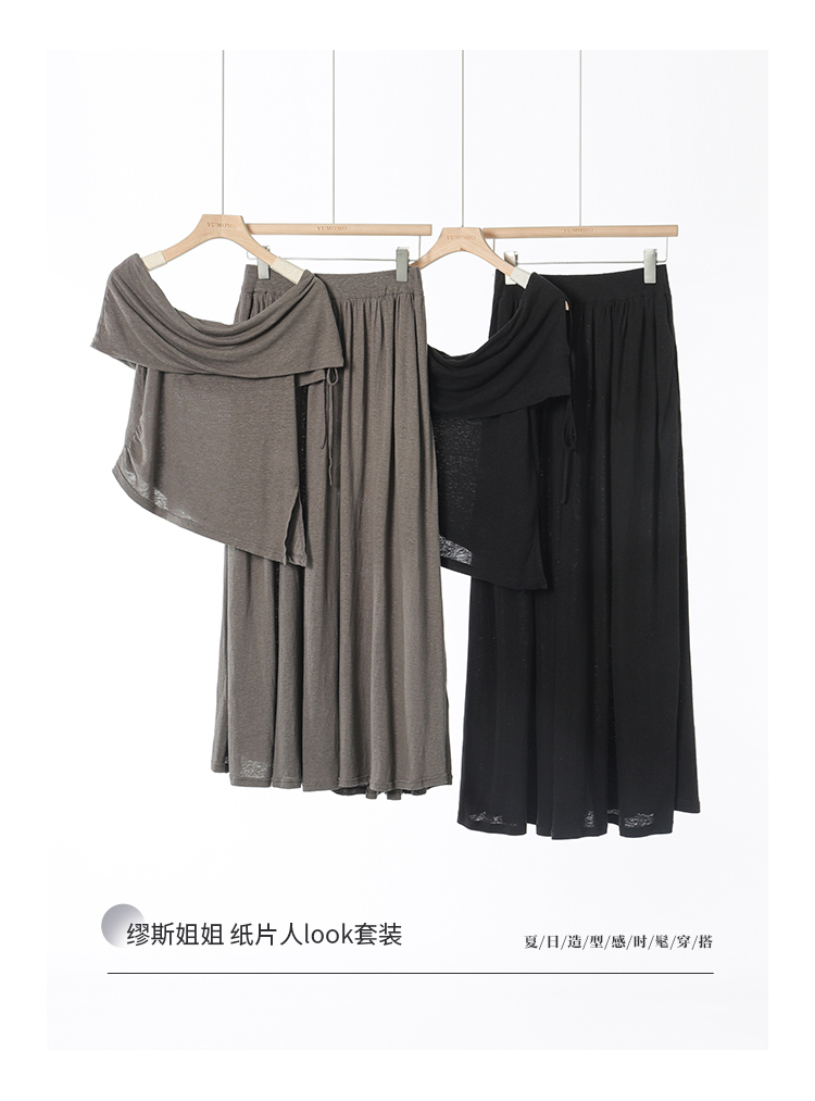 *o-ha-you*【FMQD2042064】繆斯姊姊紙片人look套裝訂製亞麻針織一字肩上衣/大擺半裙