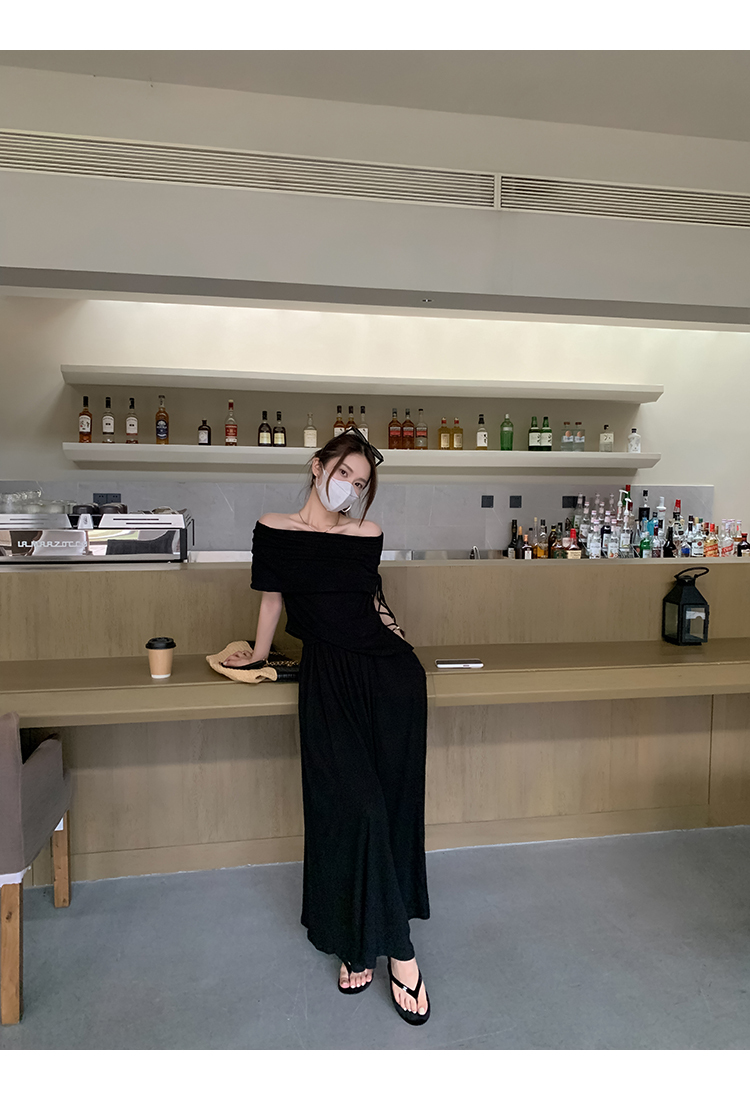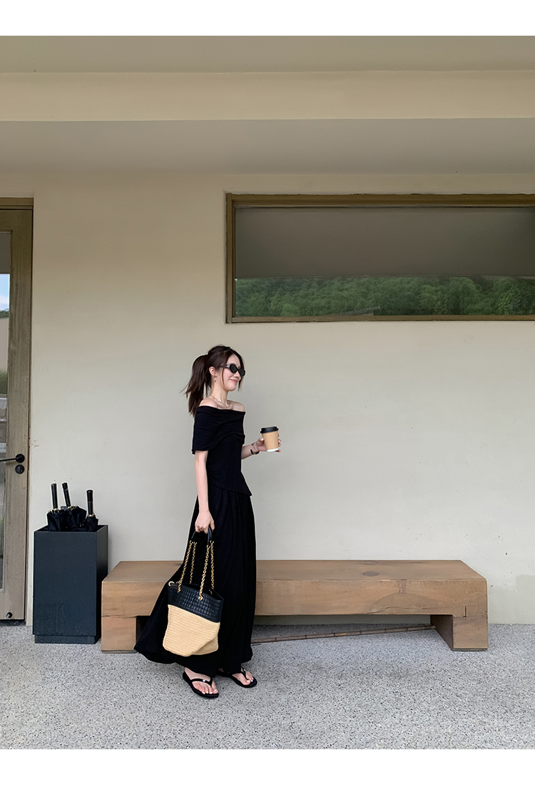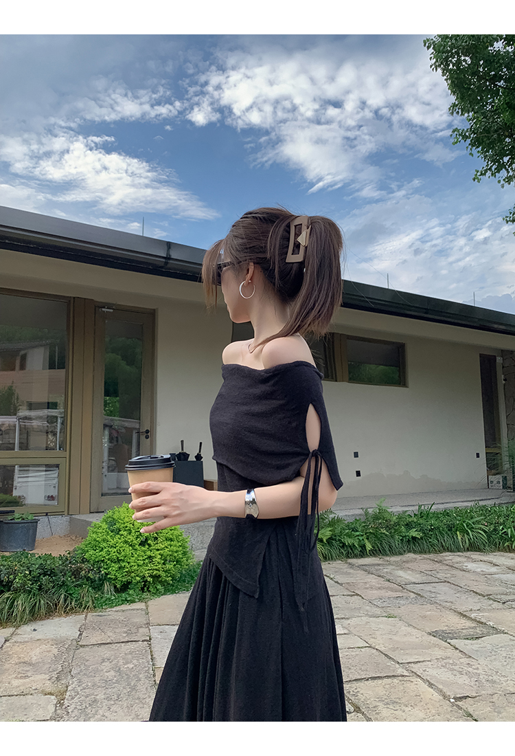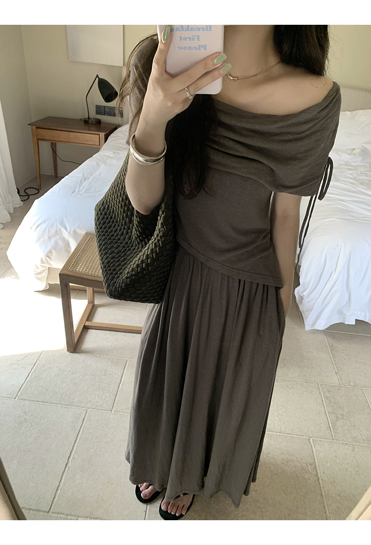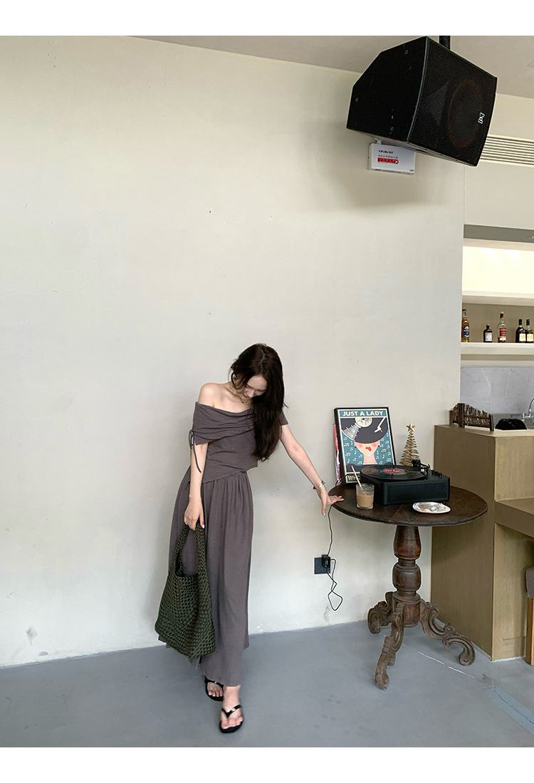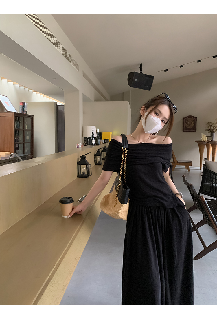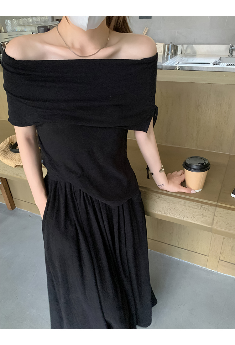 *o-ha-you*【FMQD2042064】繆斯姊姊紙片人look套裝訂製亞麻針織一字肩上衣/大擺半裙