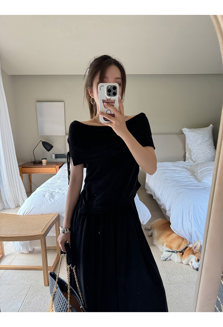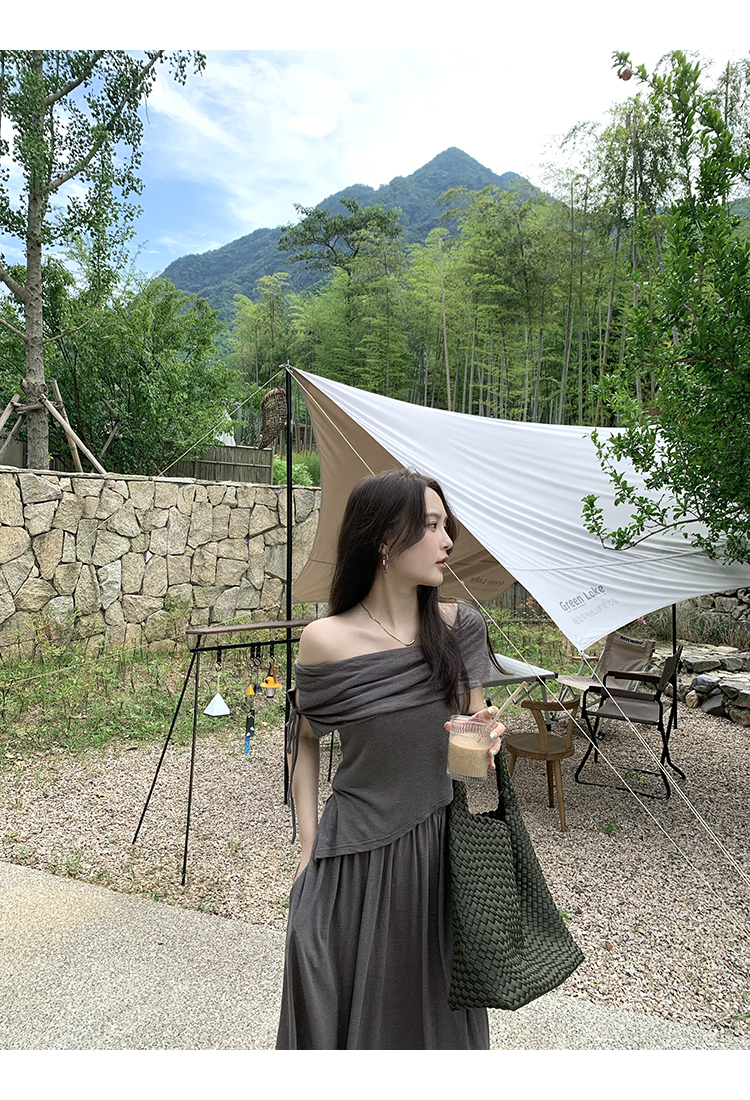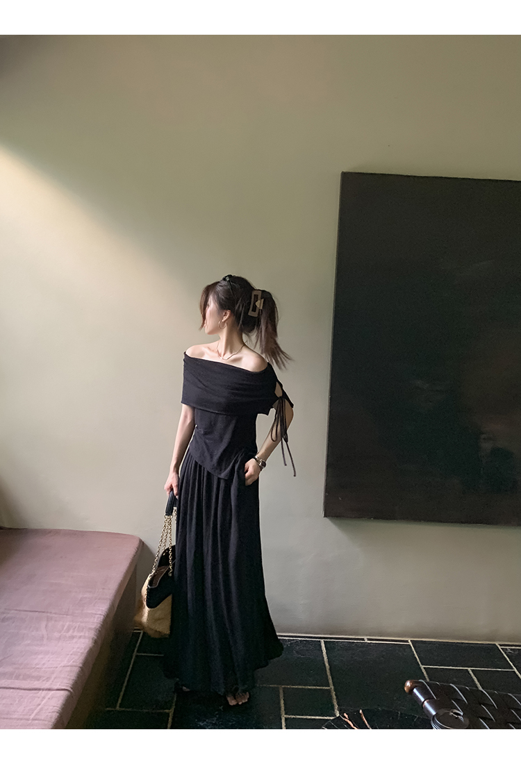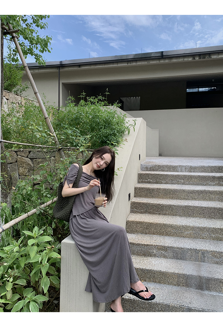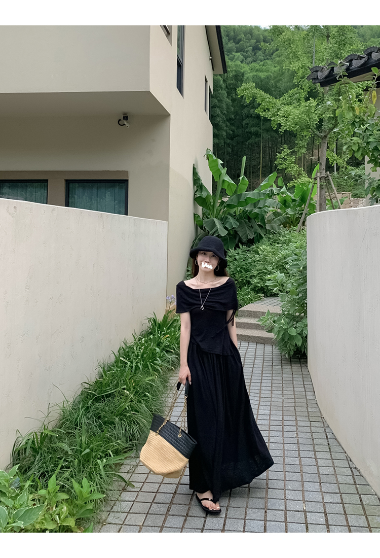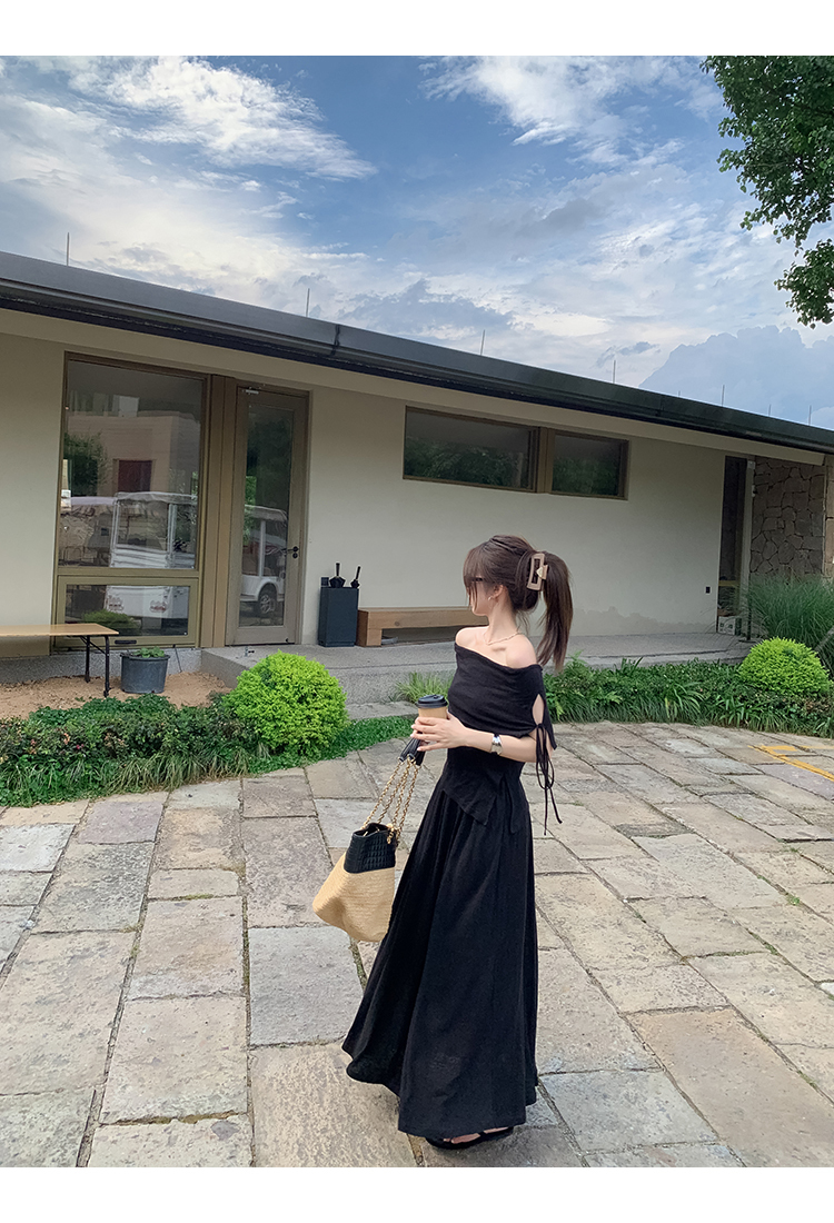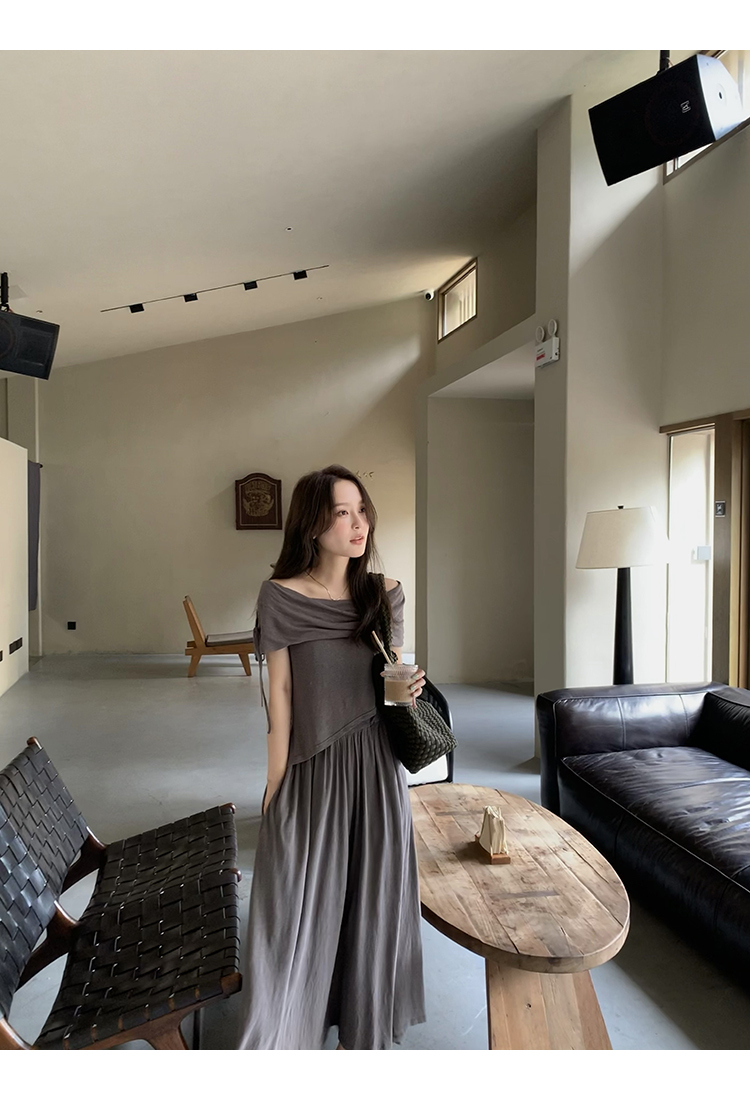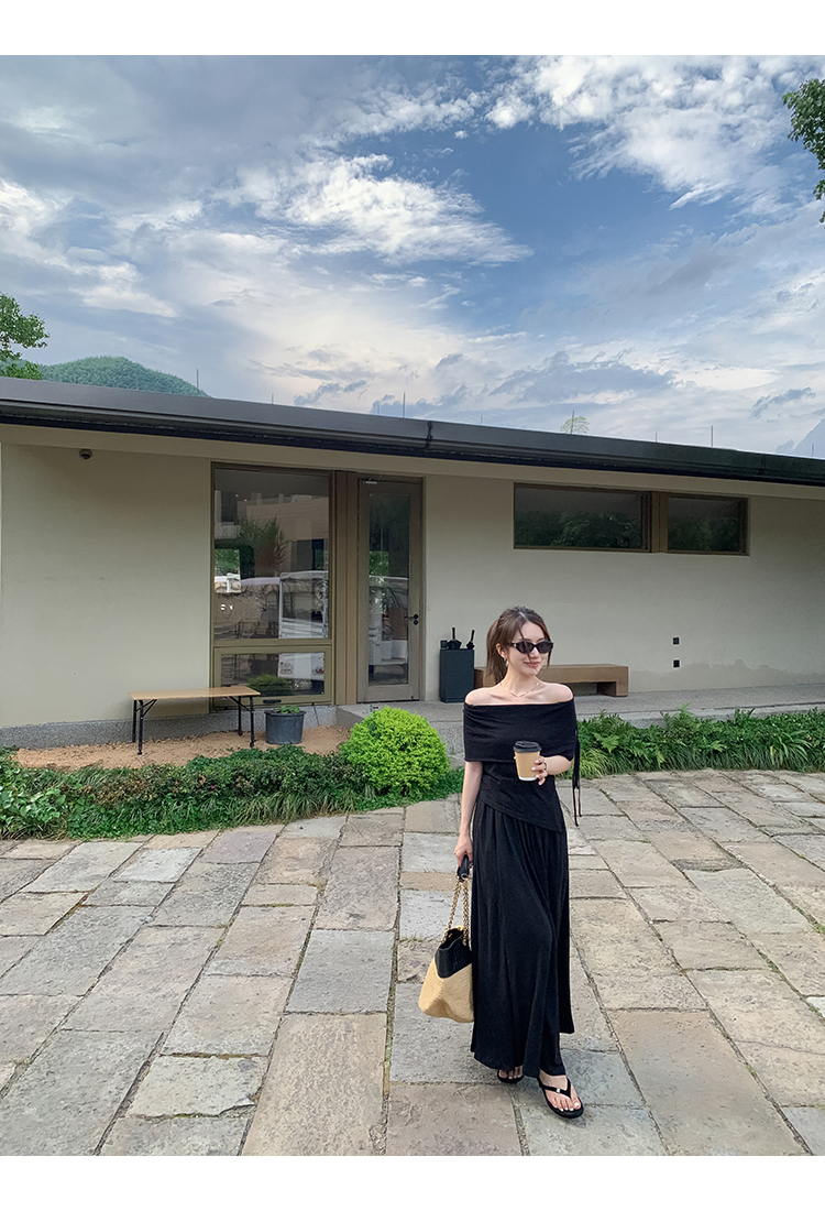 *o-ha-you*【FMQD2042064】繆斯姊姊紙片人look套裝訂製亞麻針織一字肩上衣/大擺半裙
