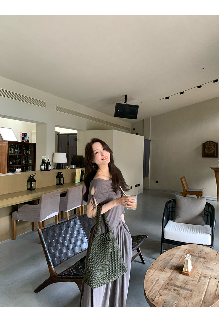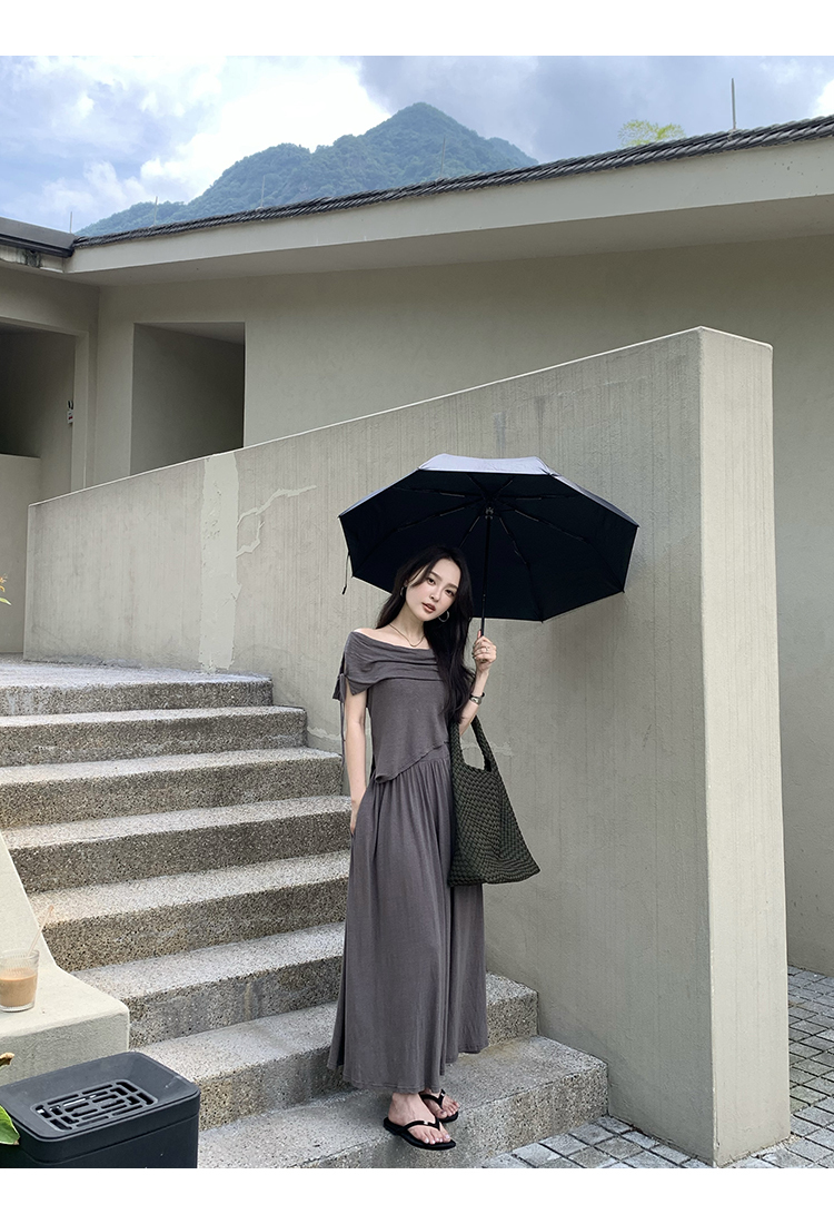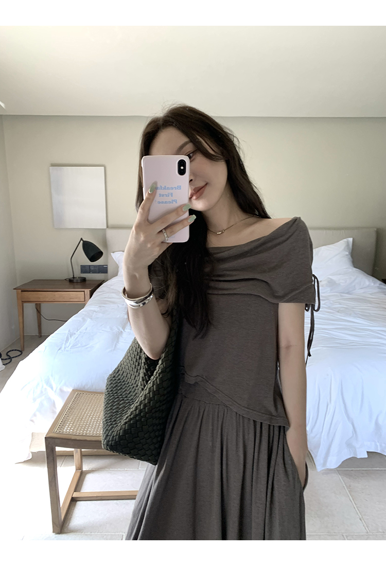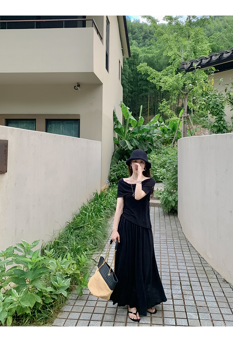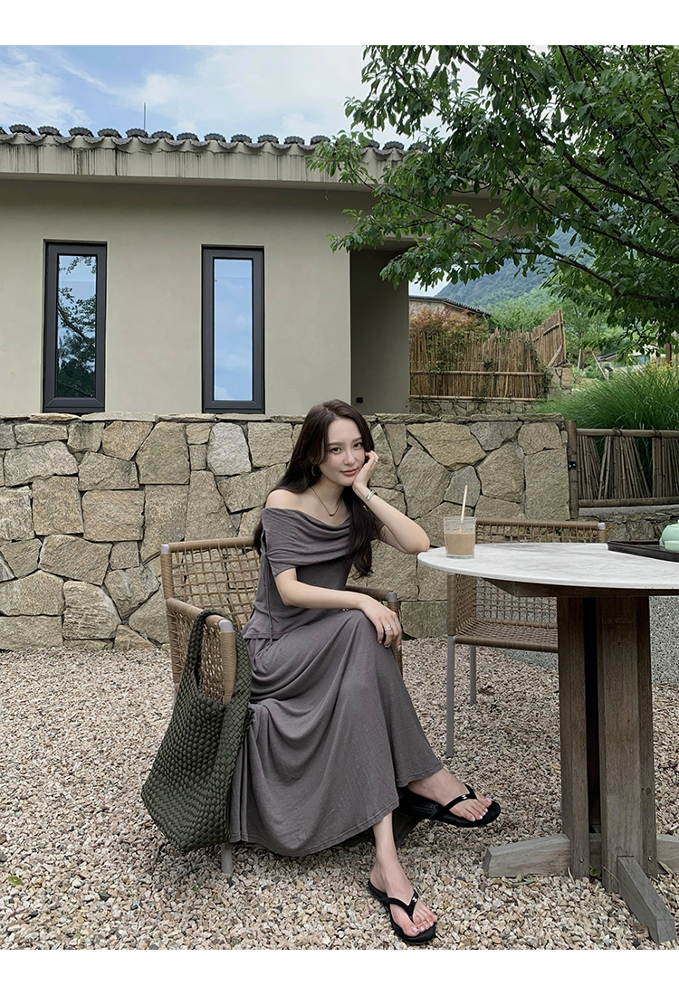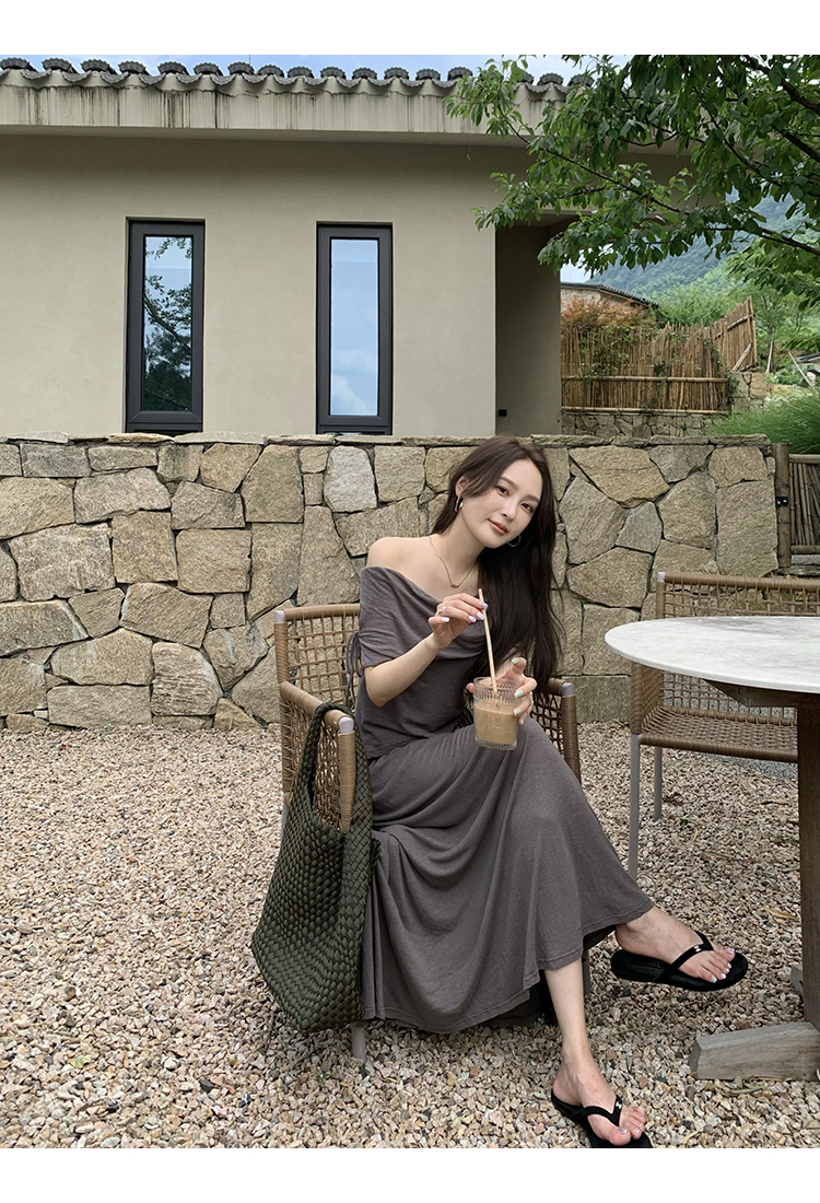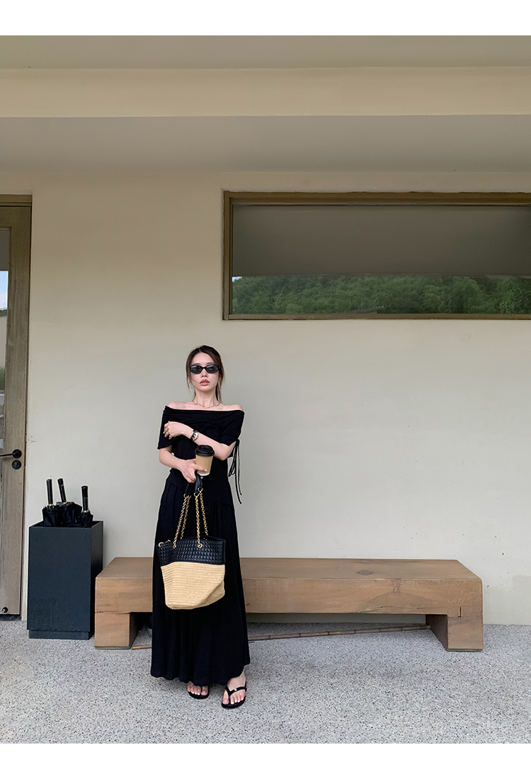 *o-ha-you*【FMQD2042064】繆斯姊姊紙片人look套裝訂製亞麻針織一字肩上衣/大擺半裙