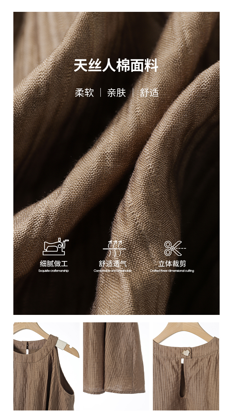 布料透氣性好,乾爽垂墜,手感順滑,貼身穿著舒適不沾身。