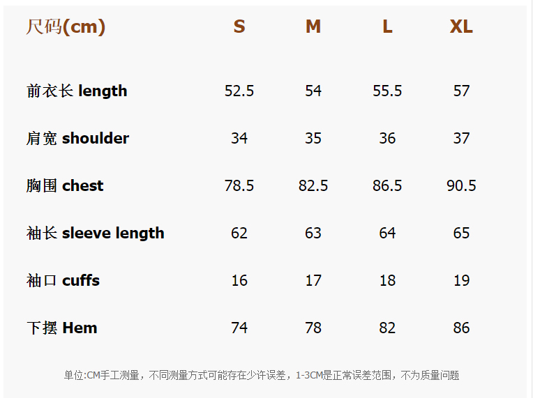 衣長/肩寬/袖長為平量,其他為一圈(單位:公分)