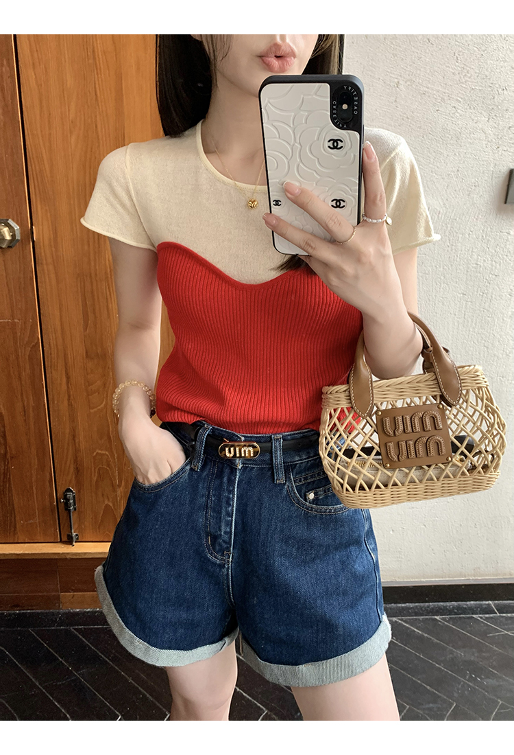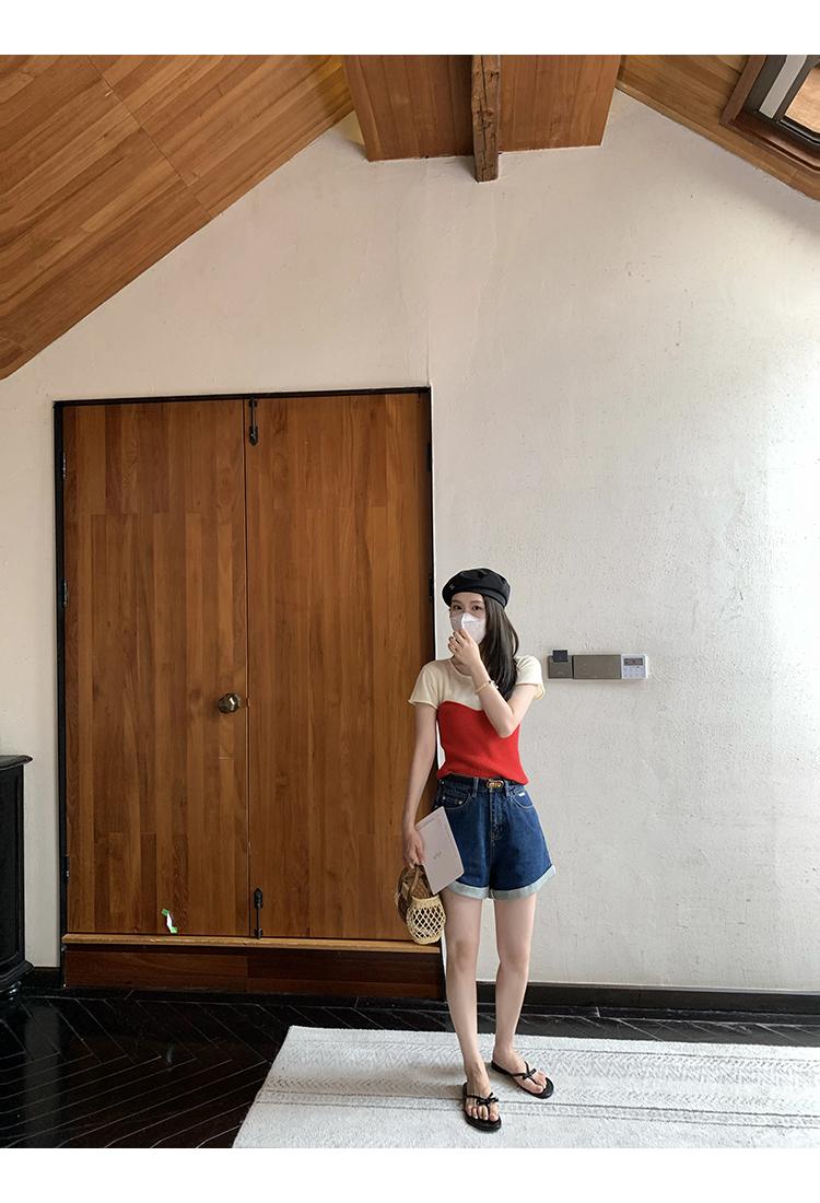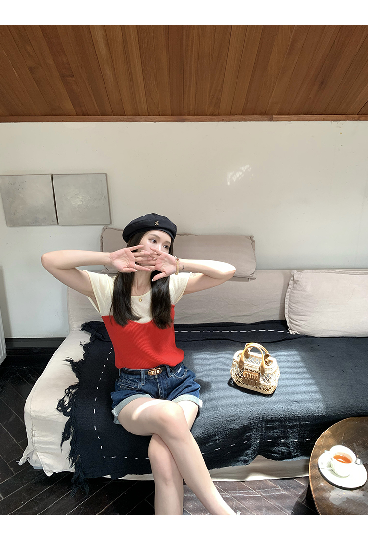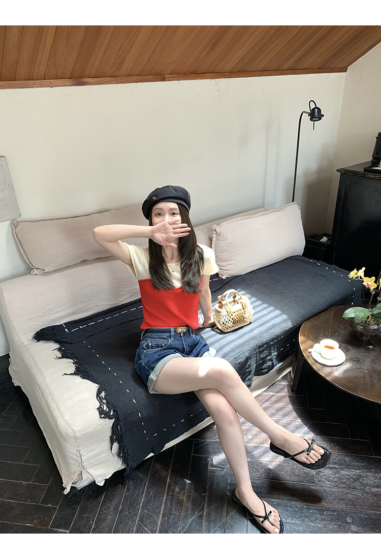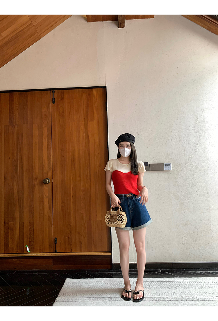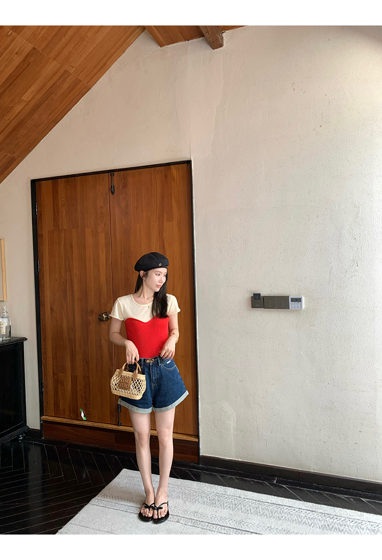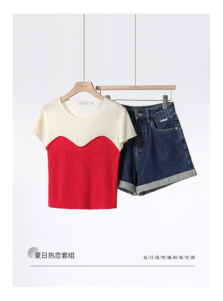*o-ha-you*【FMQH2042019】夏日熱戀訂製亞麻萊賽爾假兩件針織T恤/純棉翻折牛仔短褲