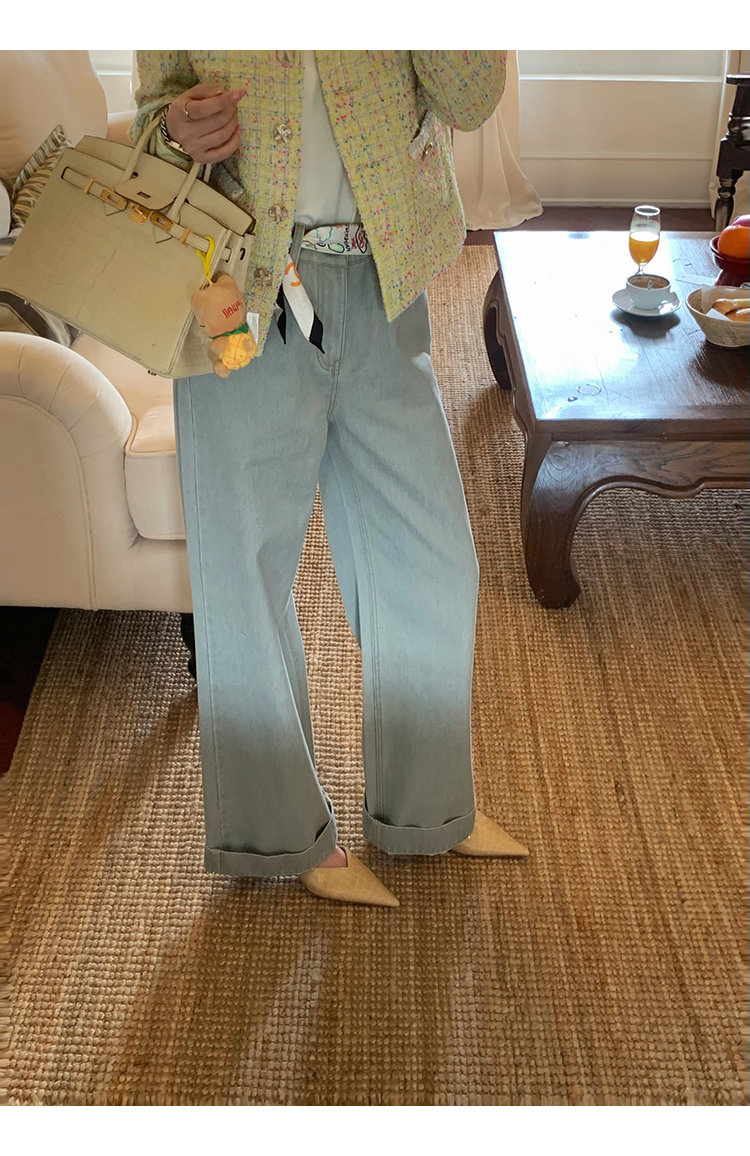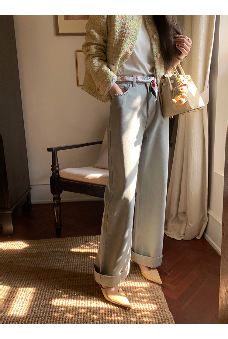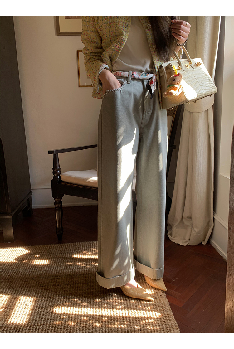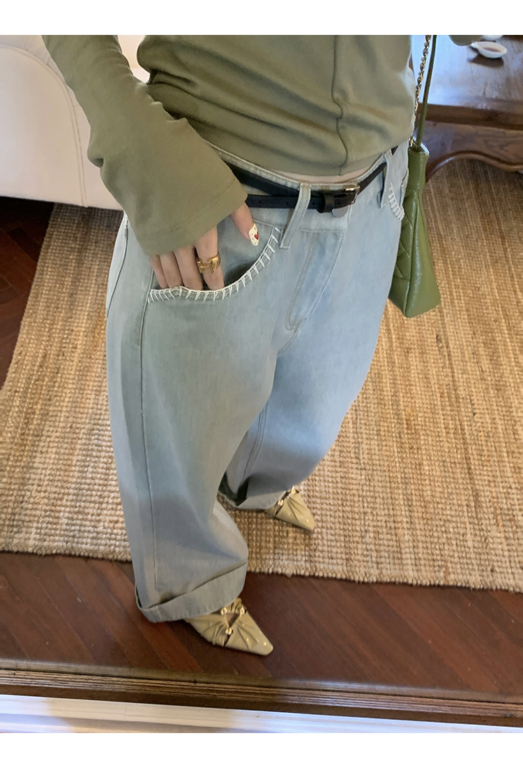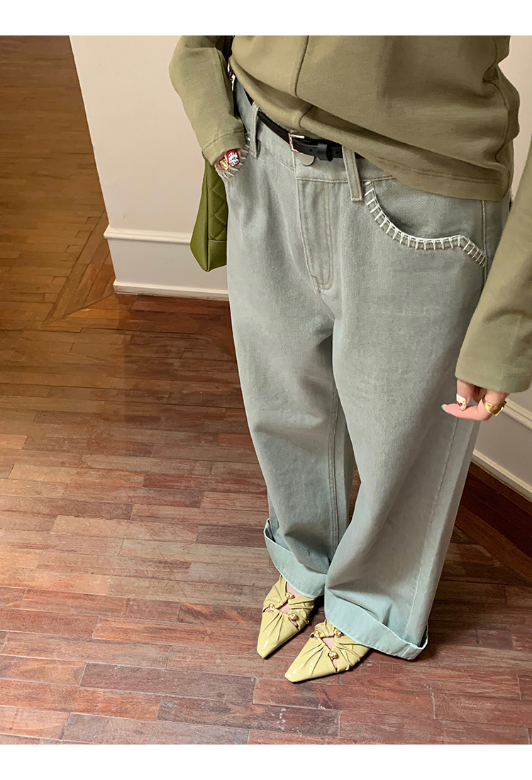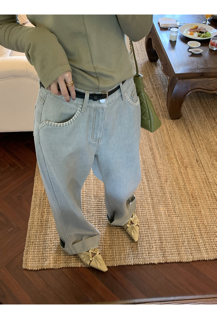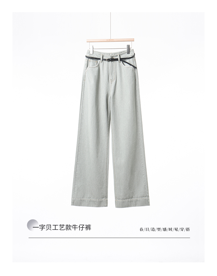 *o-ha-you*【FMQK2041019】貝殼繡牛仔褲橫跨多季!送腰帶 重工高腰慵懶顯瘦休閒寬褲