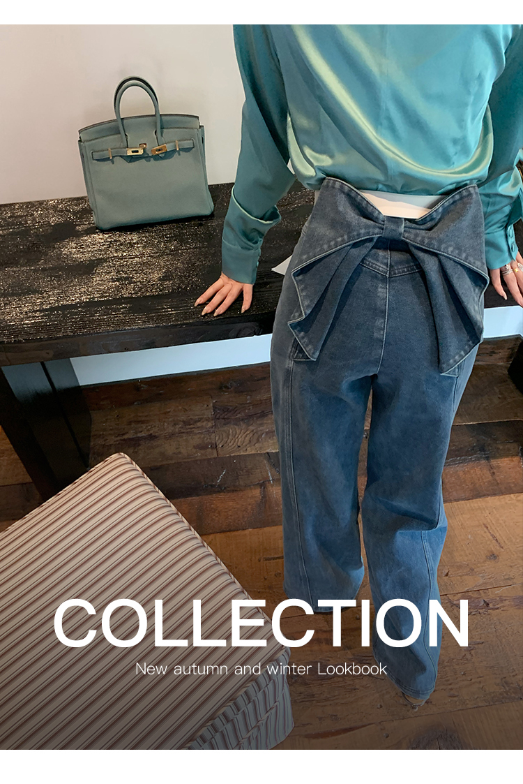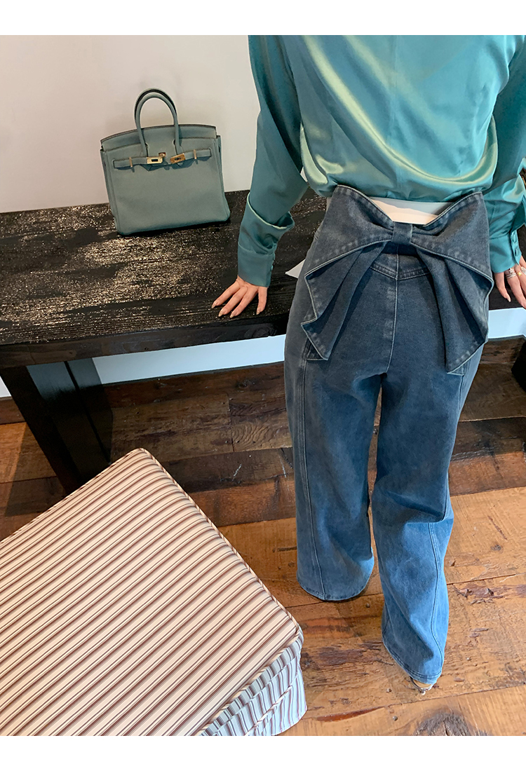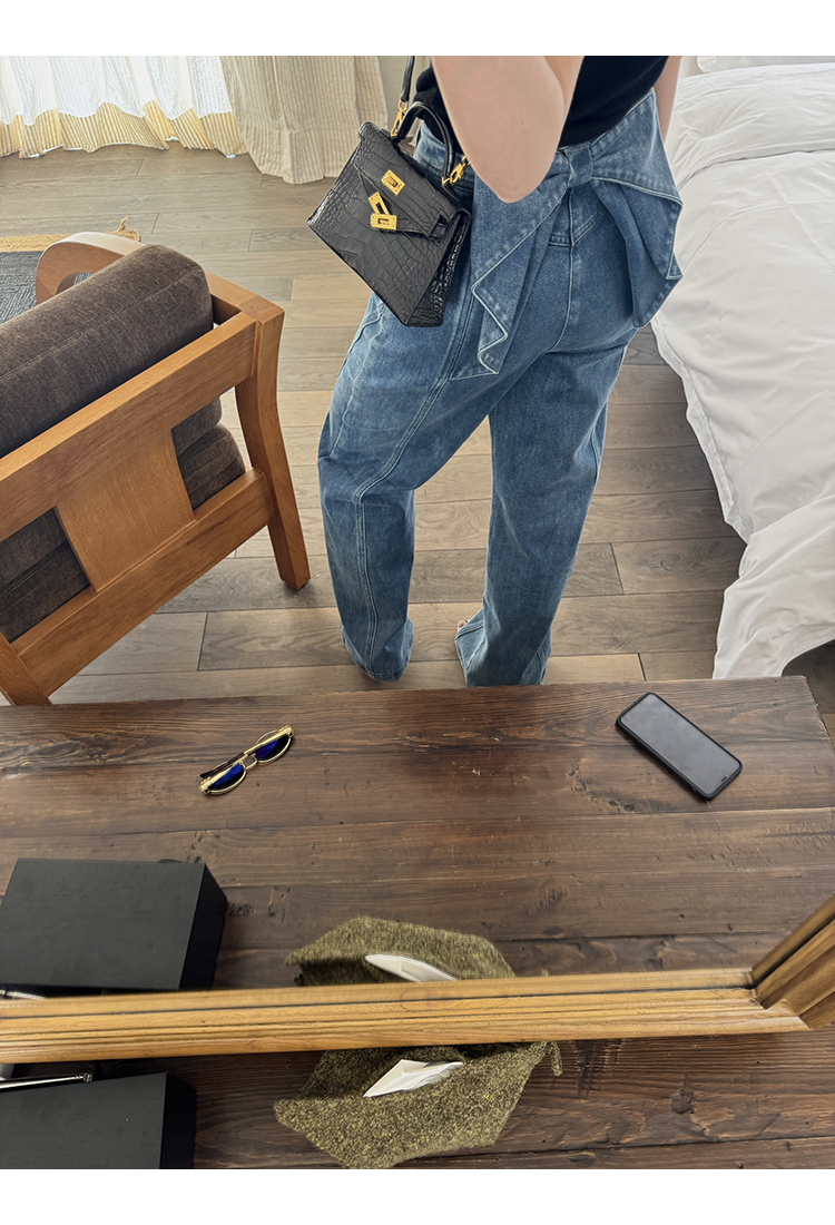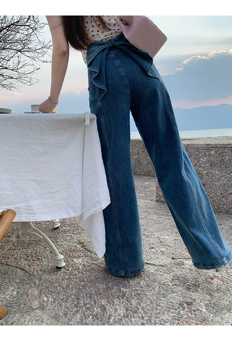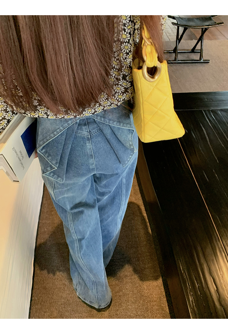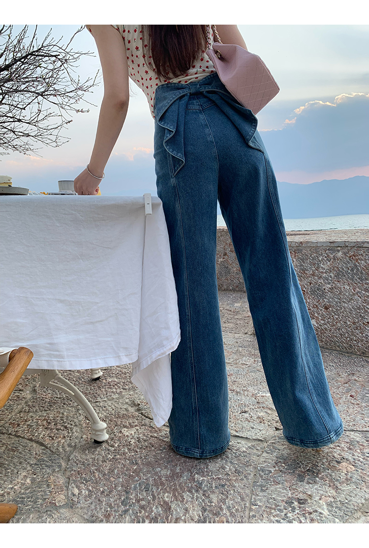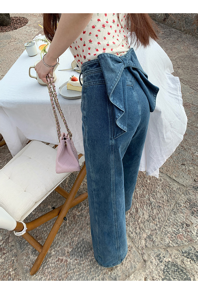 *o-ha-you*【FMQKA10012】蝴蝶結牛仔褲 天繎高棉彈性復古水洗高腰顯瘦寬鬆直筒褲休閒褲