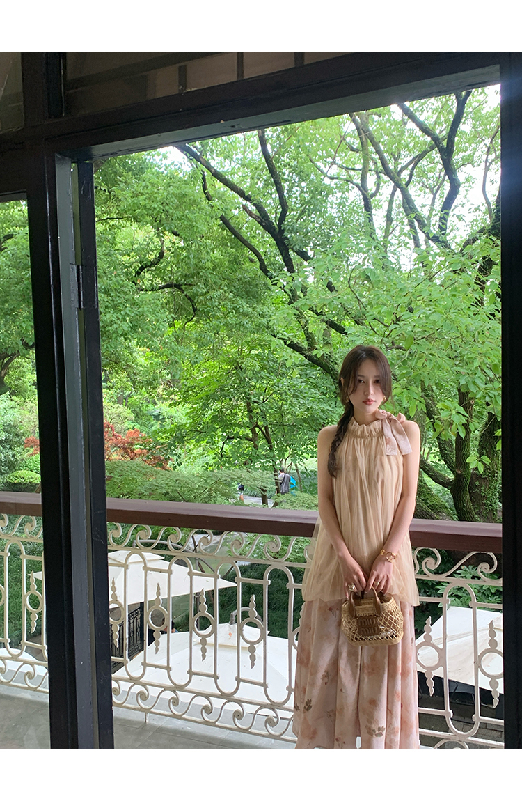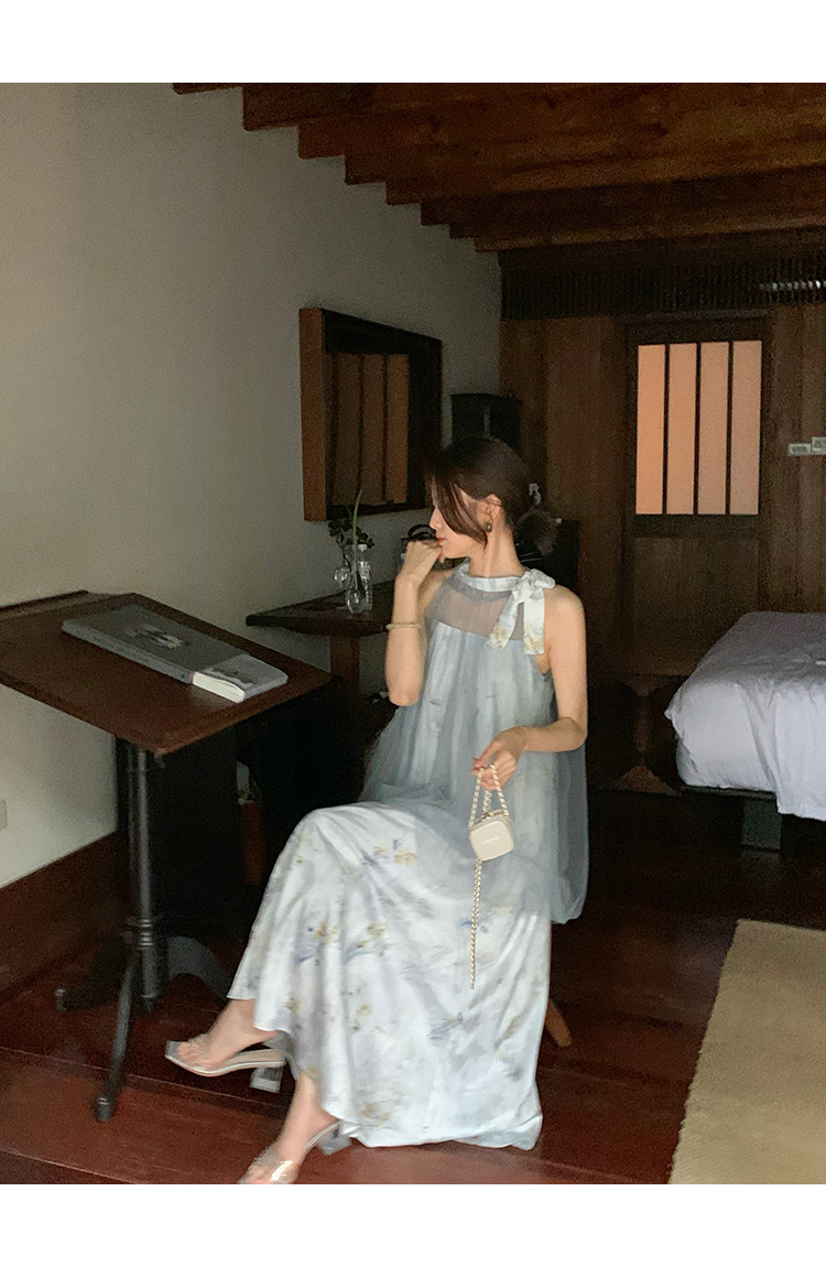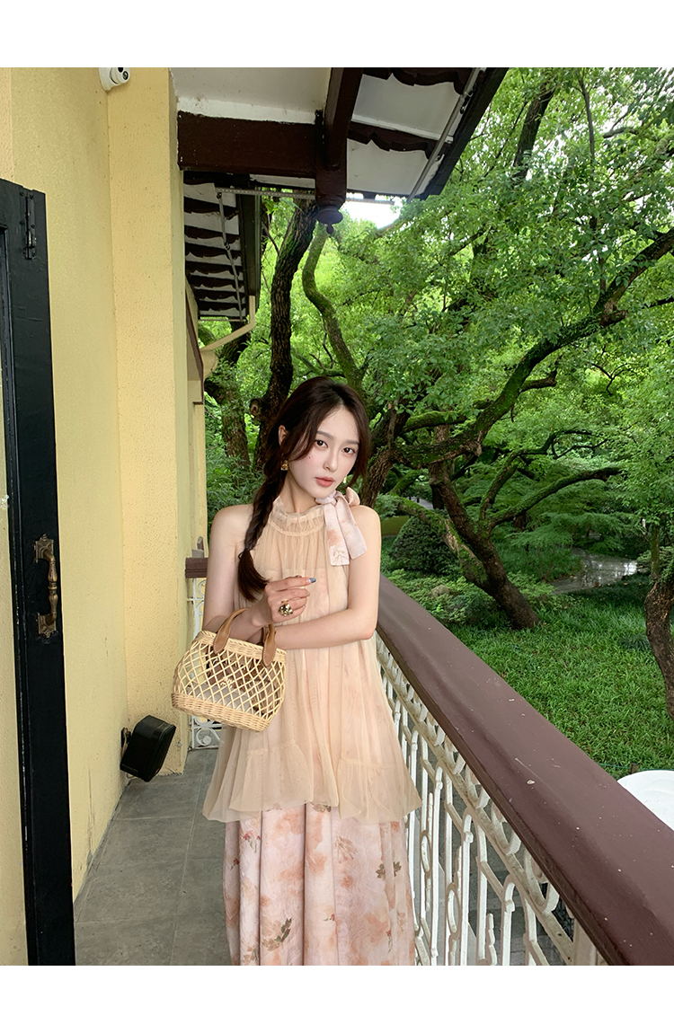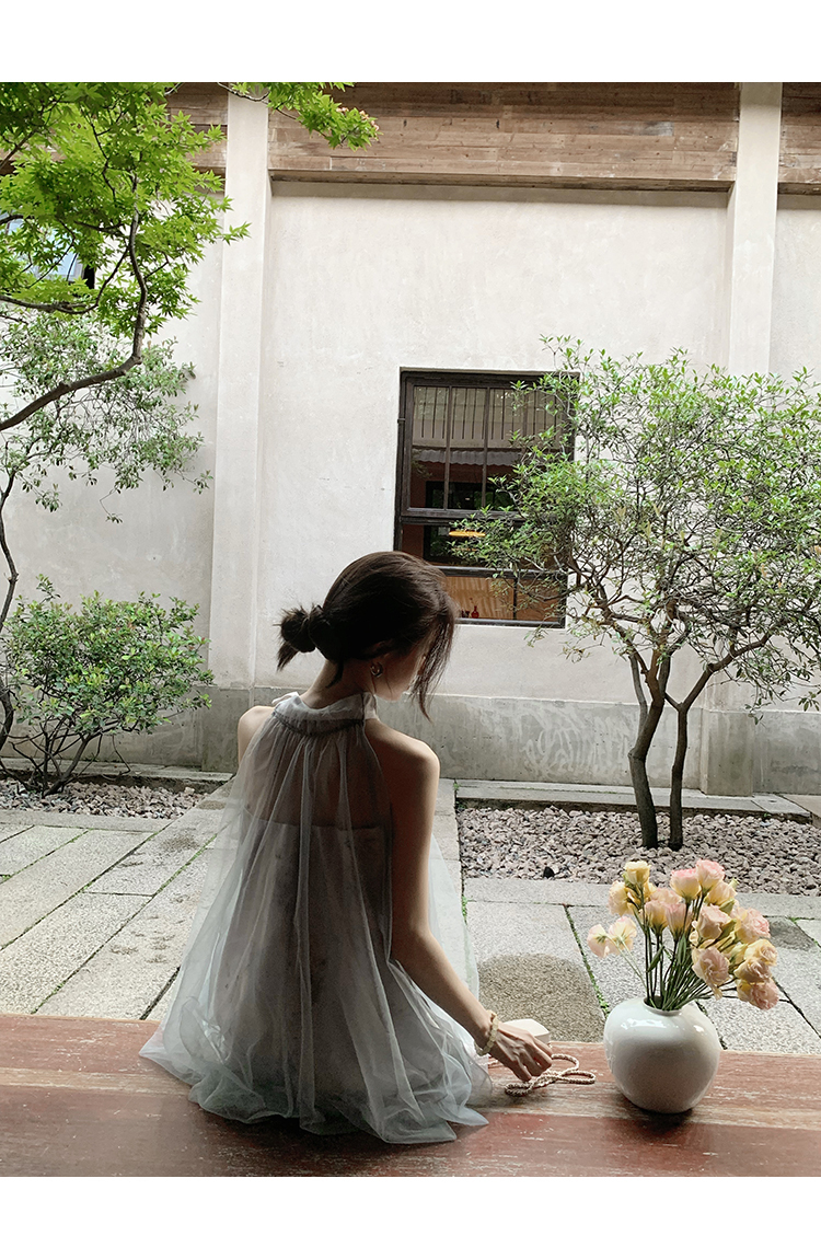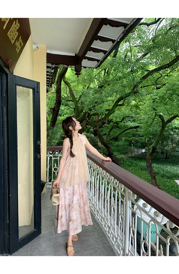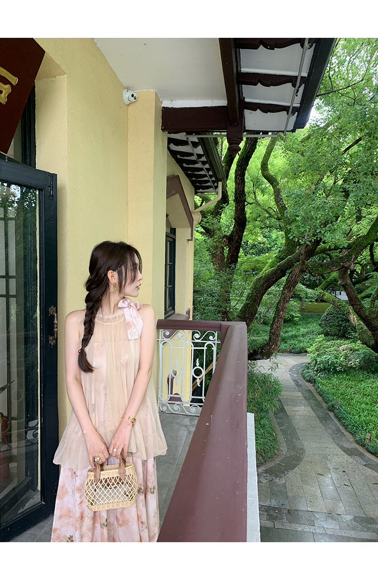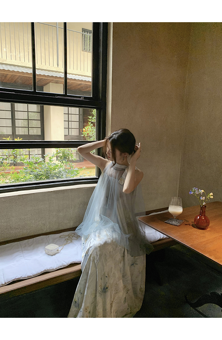 *o-ha-you*【FMQL2041026】Girlcore醉夢繁花新中式無袖連衣裙溫柔網紗拼接提花掛脖長裙洋裝