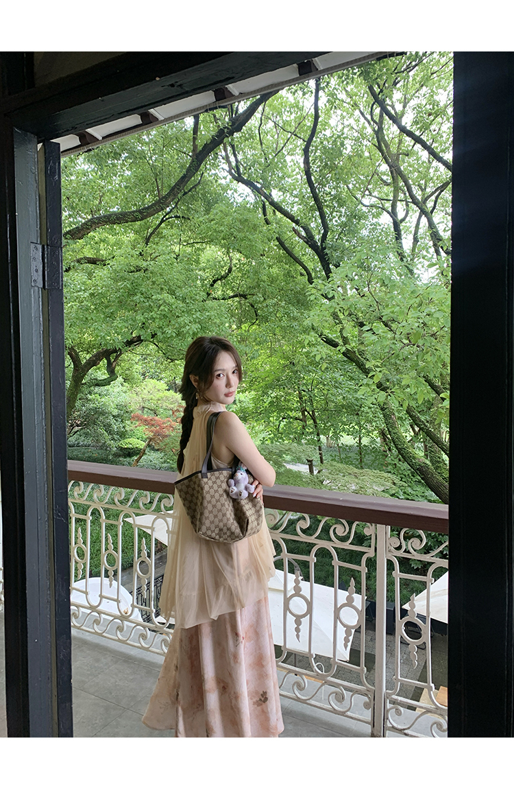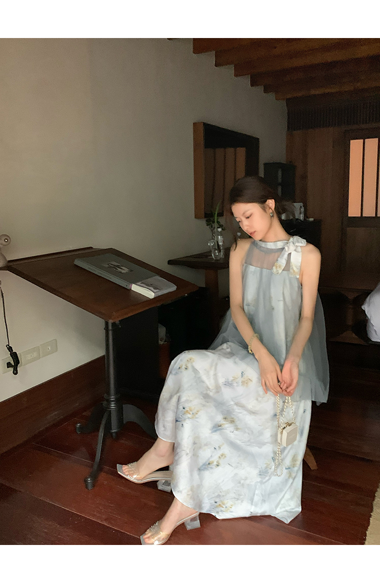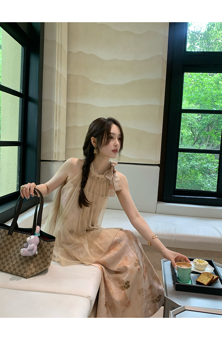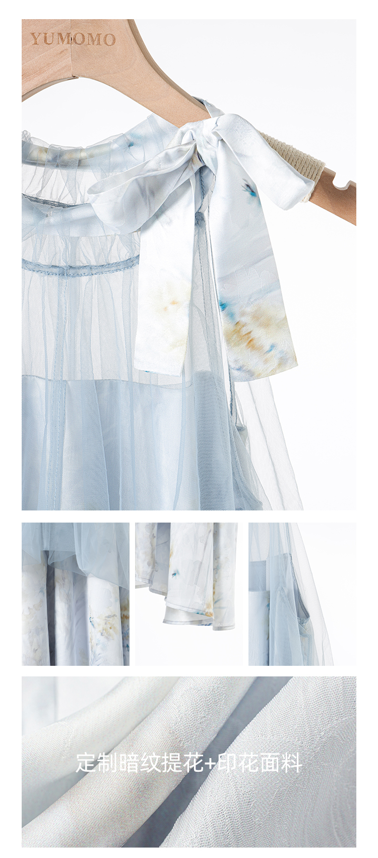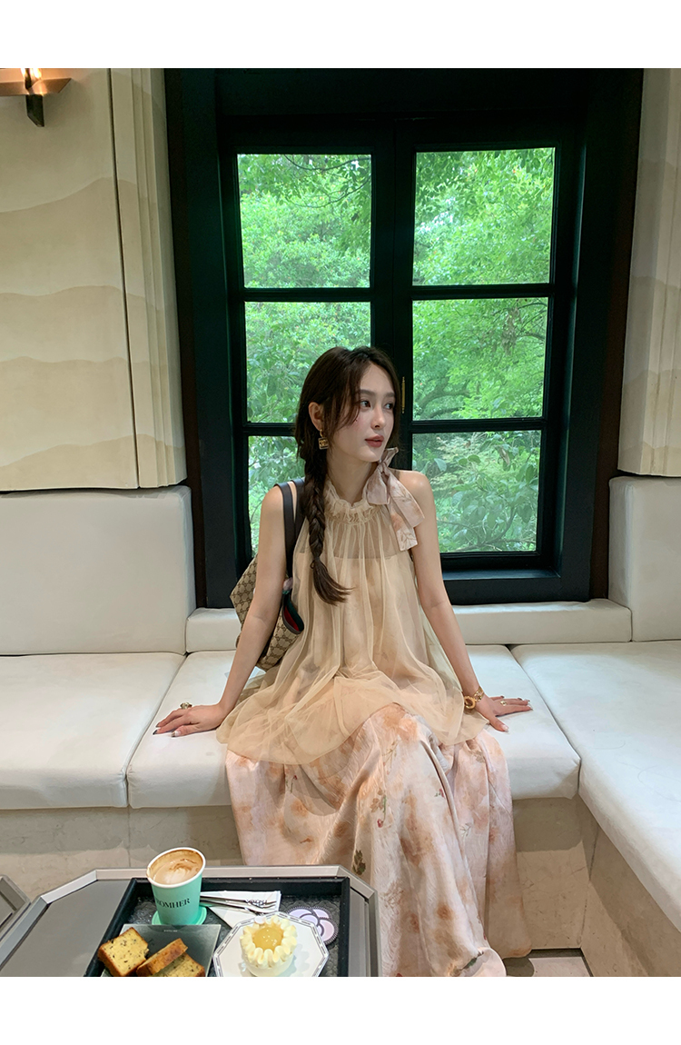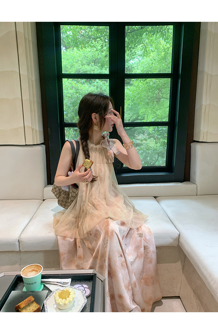 *o-ha-you*【FMQL2041026】Girlcore醉夢繁花新中式無袖連衣裙溫柔網紗拼接提花掛脖長裙洋裝