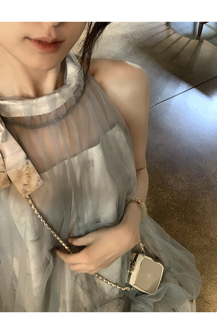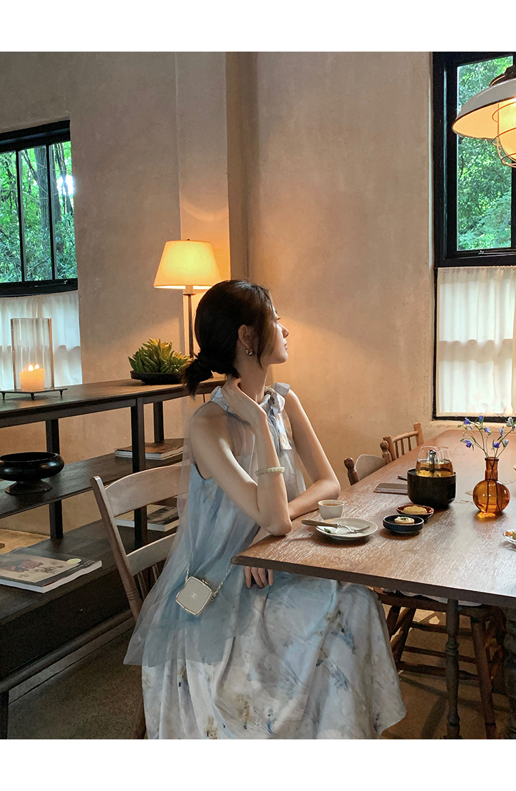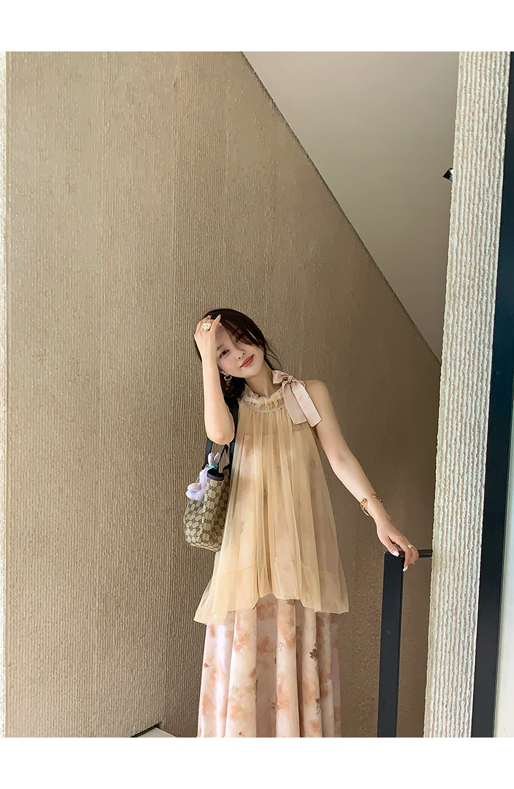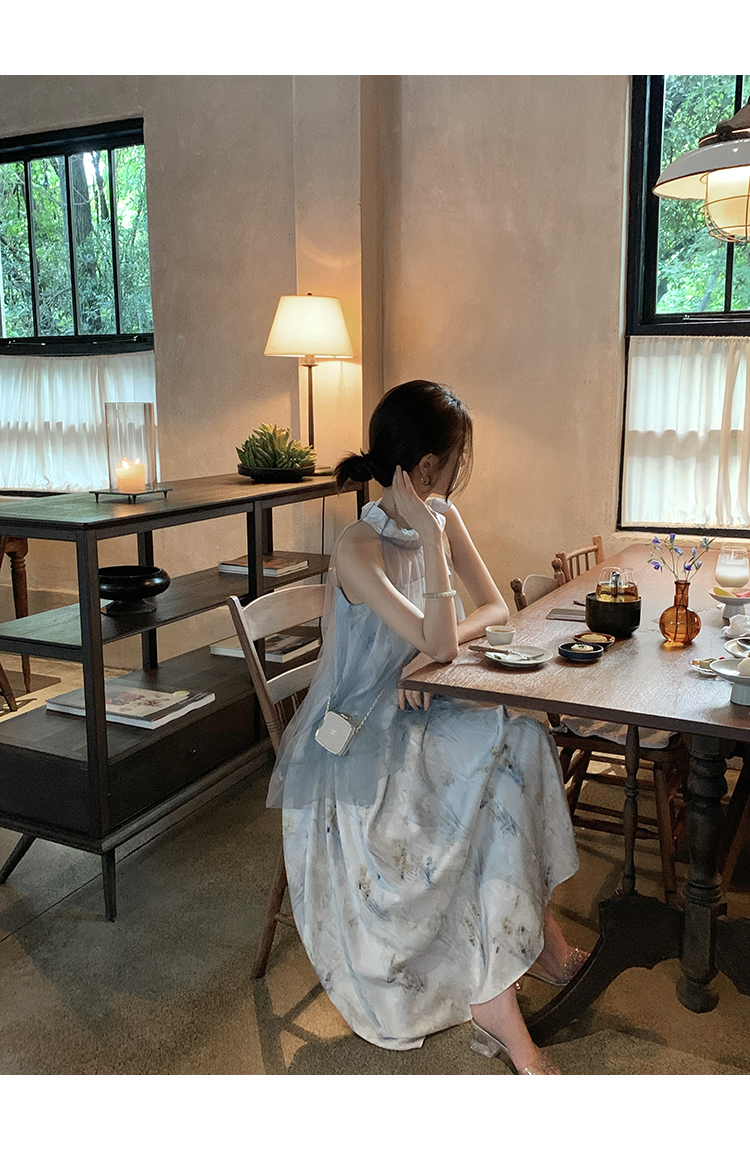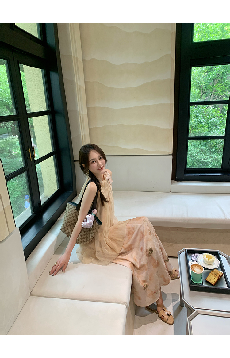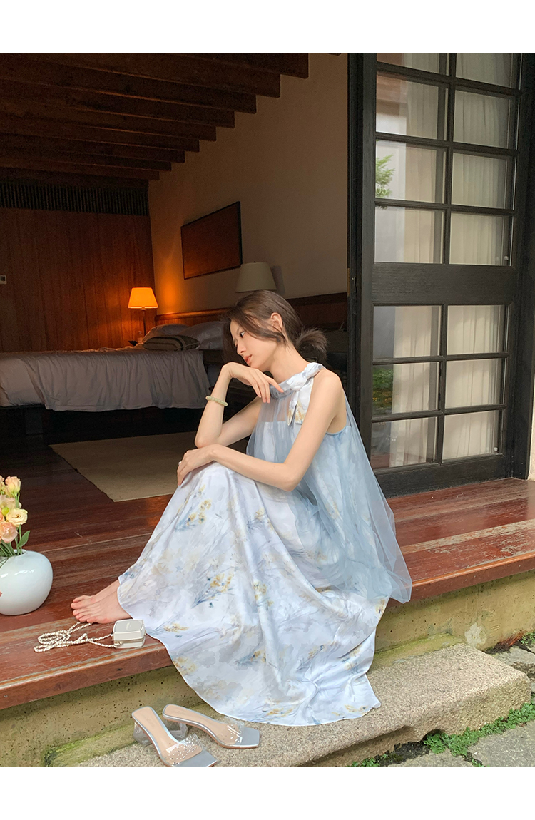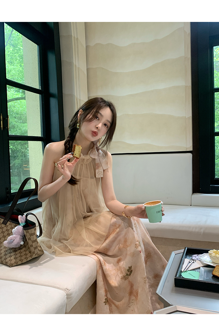 *o-ha-you*【FMQL2041026】Girlcore醉夢繁花新中式無袖連衣裙溫柔網紗拼接提花掛脖長裙洋裝