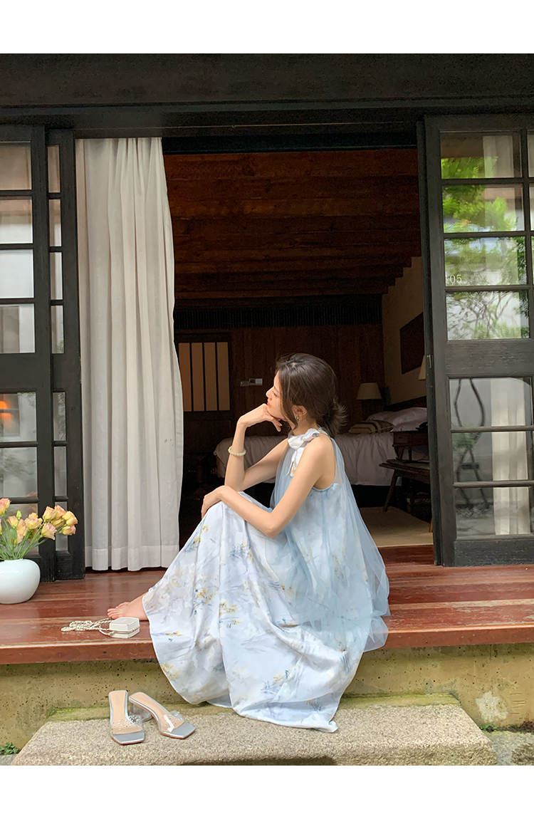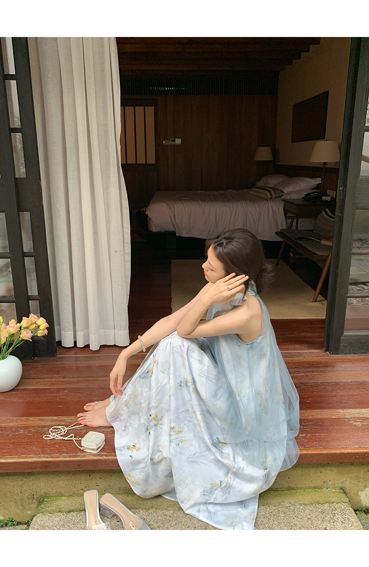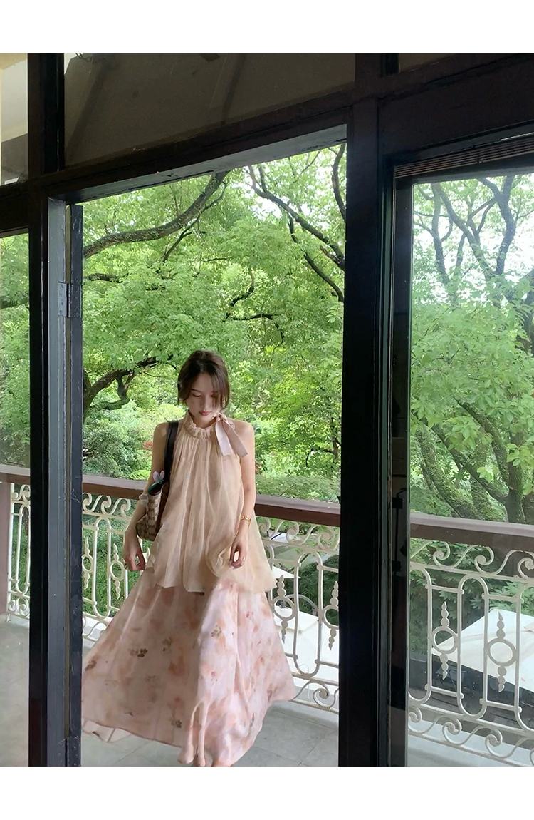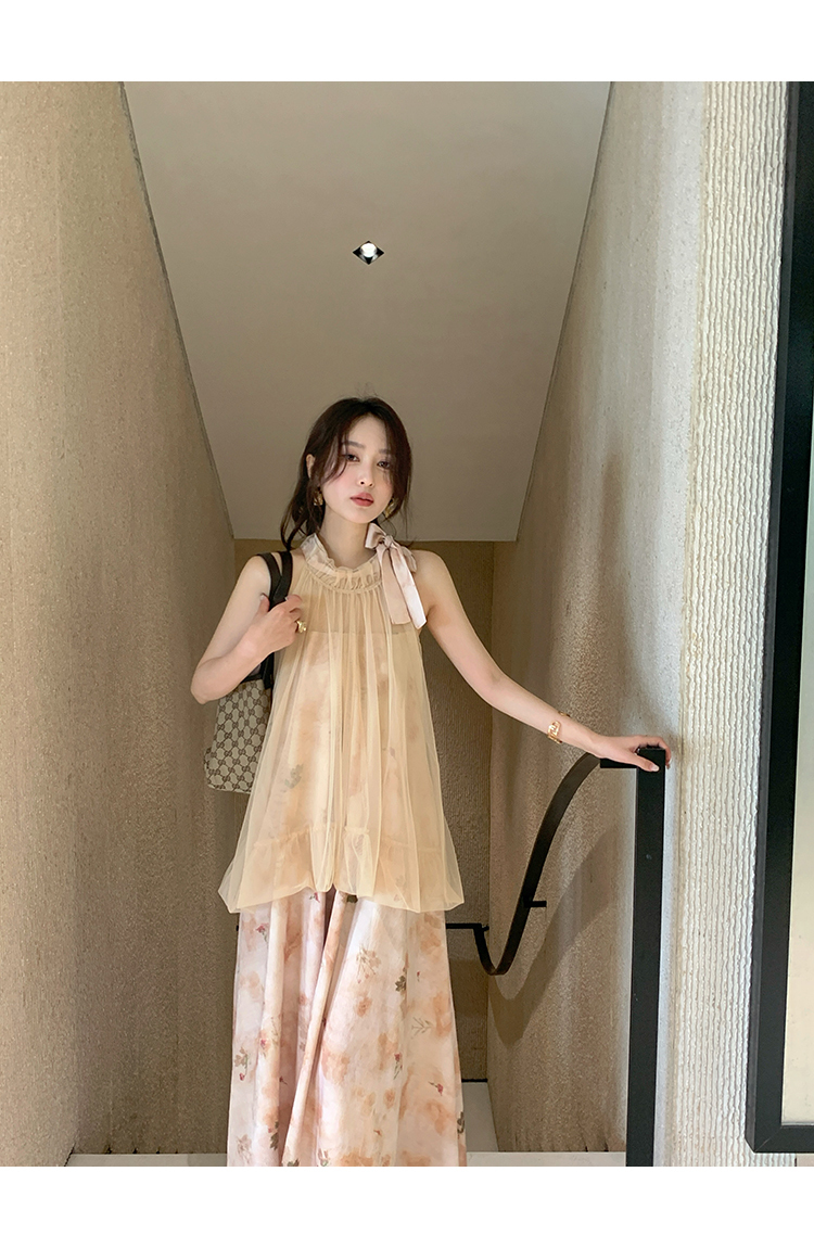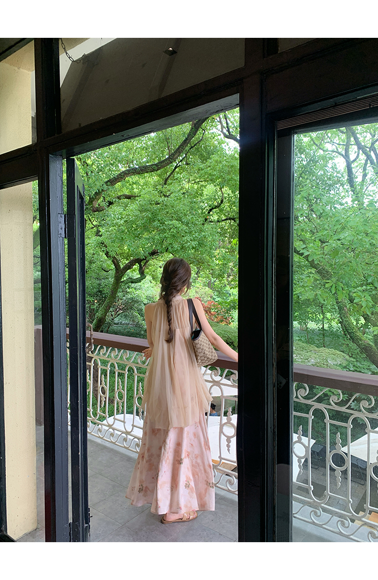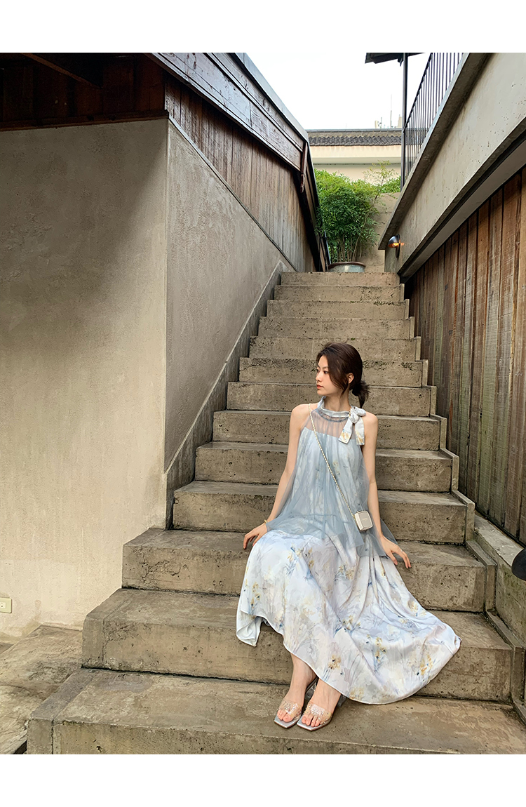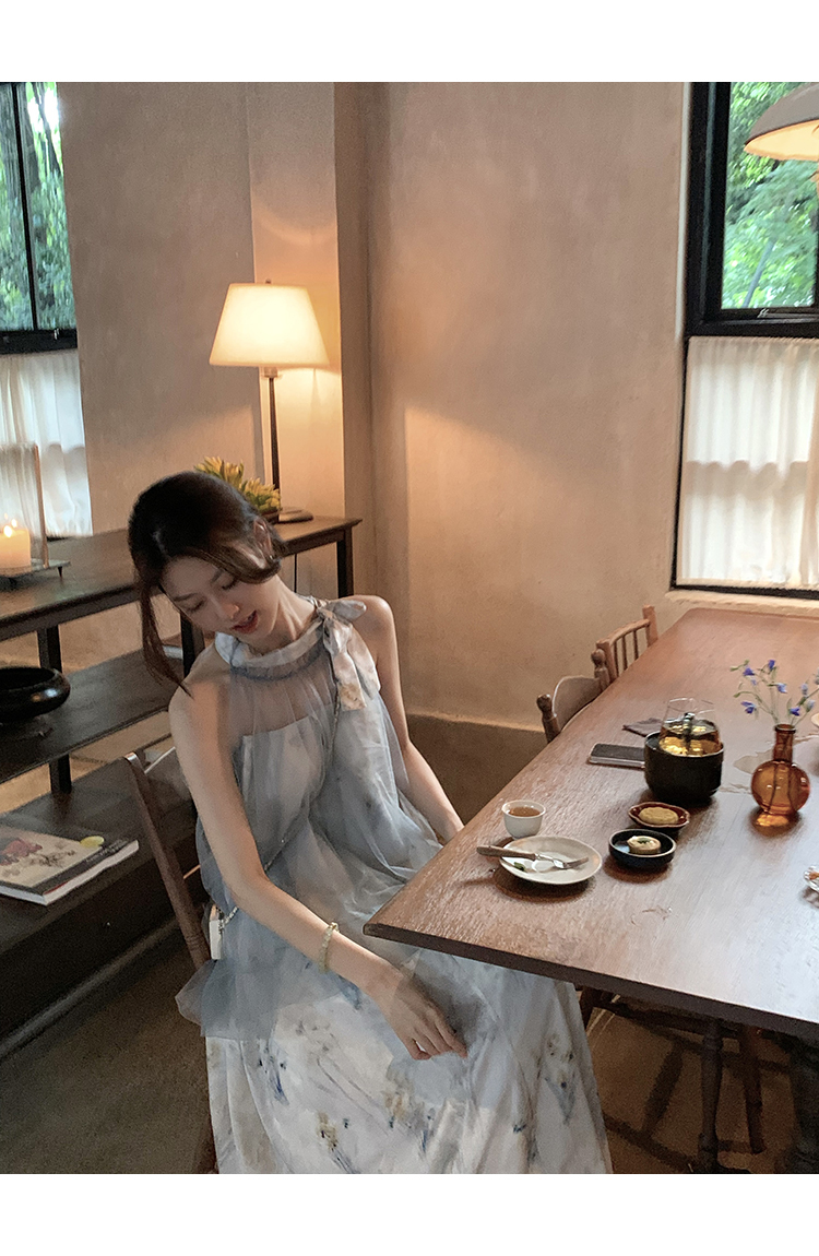 *o-ha-you*【FMQL2041026】Girlcore醉夢繁花新中式無袖連衣裙溫柔網紗拼接提花掛脖長裙洋裝