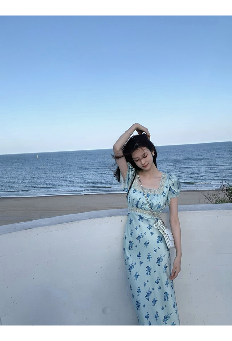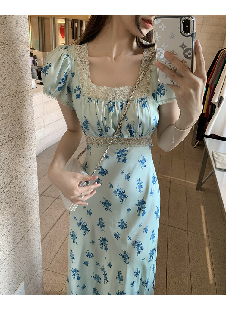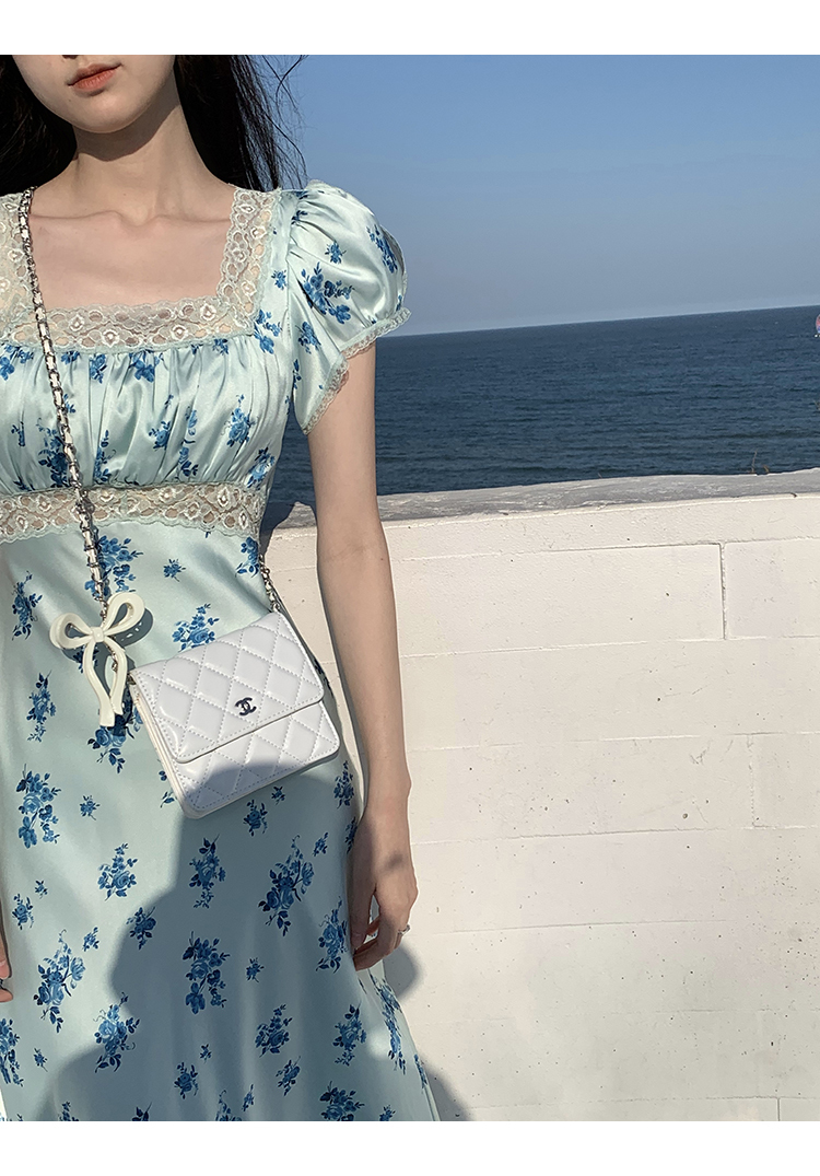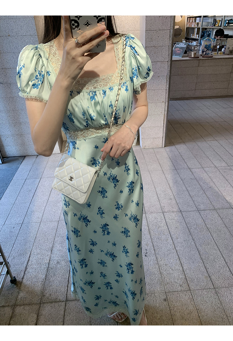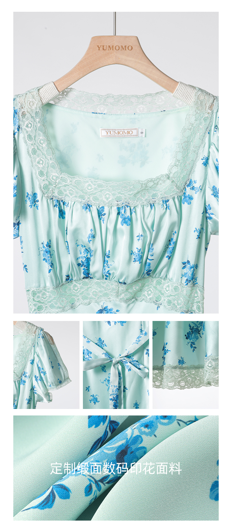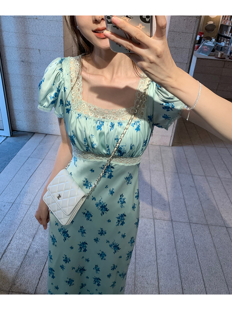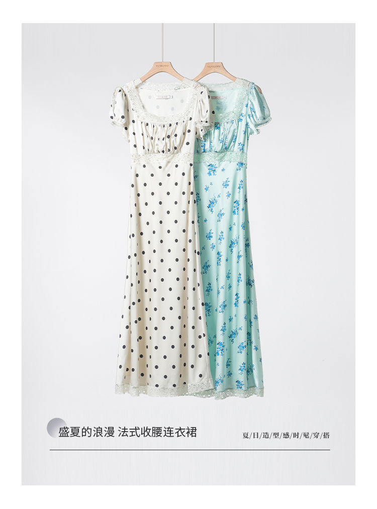 *o-ha-you*【FMQL2042026】盛夏的浪漫光澤緞面斜裁工藝法式修身顯瘦方領花邊印花連衣裙洋裝-2色