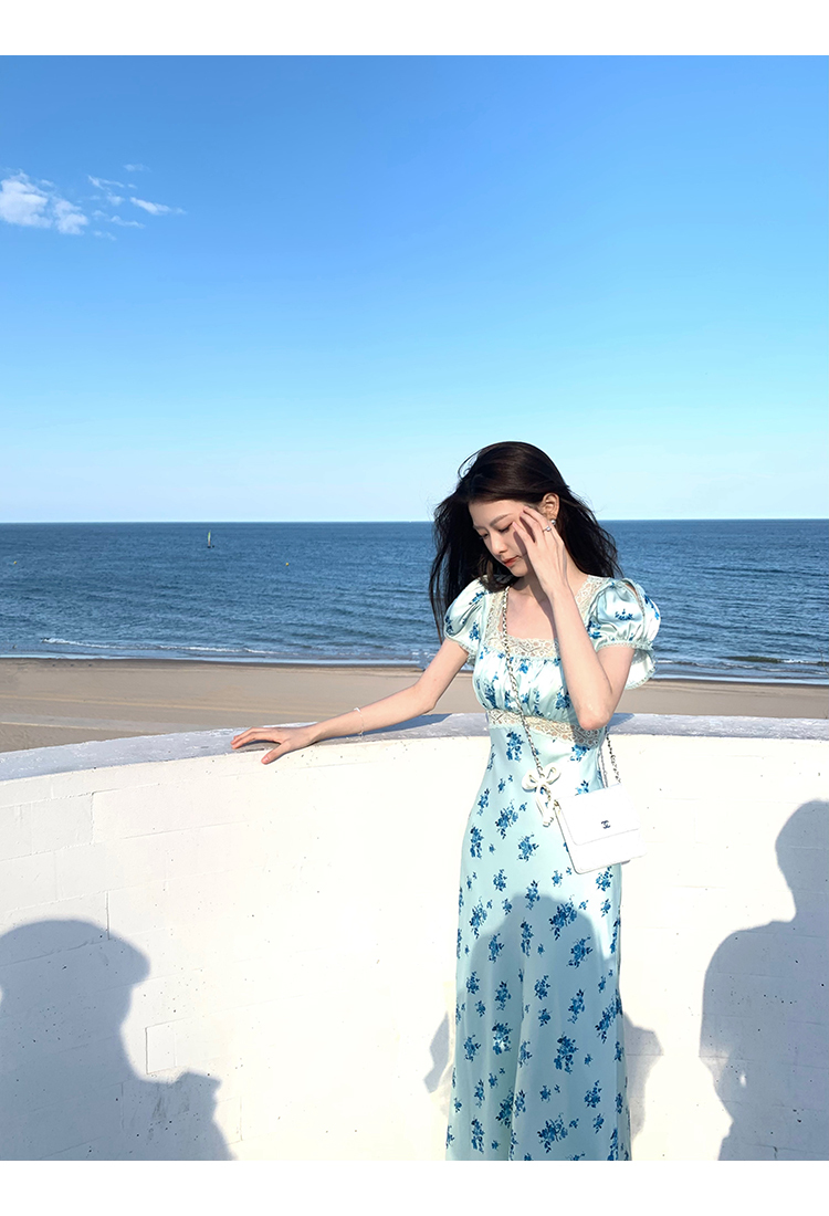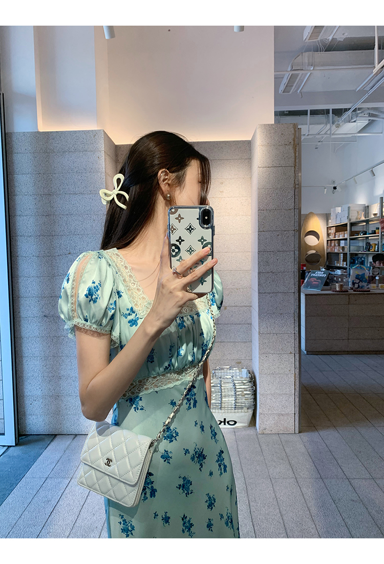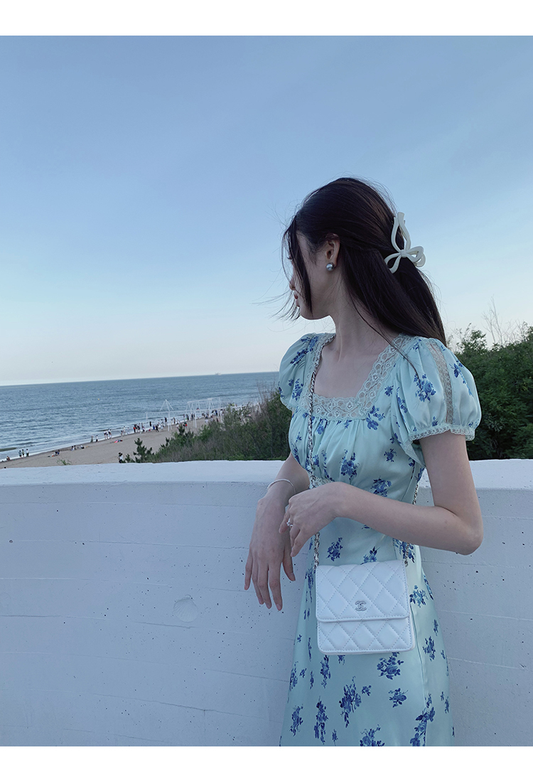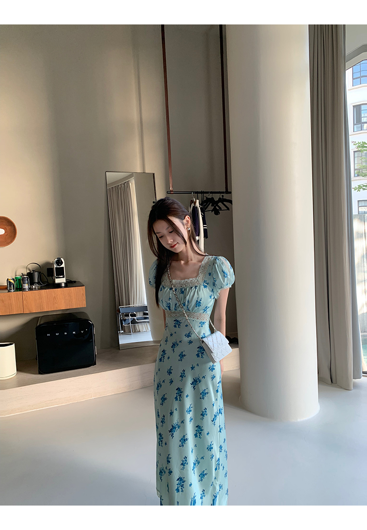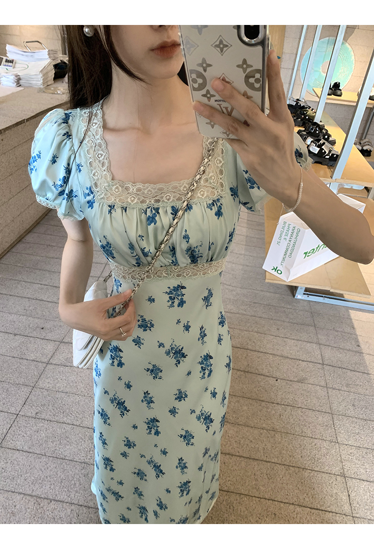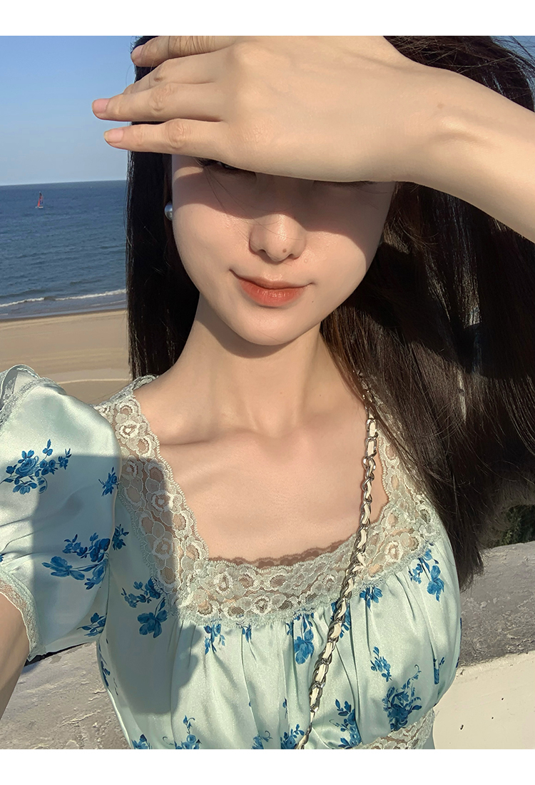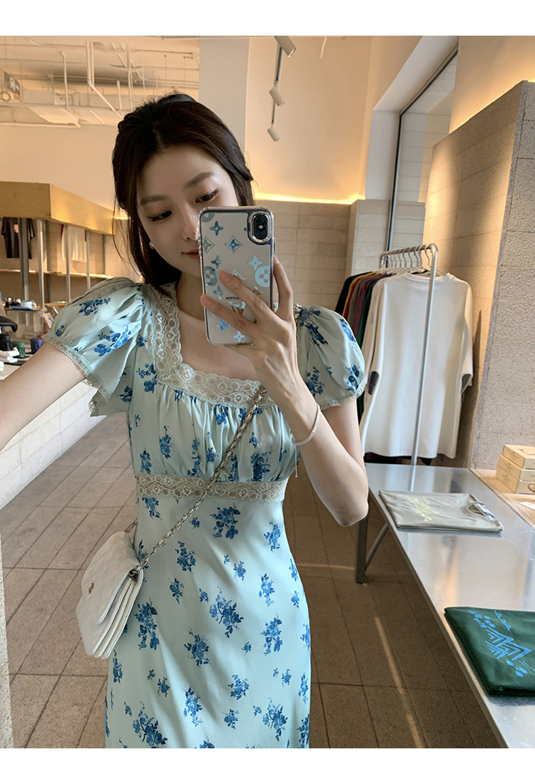 *o-ha-you*【FMQL2042026】盛夏的浪漫光澤緞面斜裁工藝法式修身顯瘦方領花邊印花連衣裙洋裝-2色