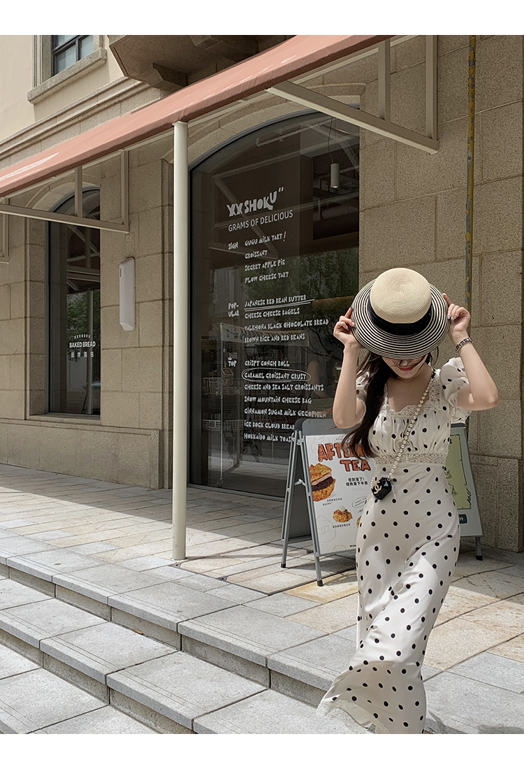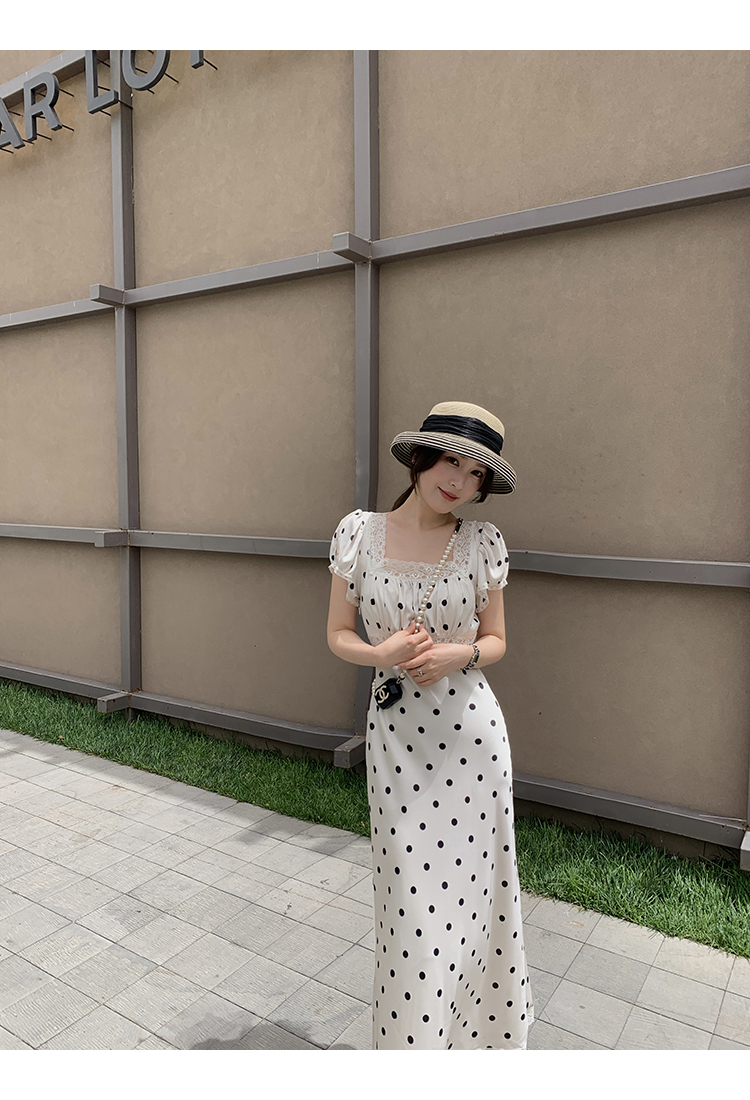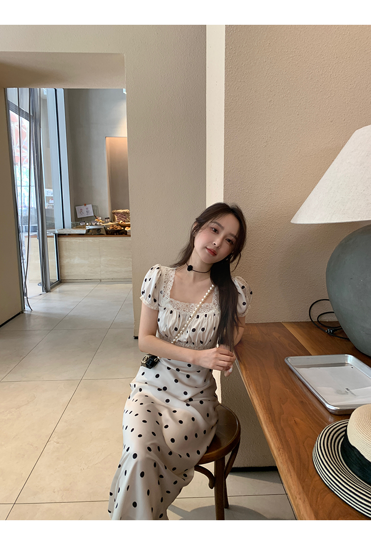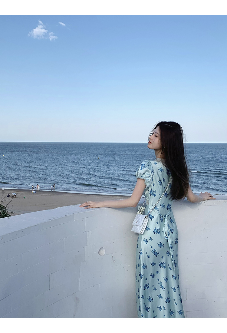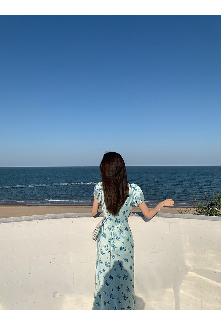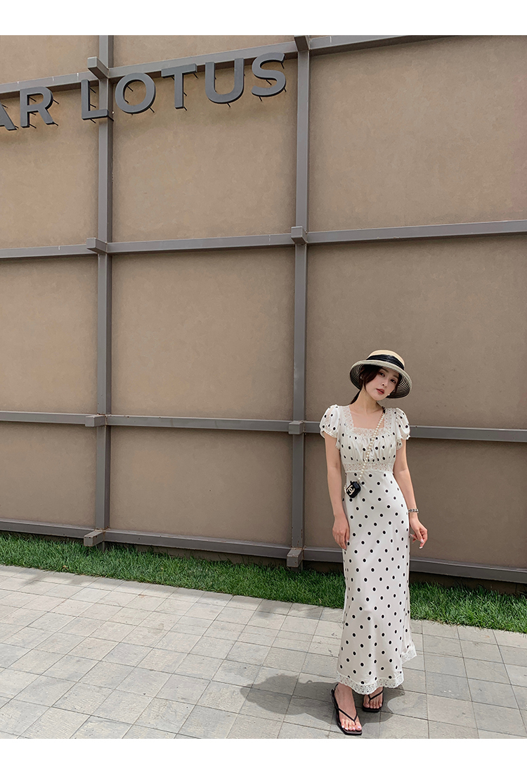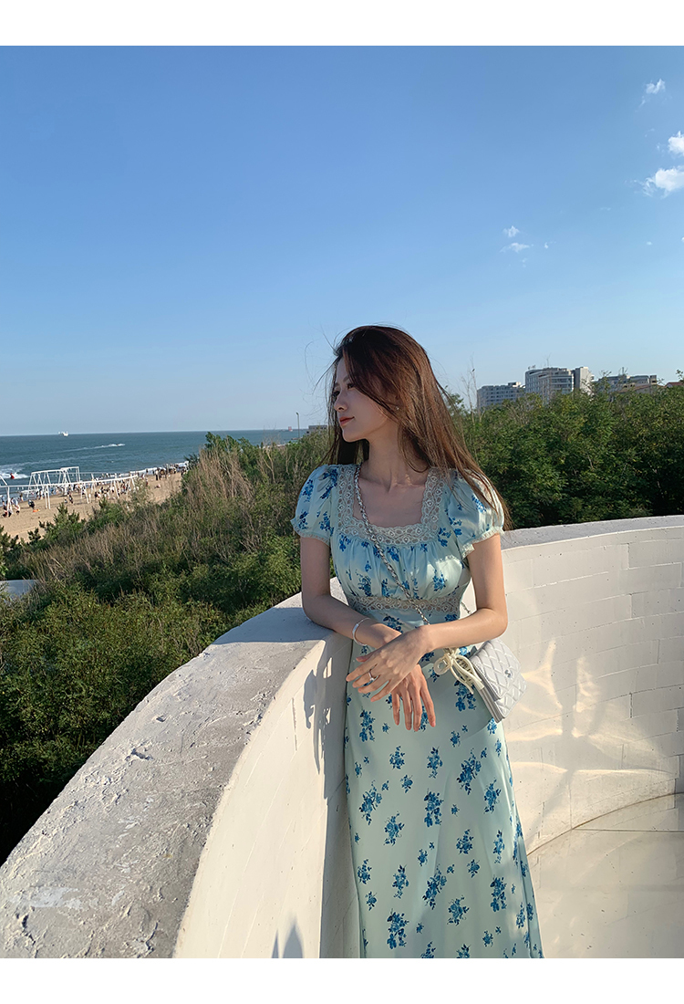 *o-ha-you*【FMQL2042026】盛夏的浪漫光澤緞面斜裁工藝法式修身顯瘦方領花邊印花連衣裙洋裝-2色