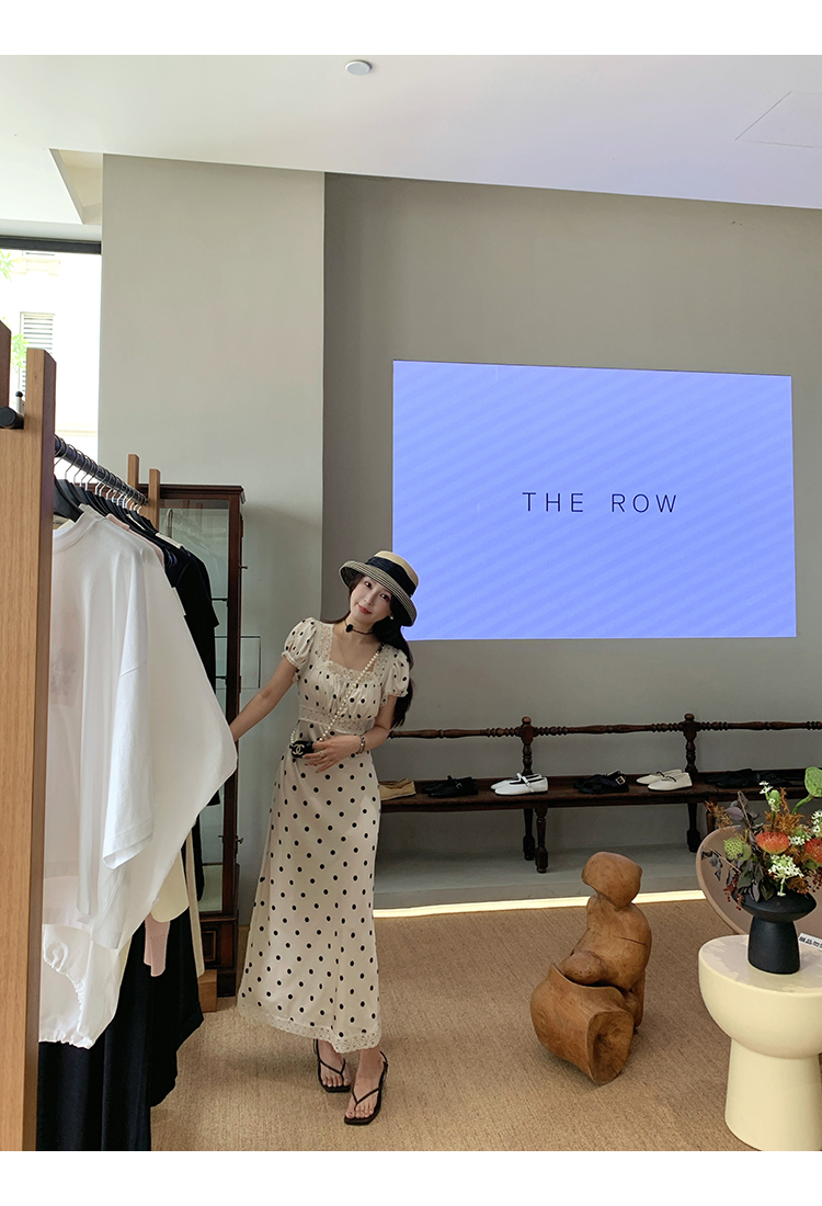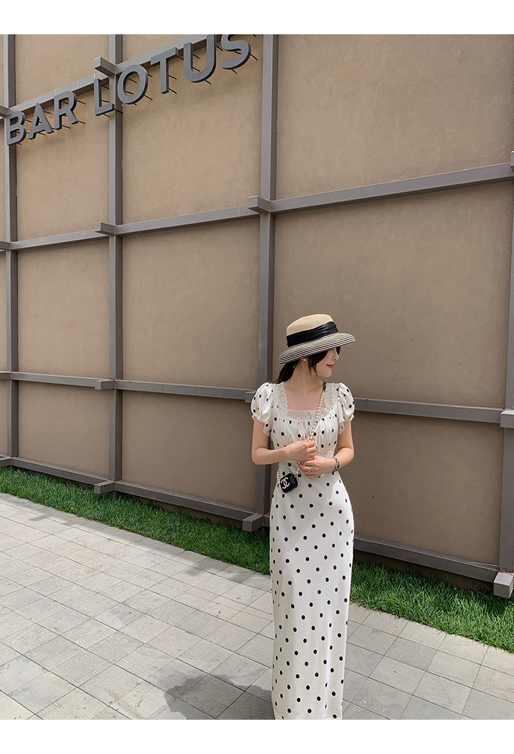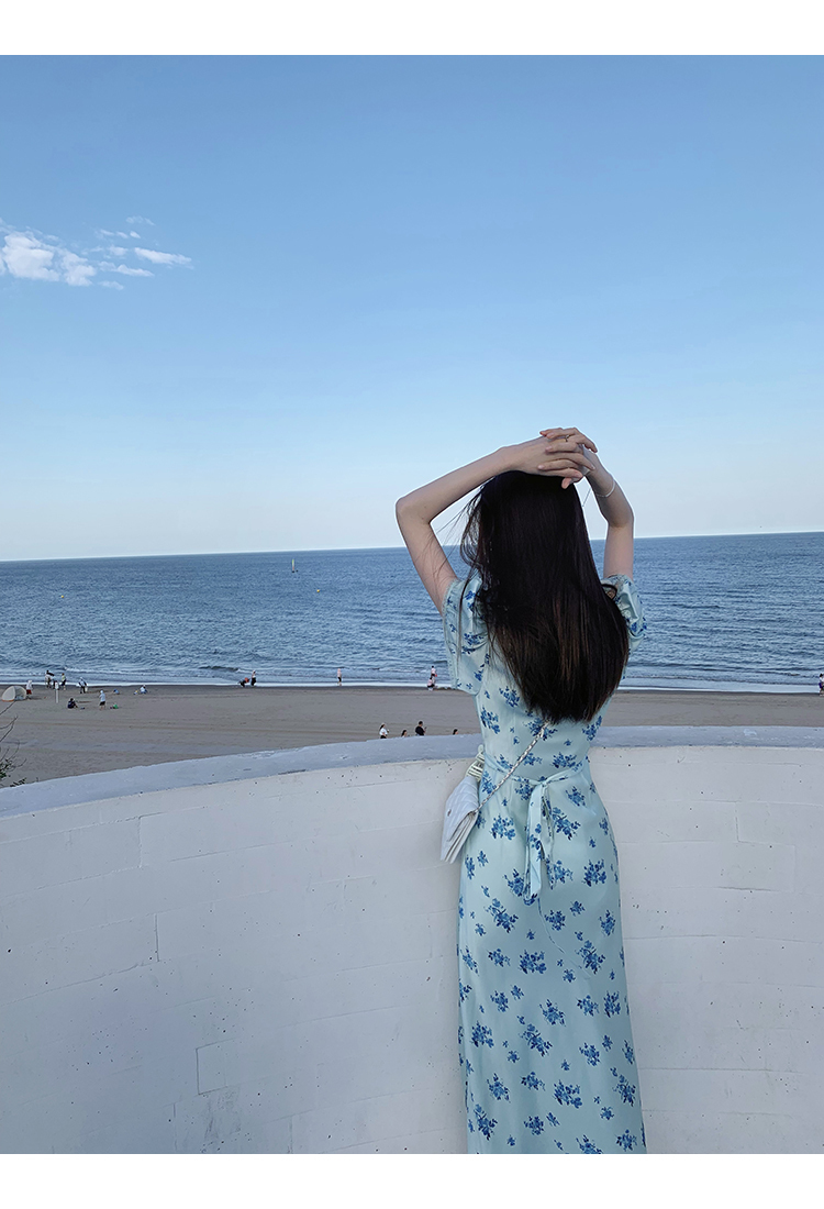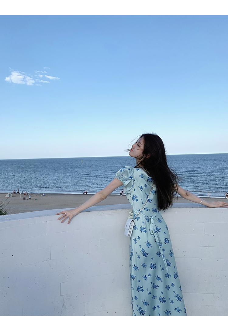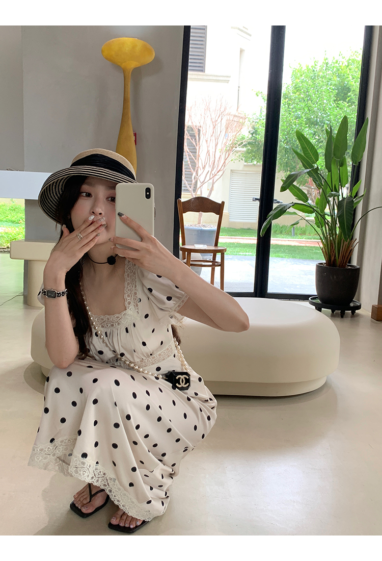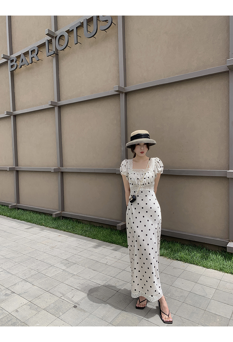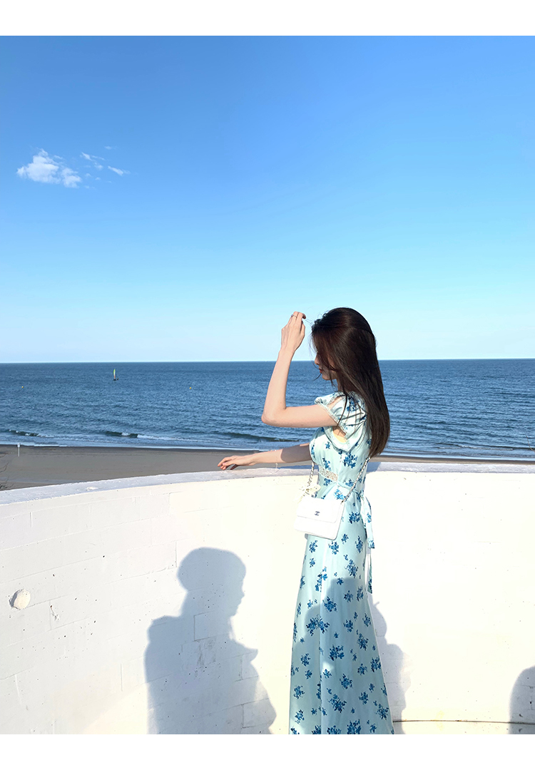 *o-ha-you*【FMQL2042026】盛夏的浪漫光澤緞面斜裁工藝法式修身顯瘦方領花邊印花連衣裙洋裝-2色