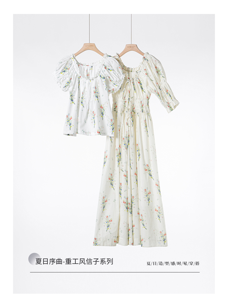 布料成本高、訂製週期長,用料捨得,印花是白底紅綠色調的花束印花,