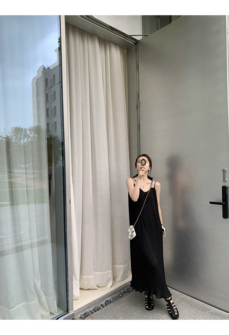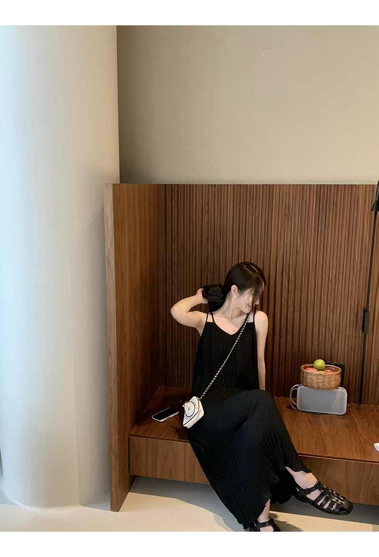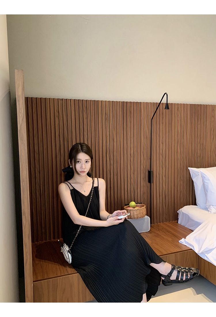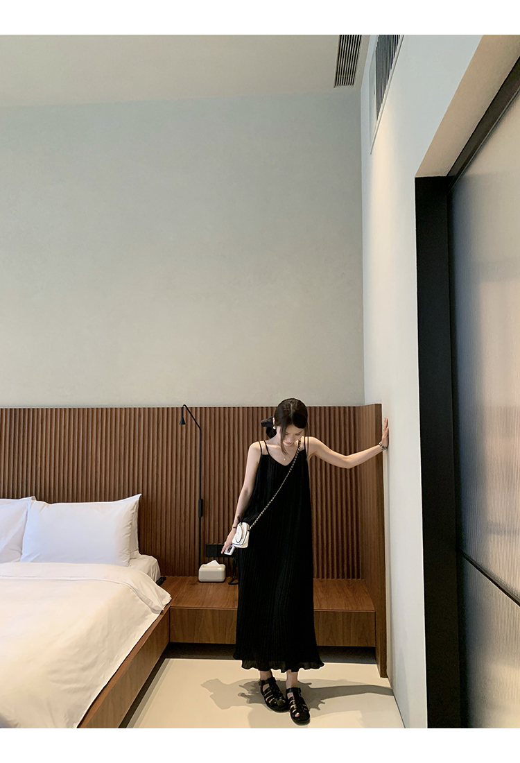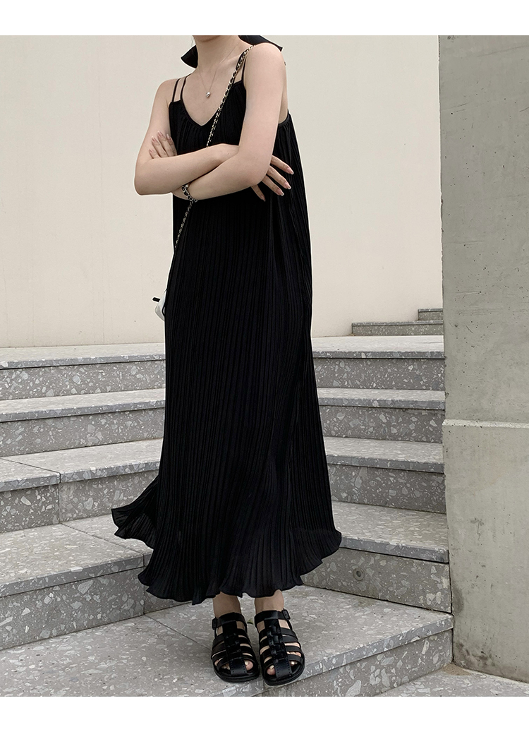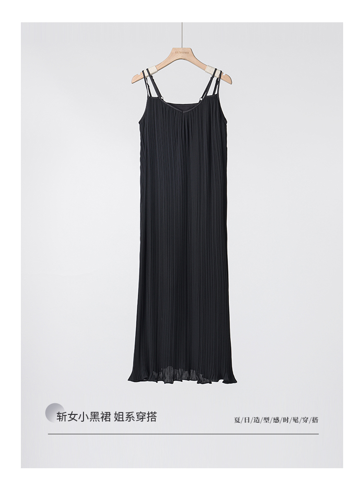 *o-ha-you*【FMQL2042048】斬女小黑裙姐系穿搭輕熟紙片人細牙籤褶寬鬆顯瘦吊帶裙洋裝