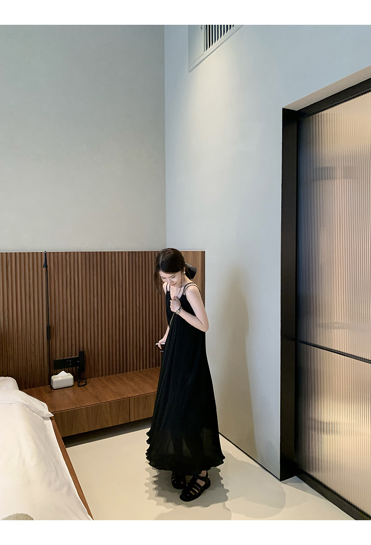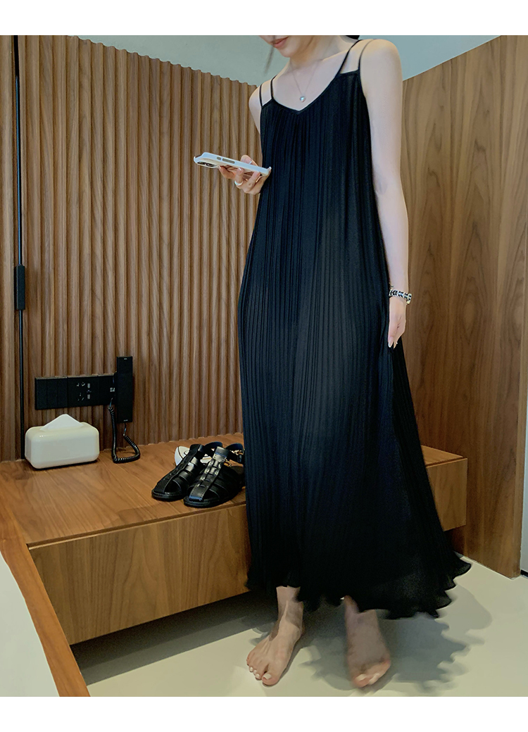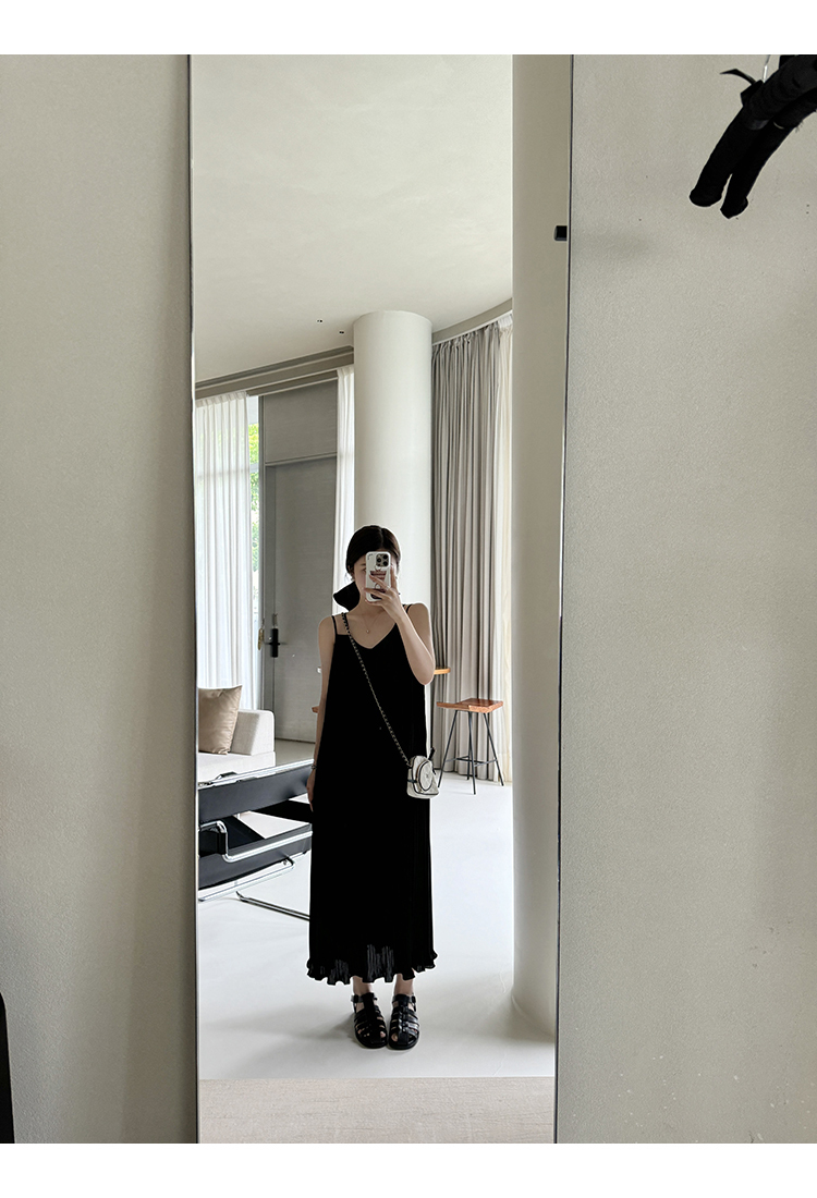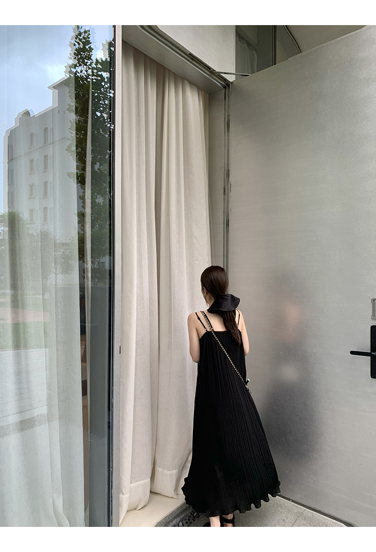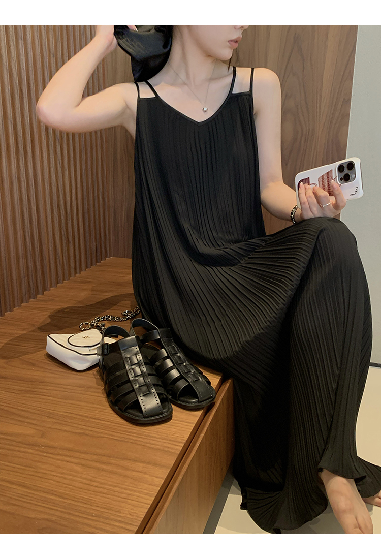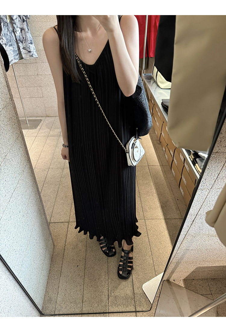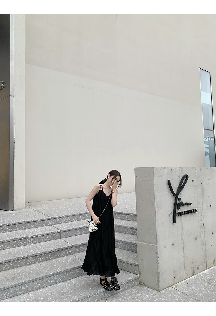 *o-ha-you*【FMQL2042048】斬女小黑裙姐系穿搭輕熟紙片人細牙籤褶寬鬆顯瘦吊帶裙洋裝