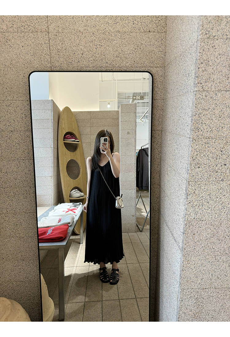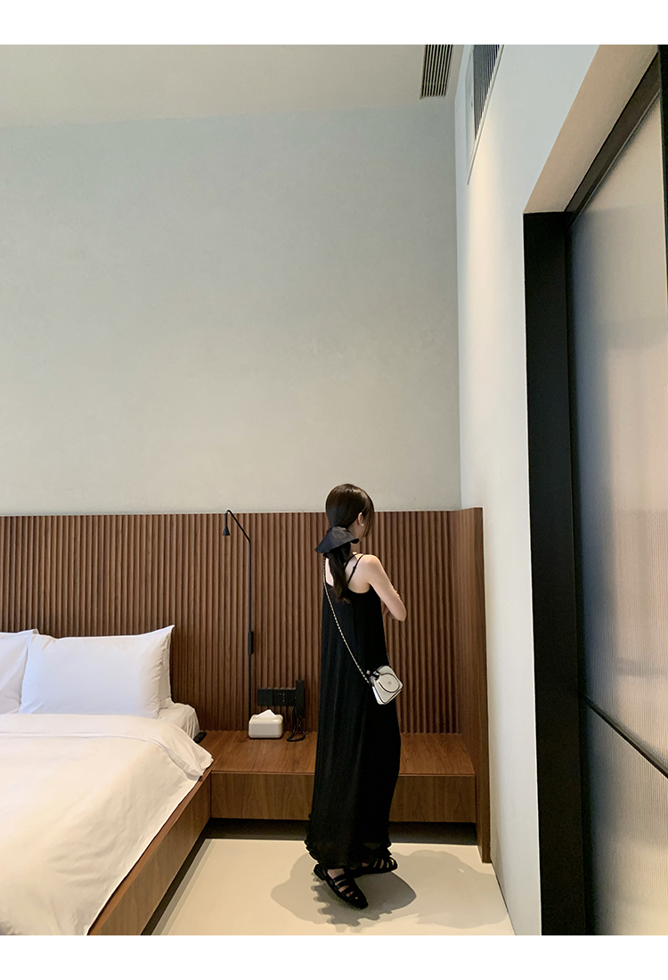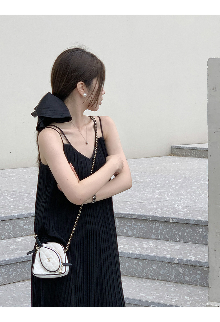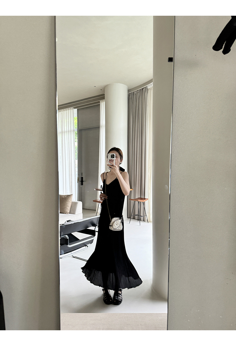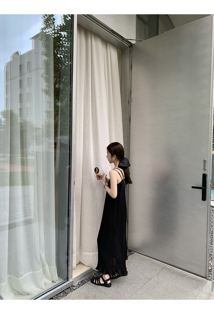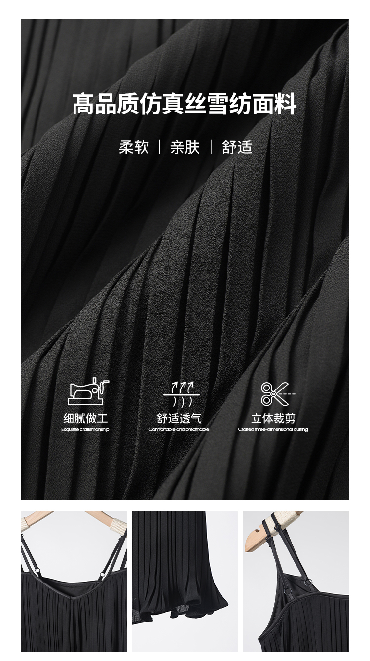 *o-ha-you*【FMQL2042048】斬女小黑裙姐系穿搭輕熟紙片人細牙籤褶寬鬆顯瘦吊帶裙洋裝