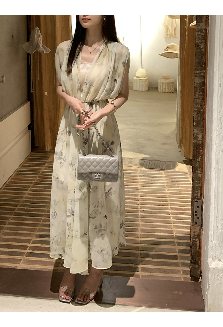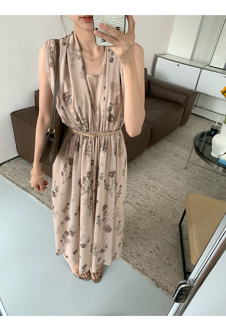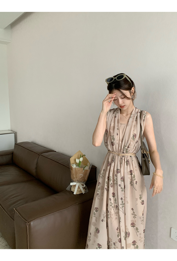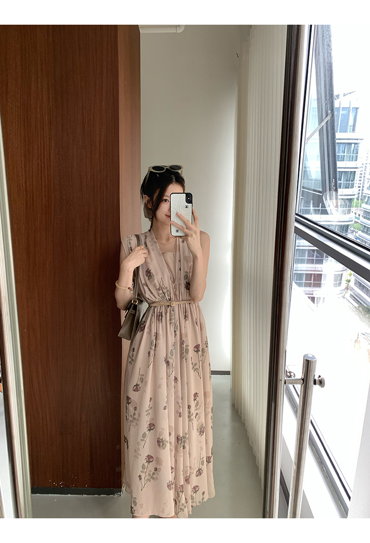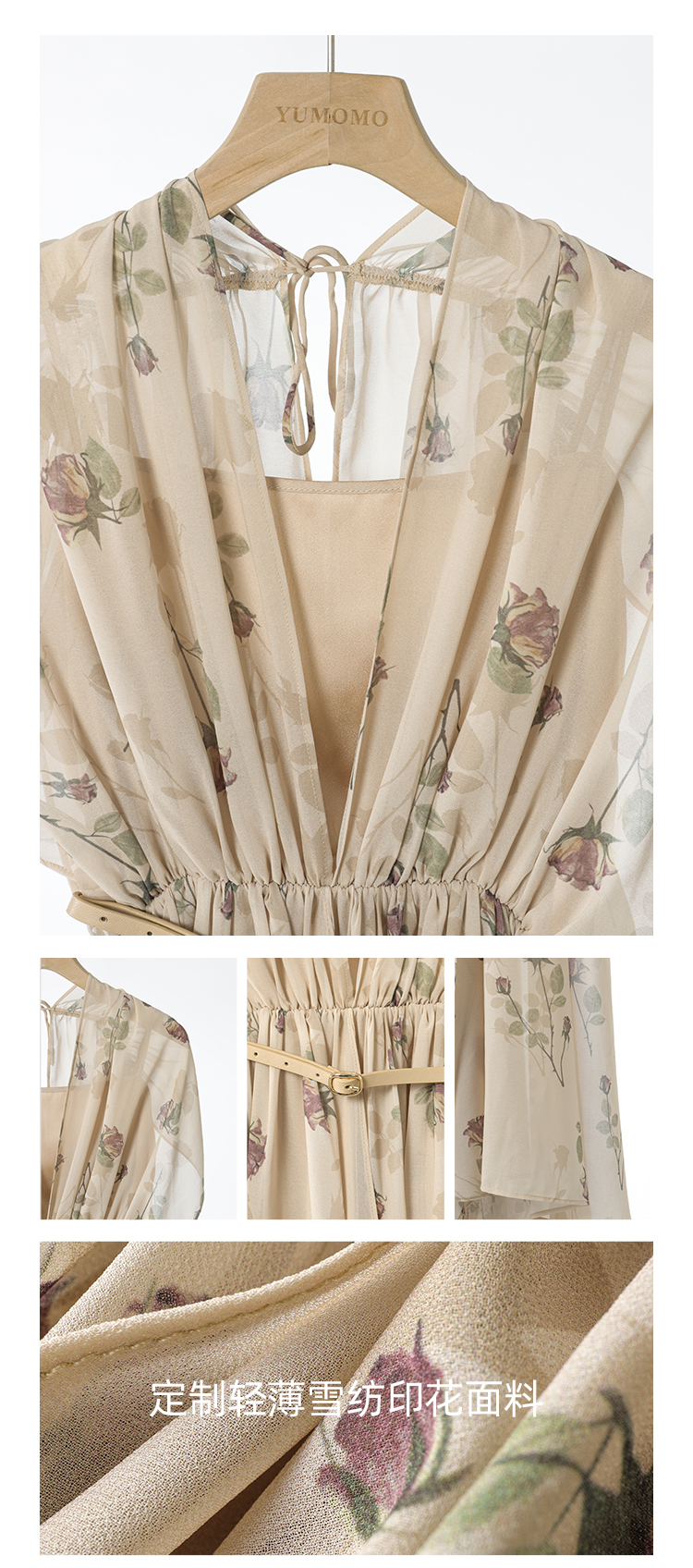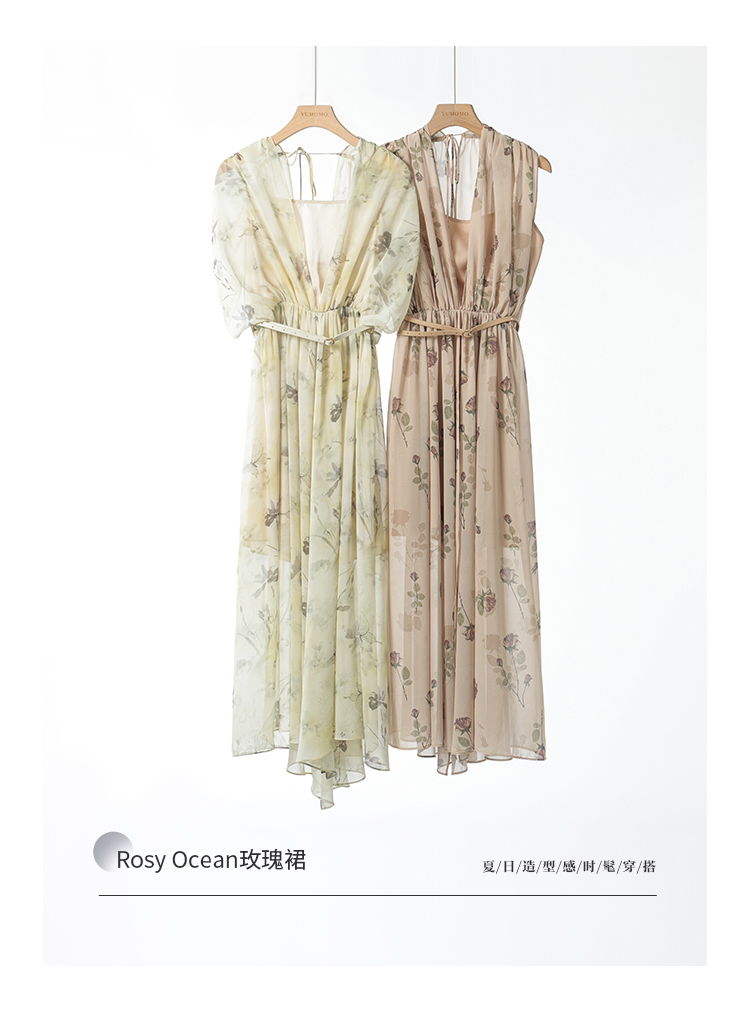 *o-ha-you*【FMQL2042076】Rosy Ocean玫瑰裙夏日繁花裙飄逸仙氣V領顯瘦腰帶連衣裙洋裝
