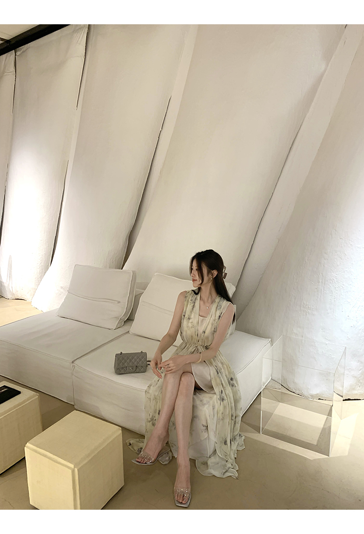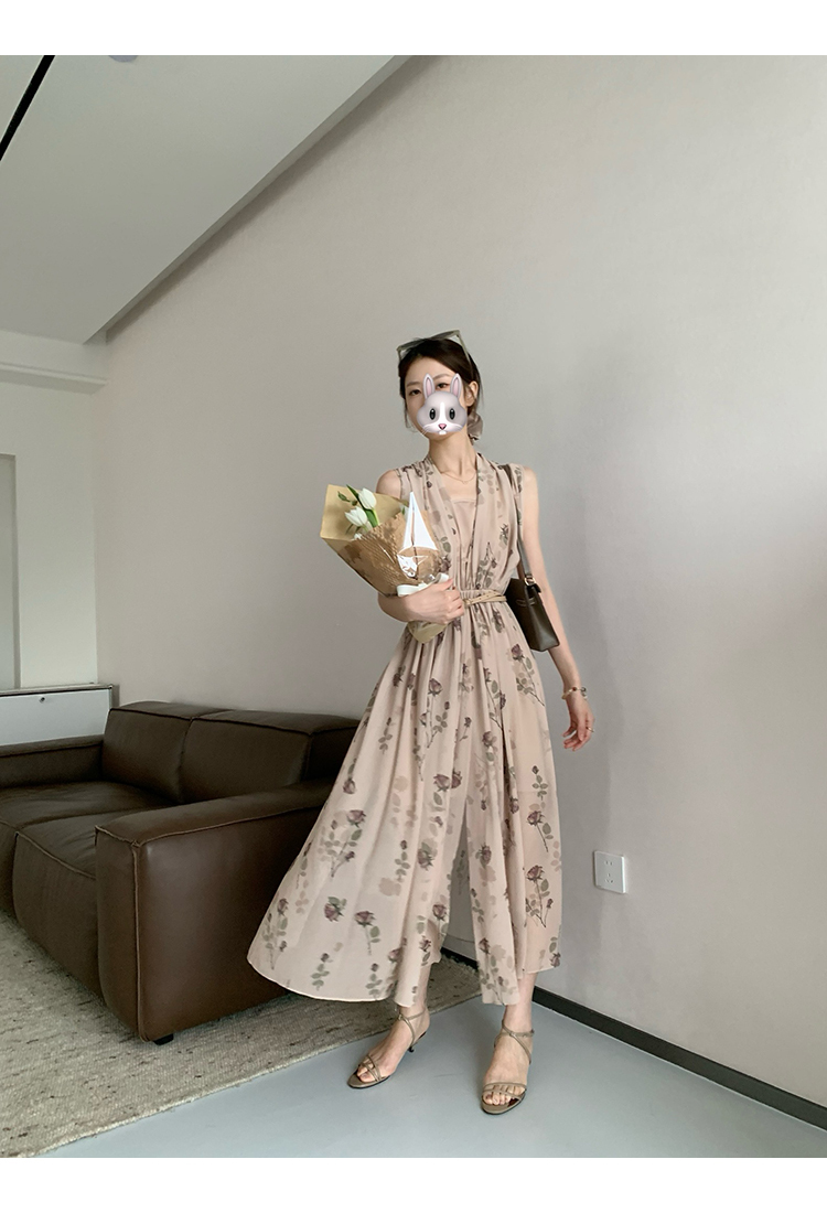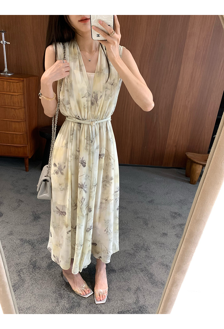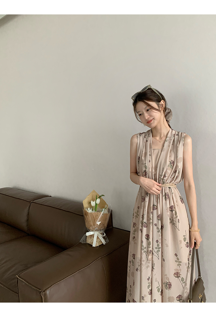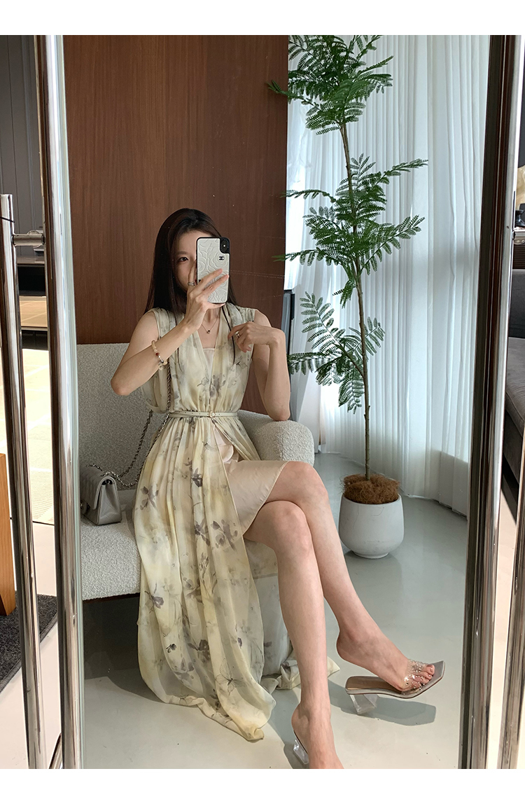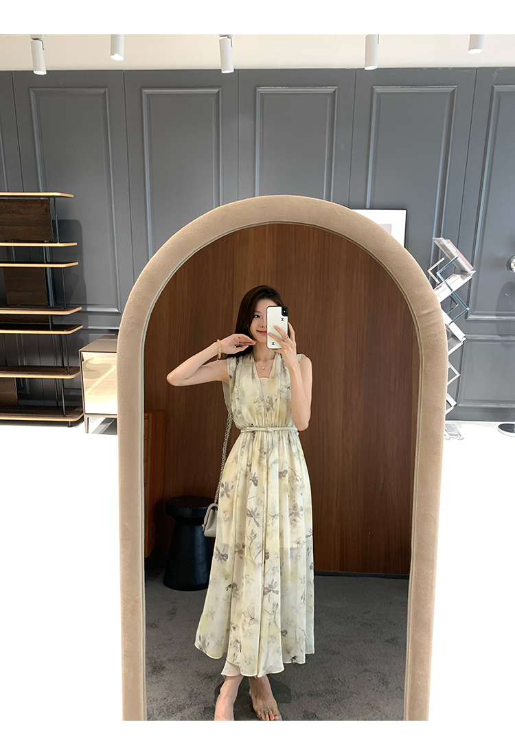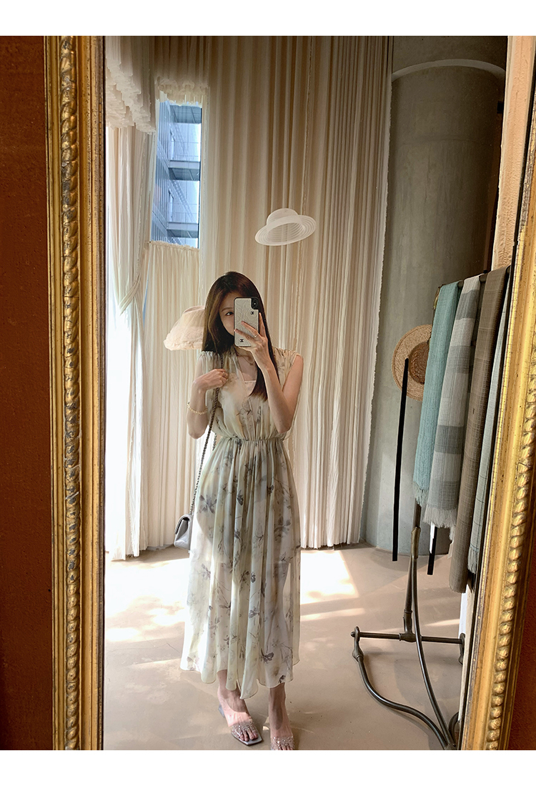 *o-ha-you*【FMQL2042076】Rosy Ocean玫瑰裙夏日繁花裙飄逸仙氣V領顯瘦腰帶連衣裙洋裝