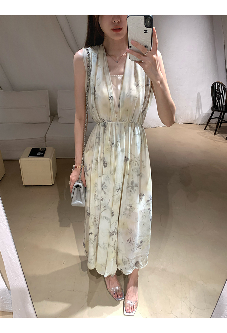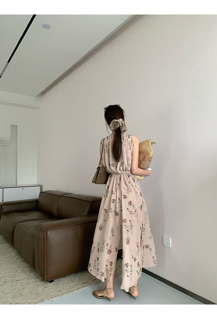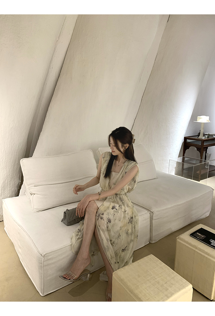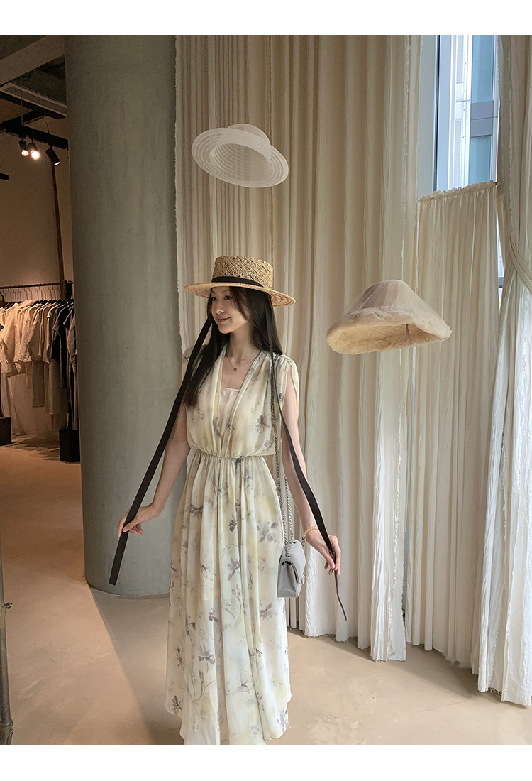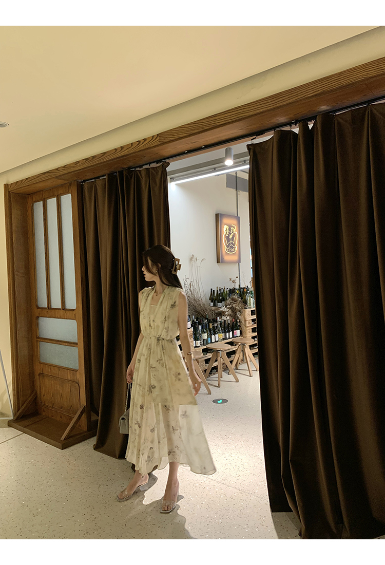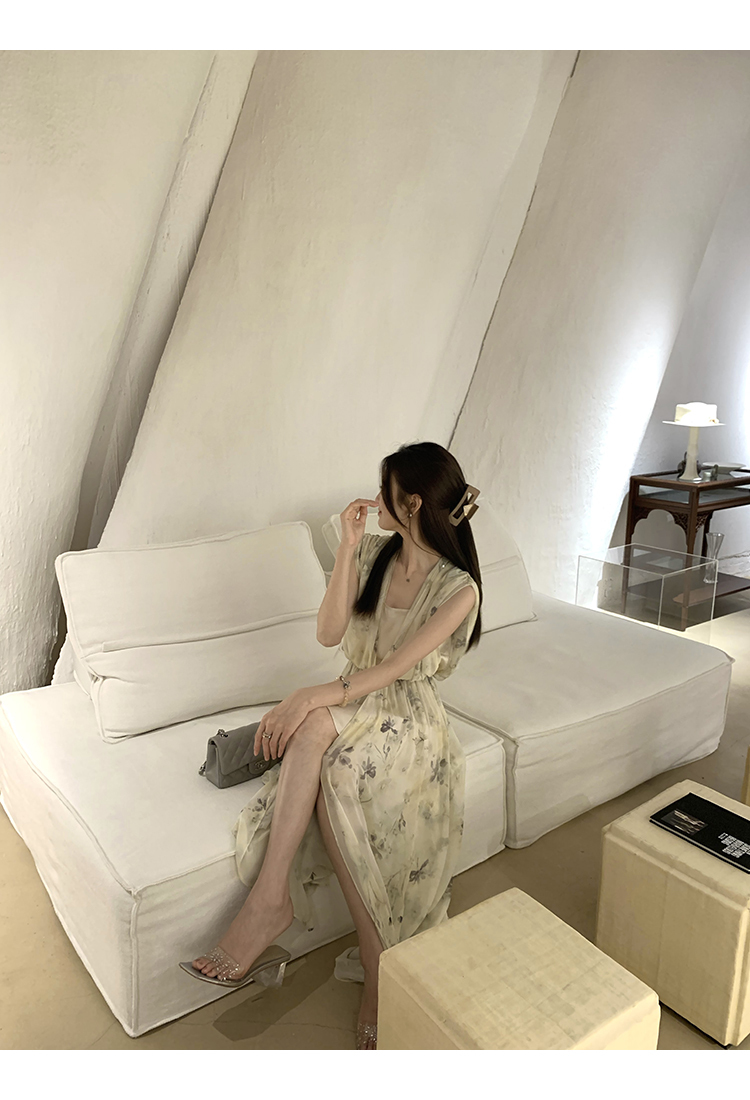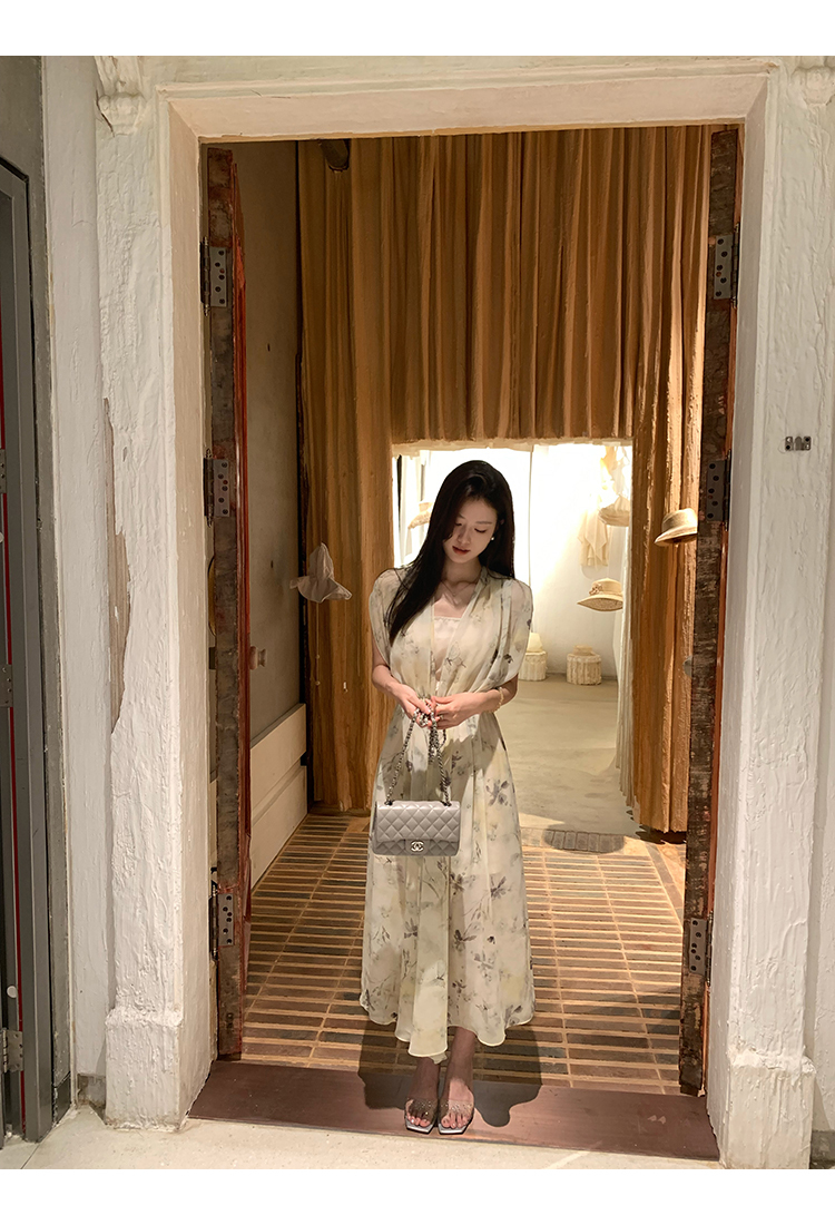 *o-ha-you*【FMQL2042076】Rosy Ocean玫瑰裙夏日繁花裙飄逸仙氣V領顯瘦腰帶連衣裙洋裝