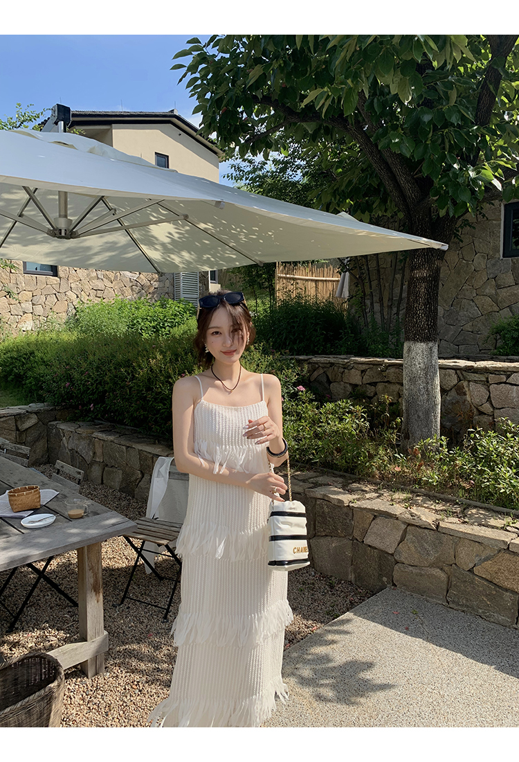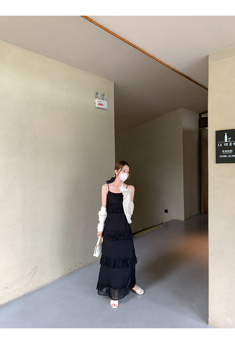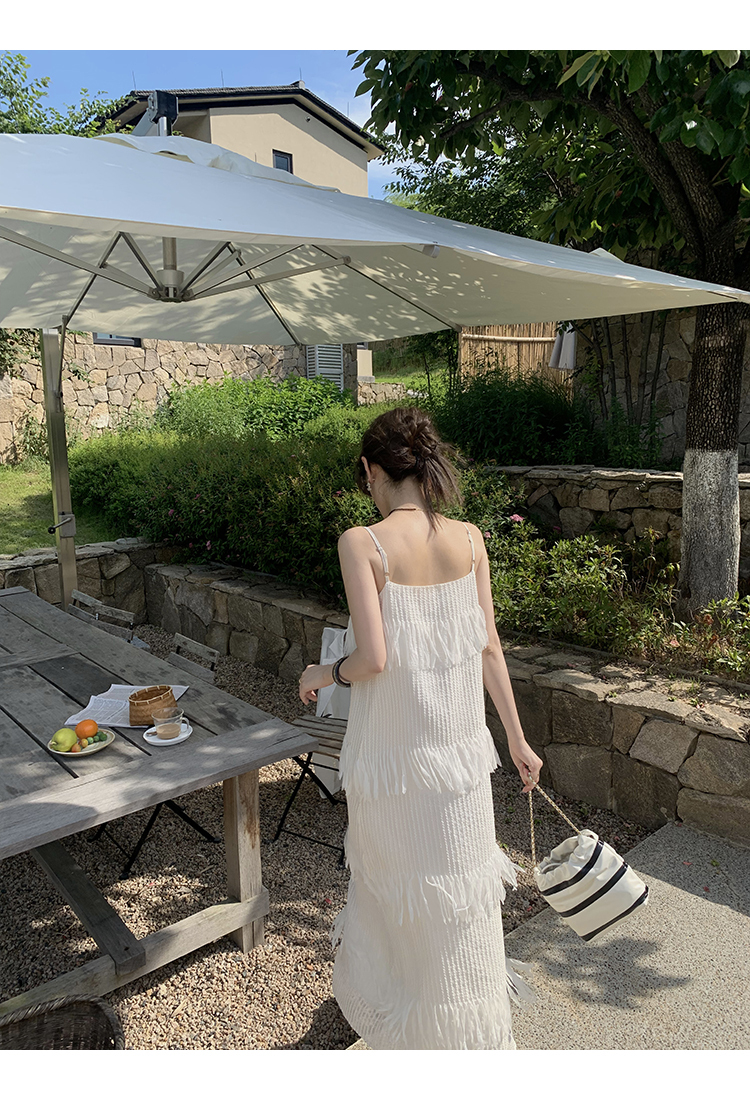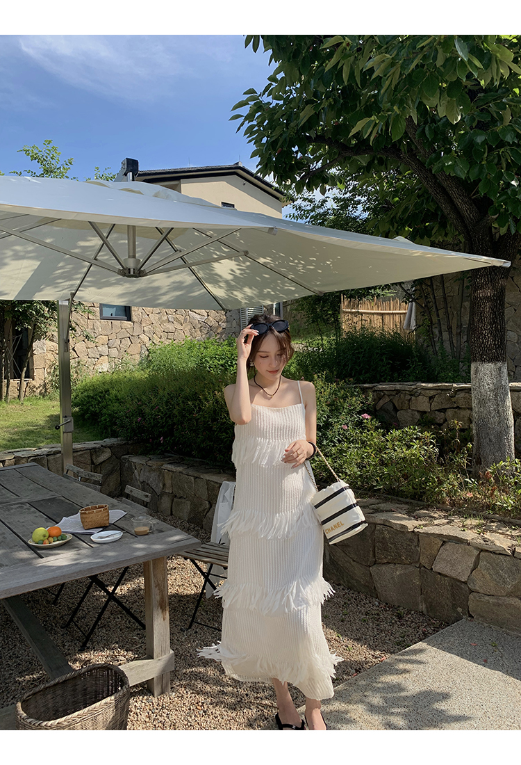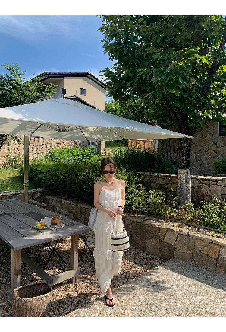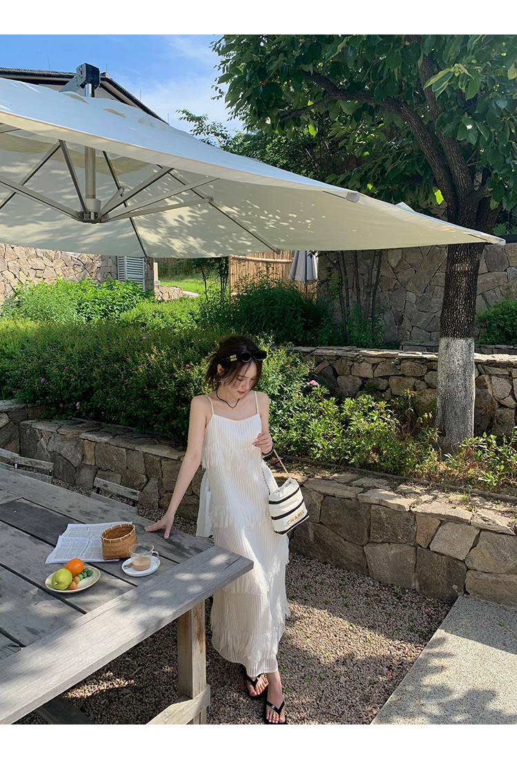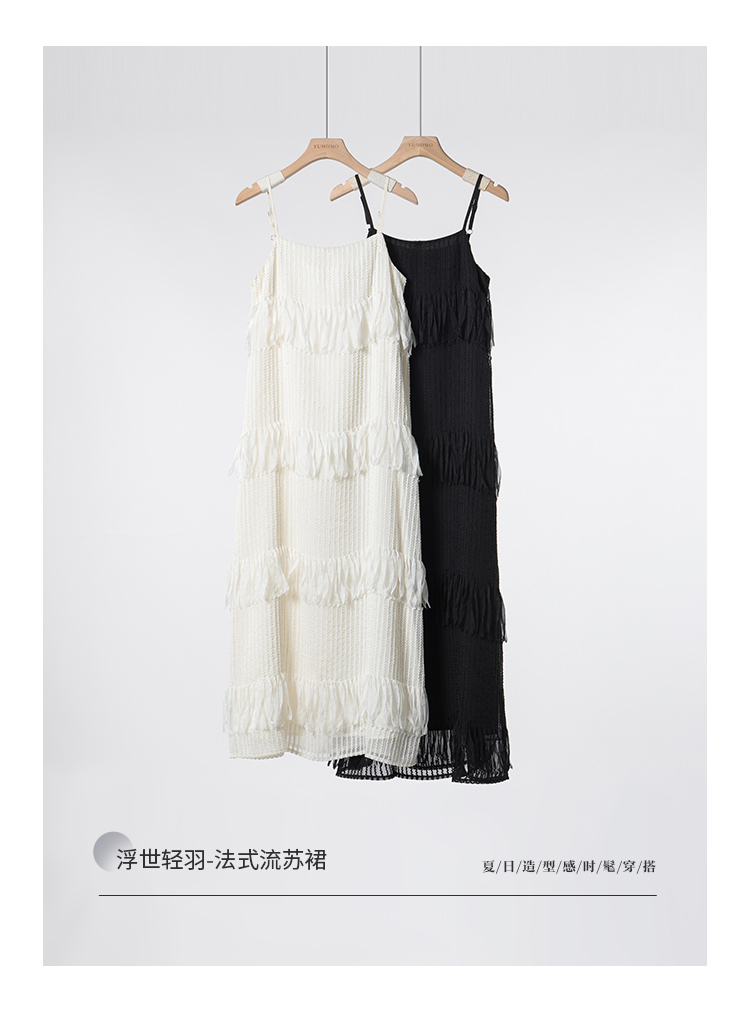 *o-ha-you*【FMQL2042083】浮世輕羽-法式流蘇裙涼感親膚肌理布料遮副乳吊帶裙洋裝