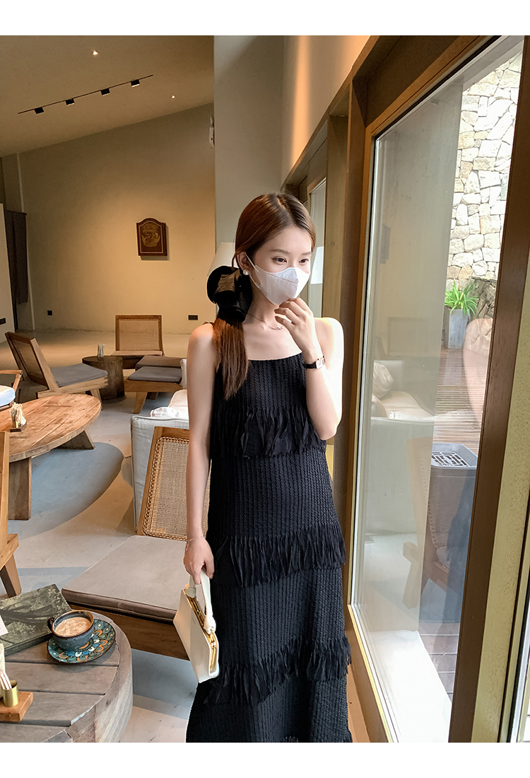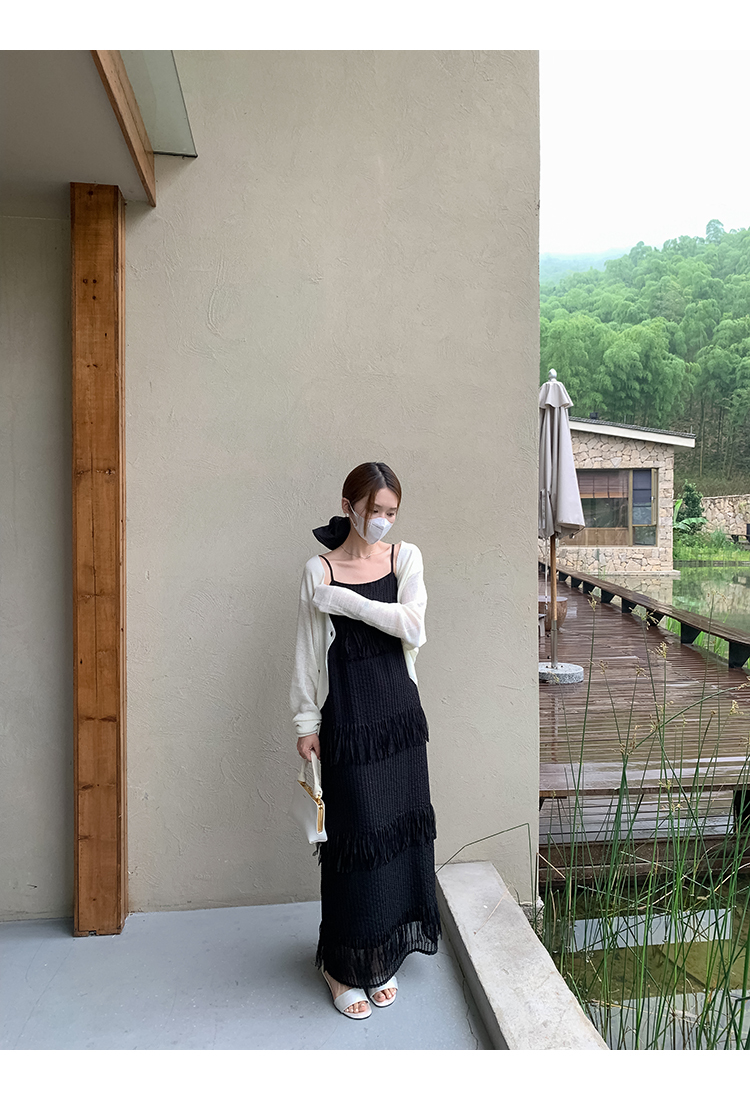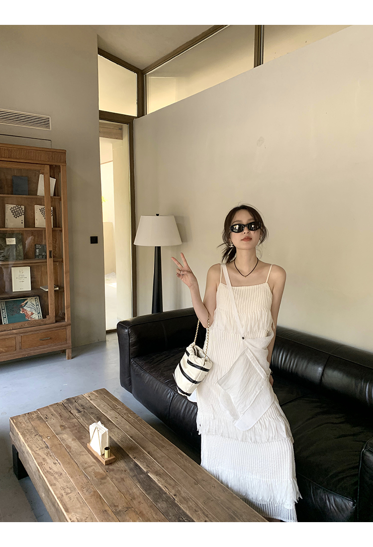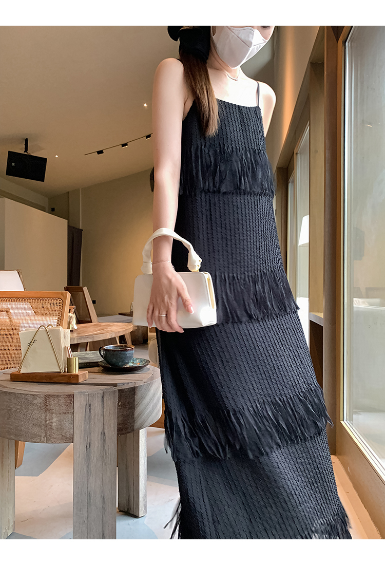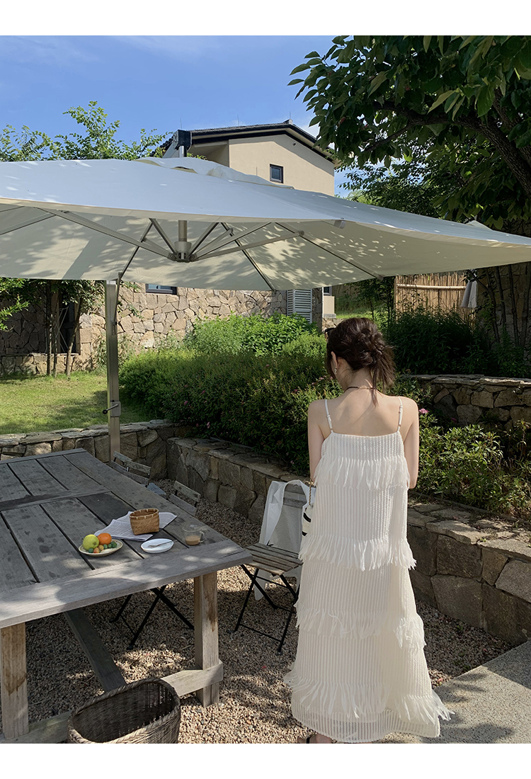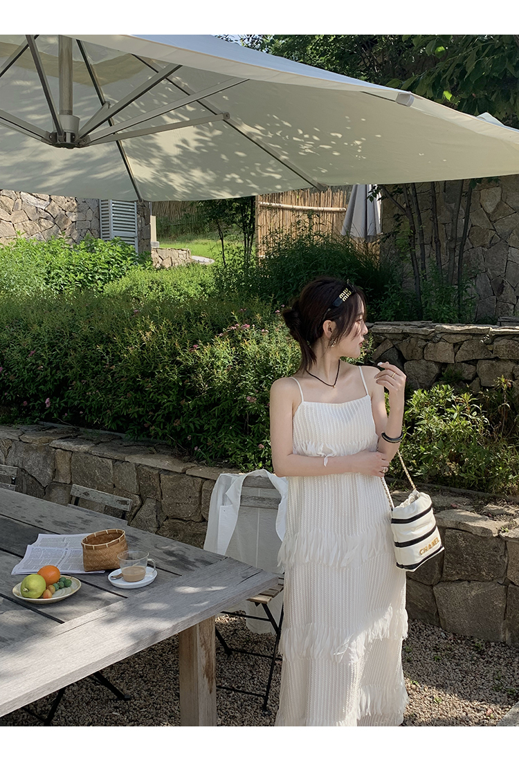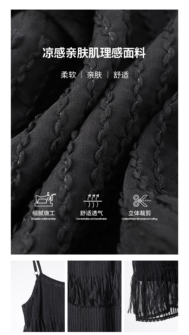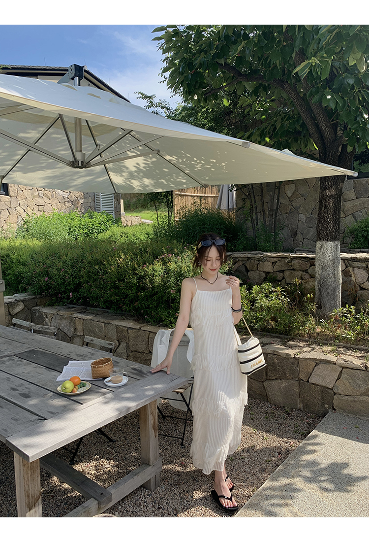 *o-ha-you*【FMQL2042083】浮世輕羽-法式流蘇裙涼感親膚肌理布料遮副乳吊帶裙洋裝