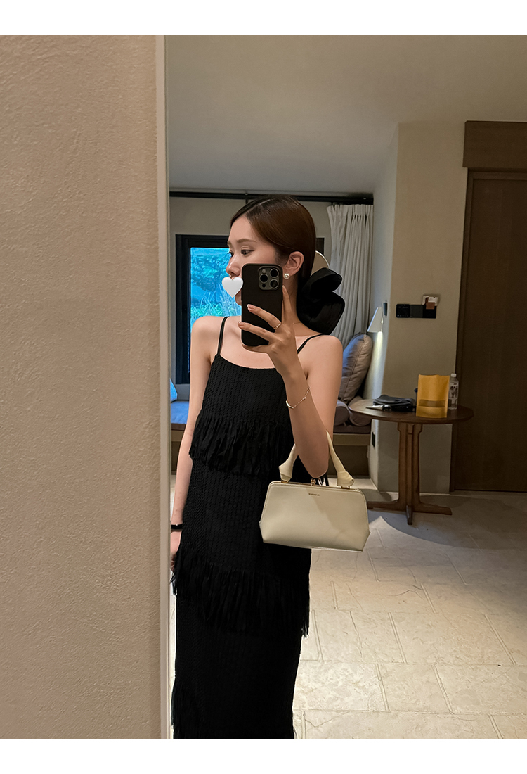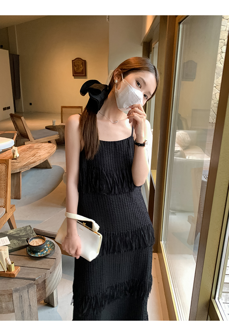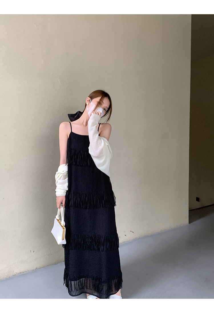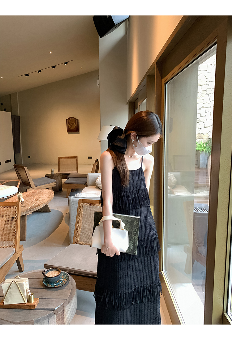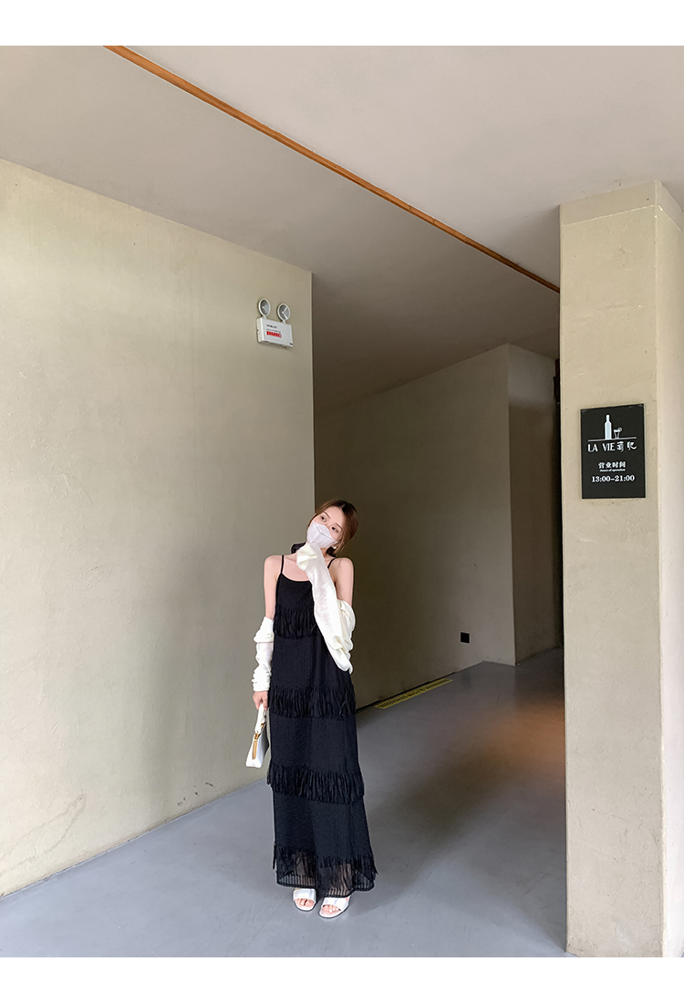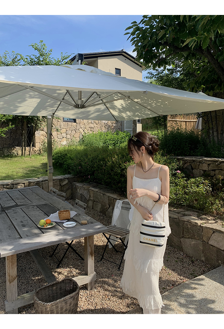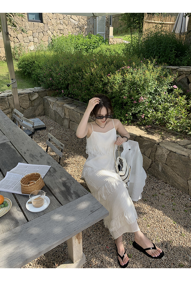 *o-ha-you*【FMQL2042083】浮世輕羽-法式流蘇裙涼感親膚肌理布料遮副乳吊帶裙洋裝
