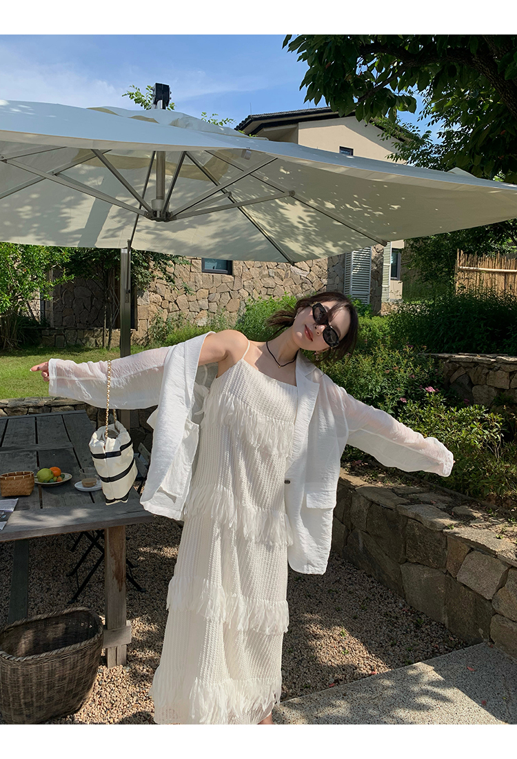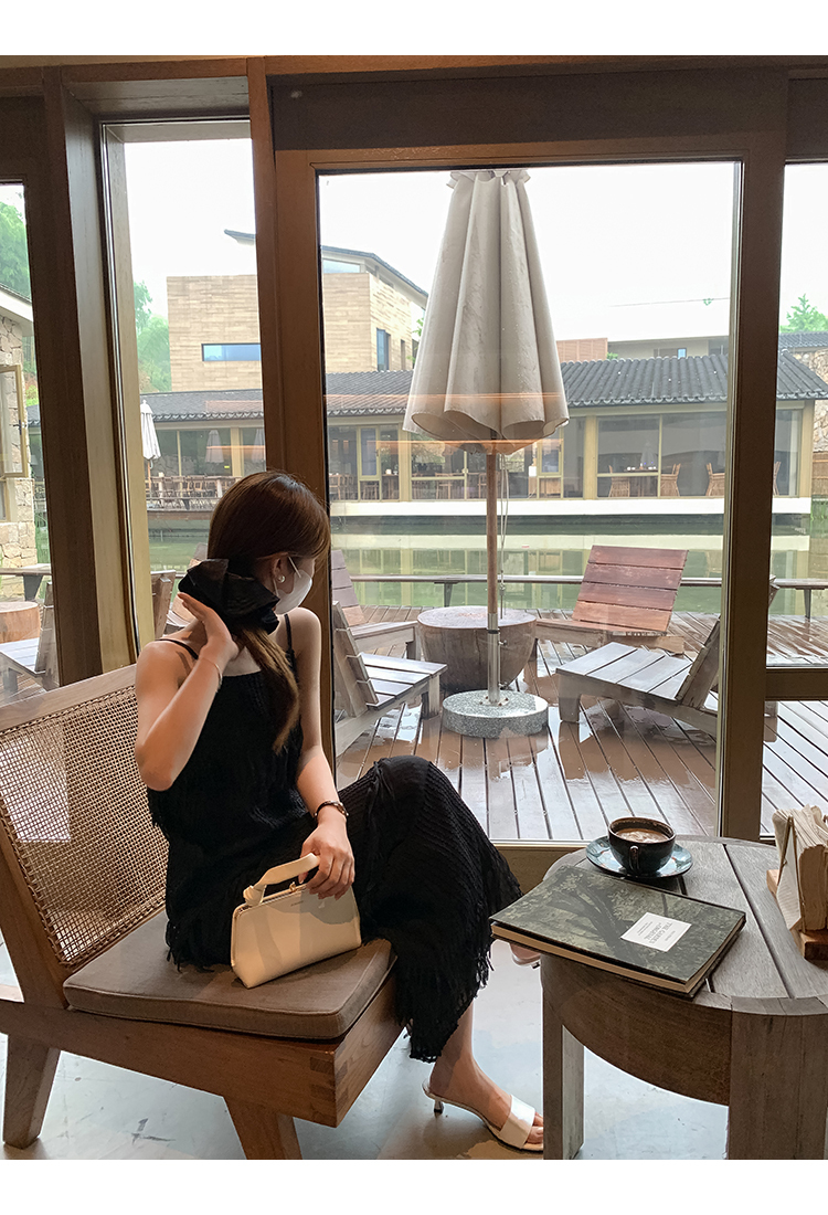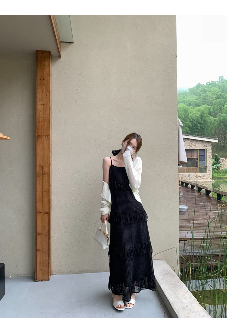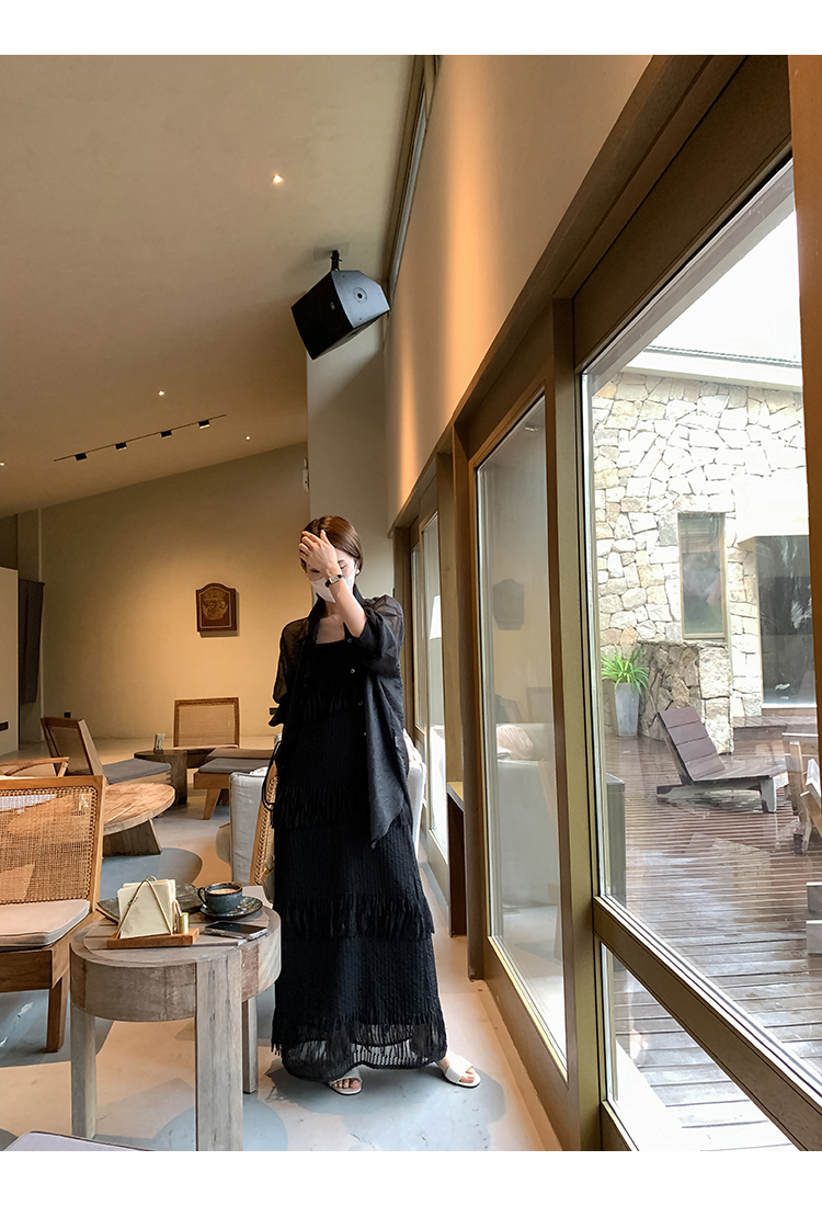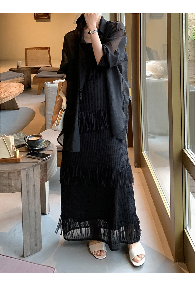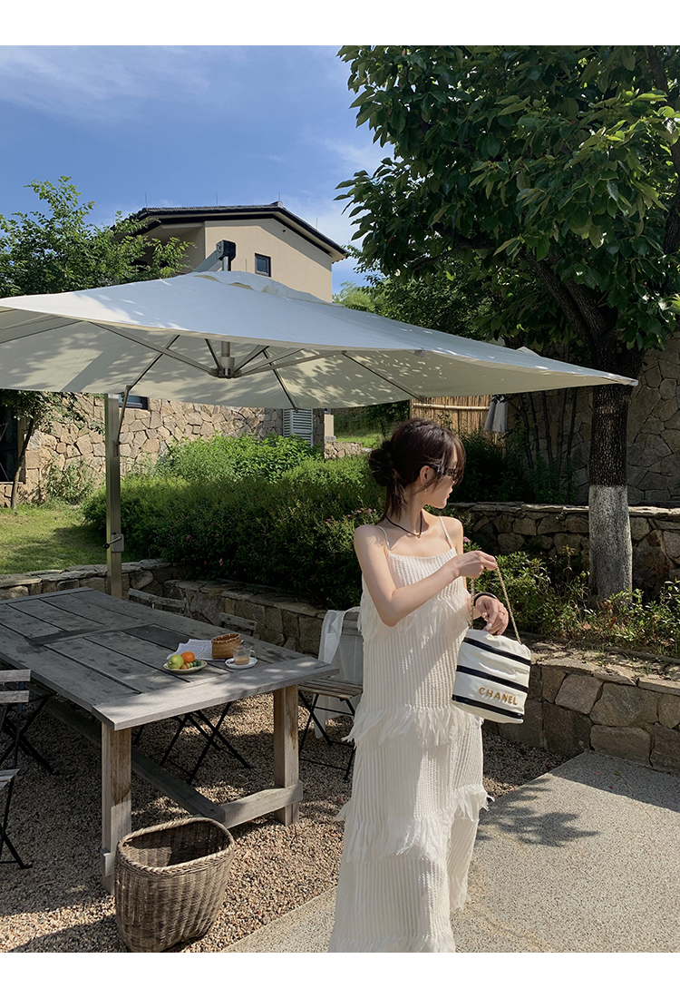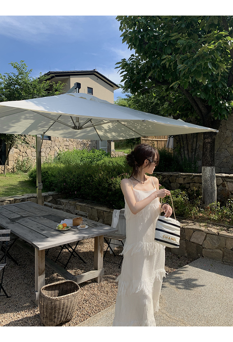 *o-ha-you*【FMQL2042083】浮世輕羽-法式流蘇裙涼感親膚肌理布料遮副乳吊帶裙洋裝