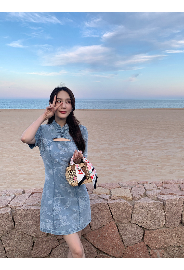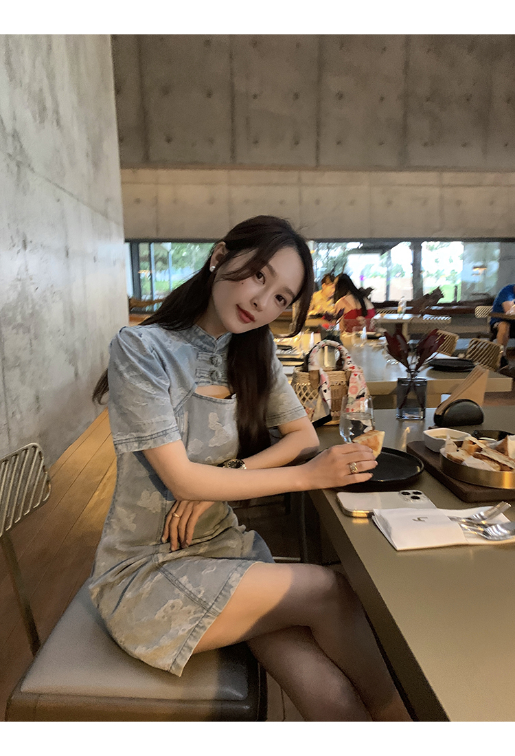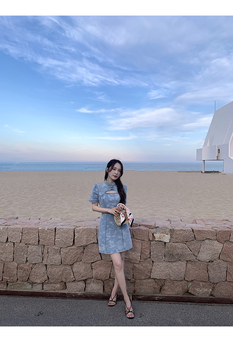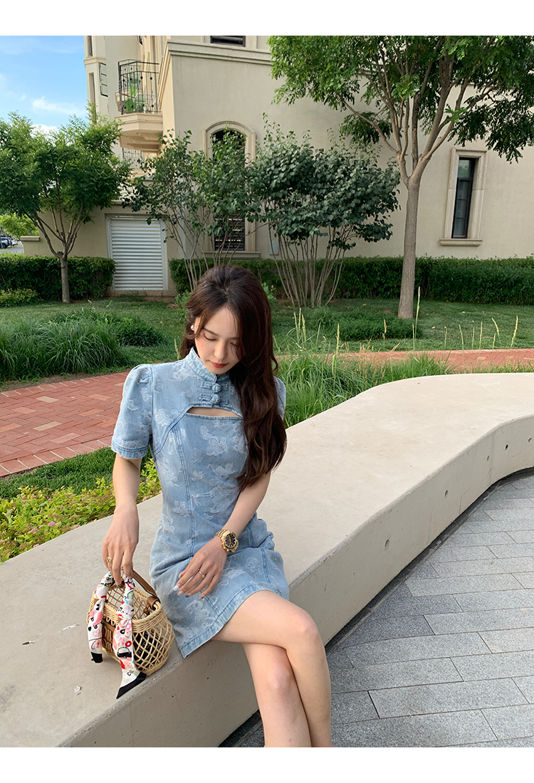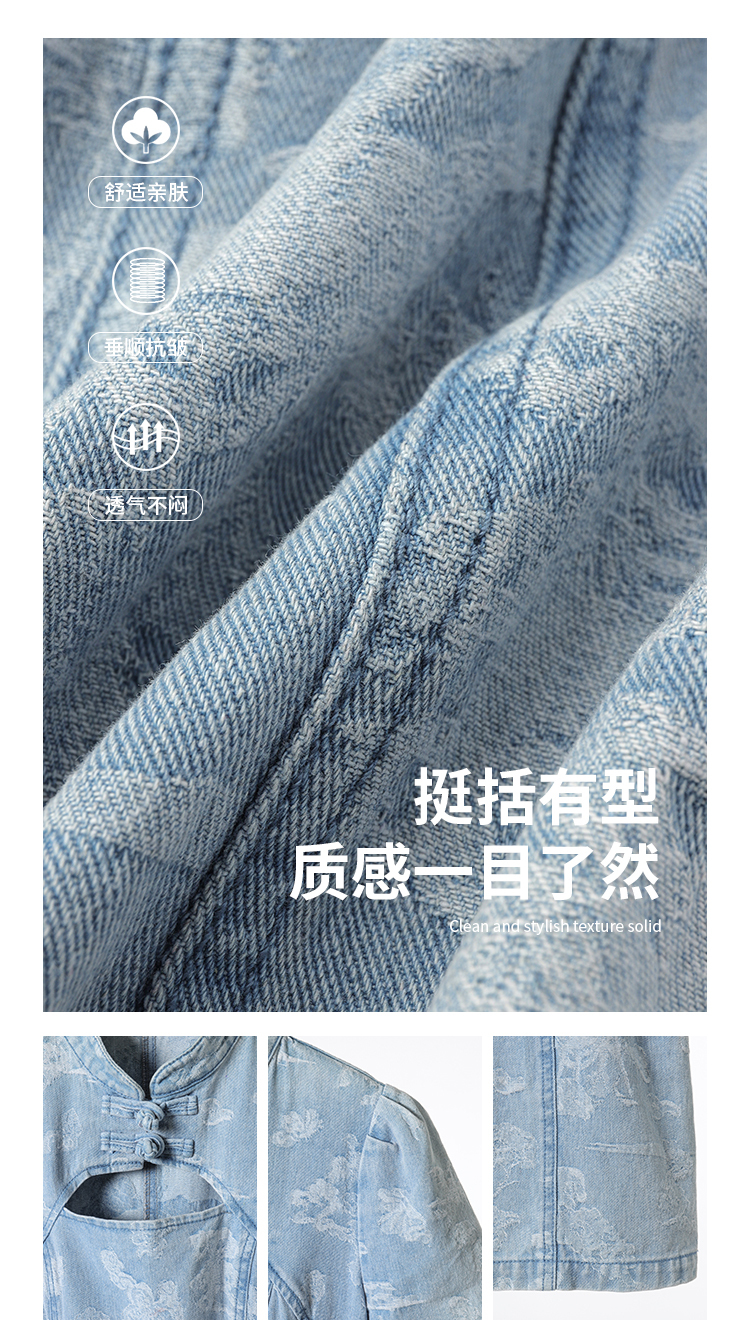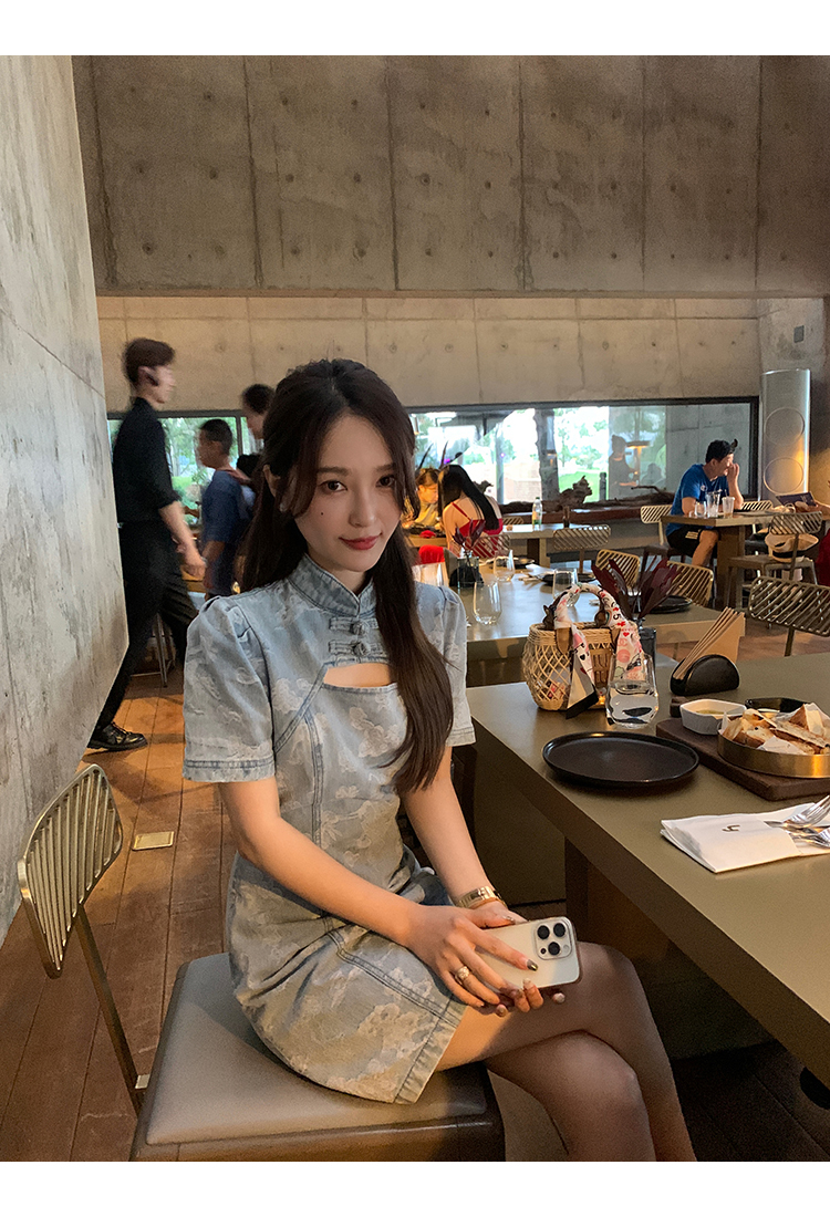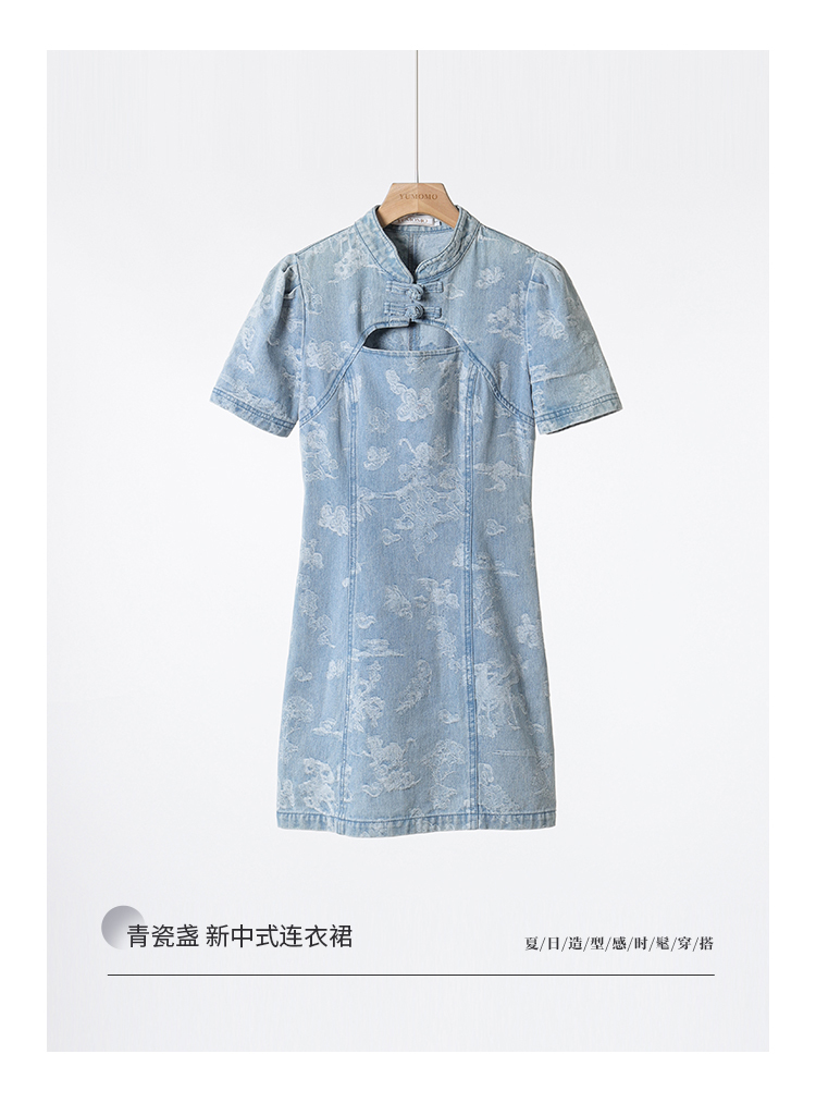 *o-ha-you*【FMQL2042084】青瓷盞新中式連衣裙純棉提花牛仔小個子旗袍改良短洋裝