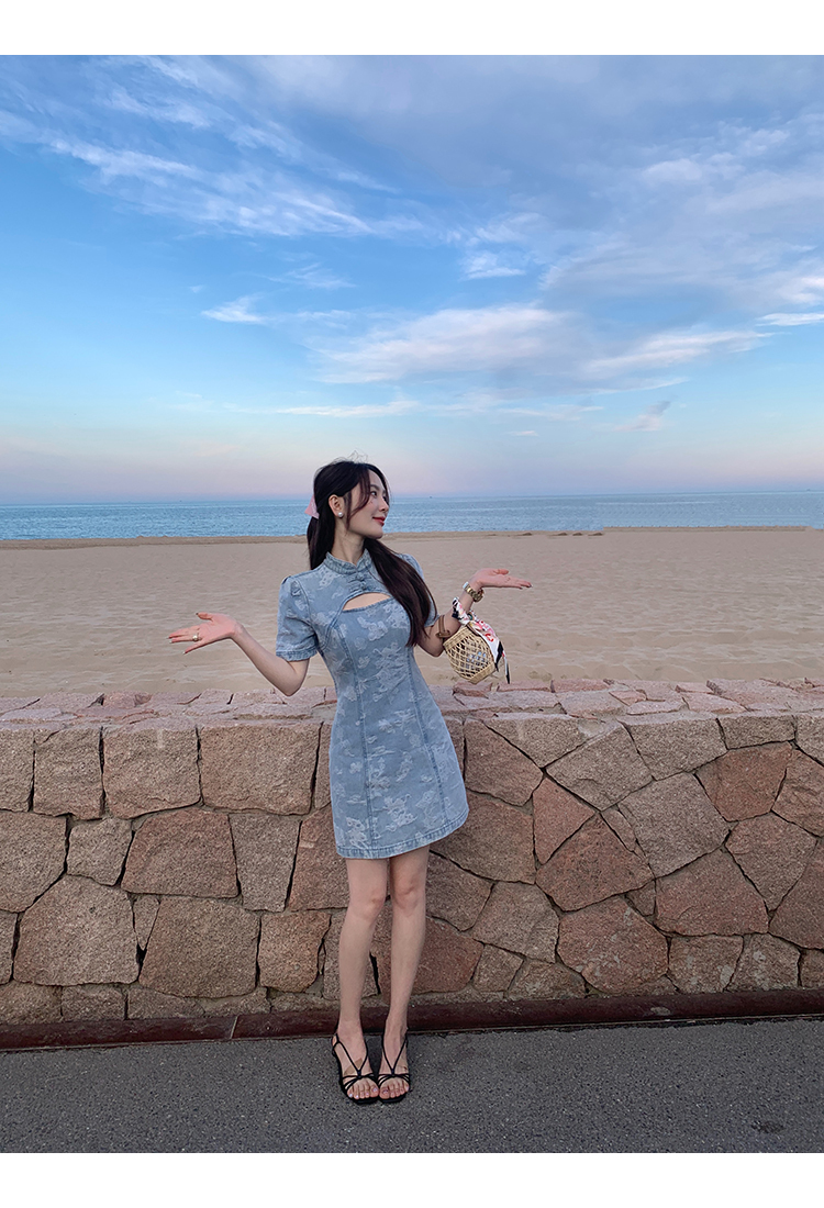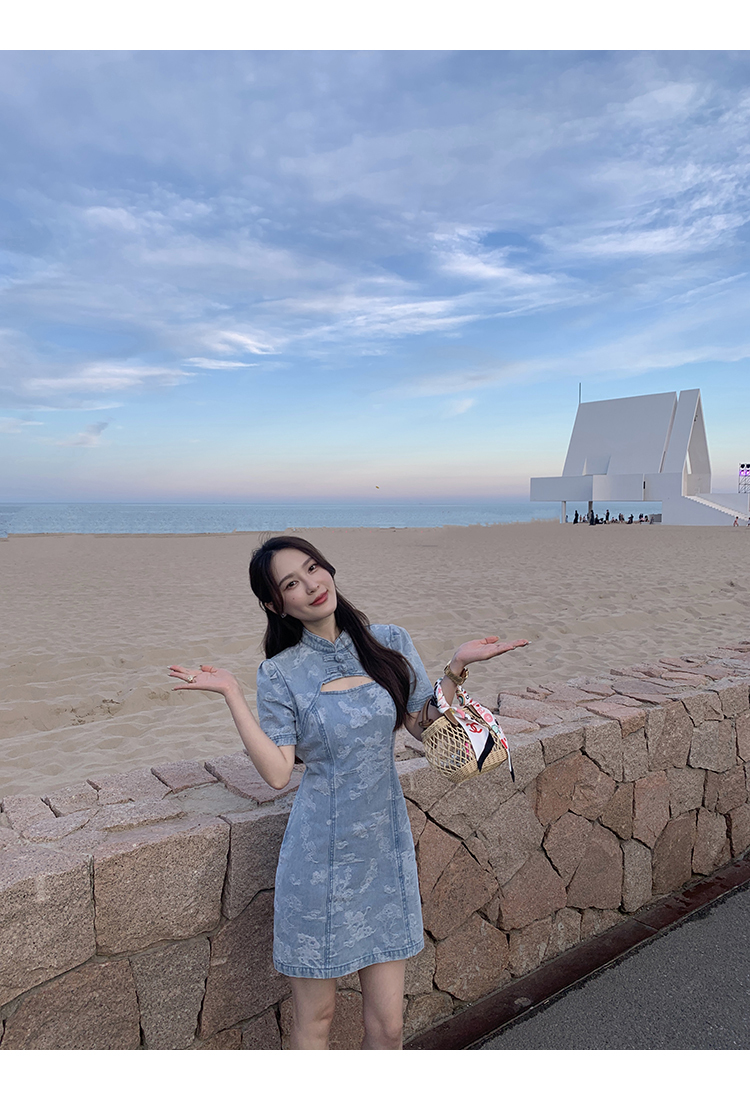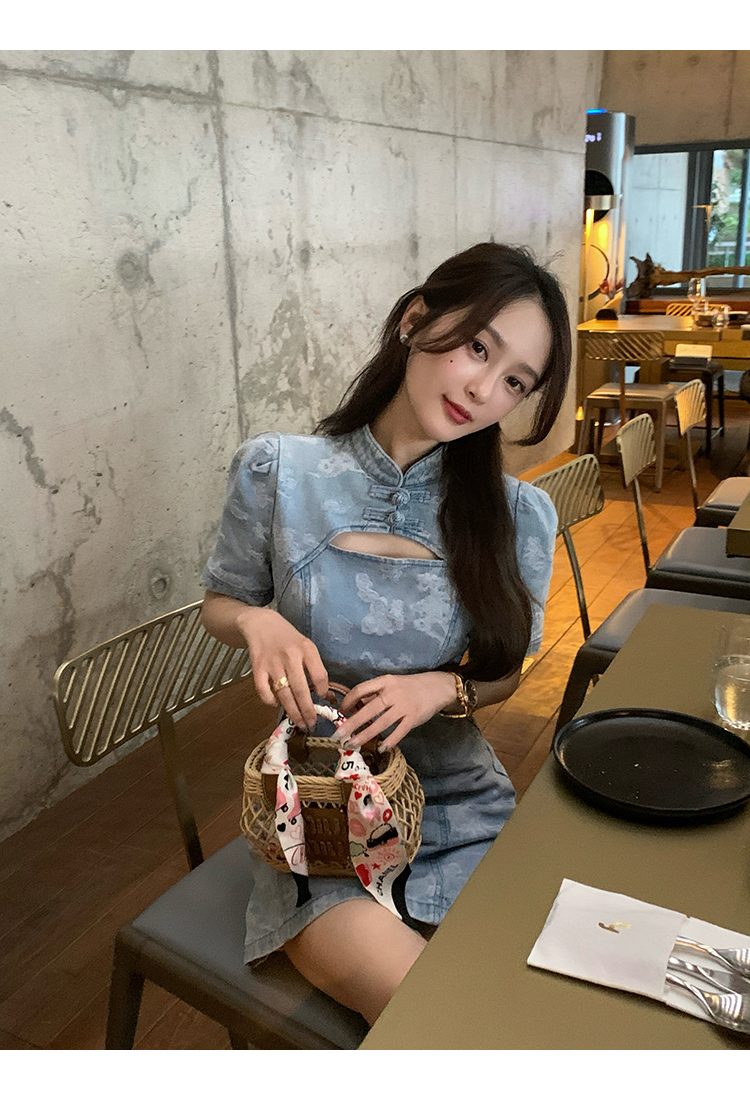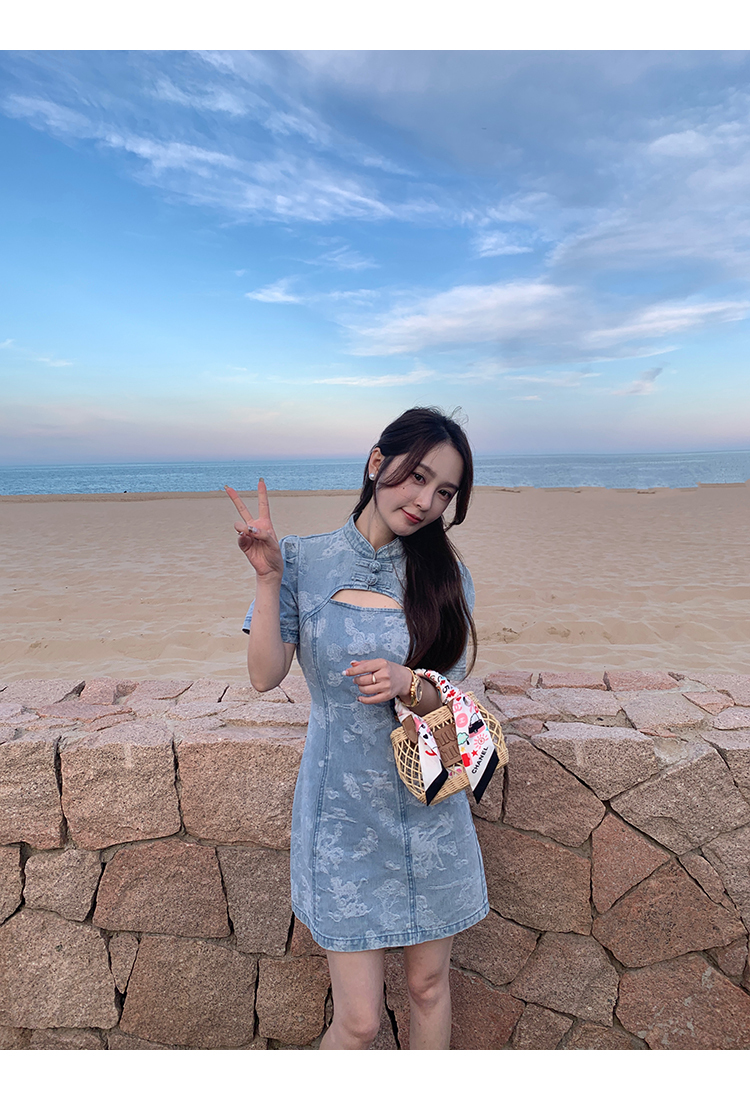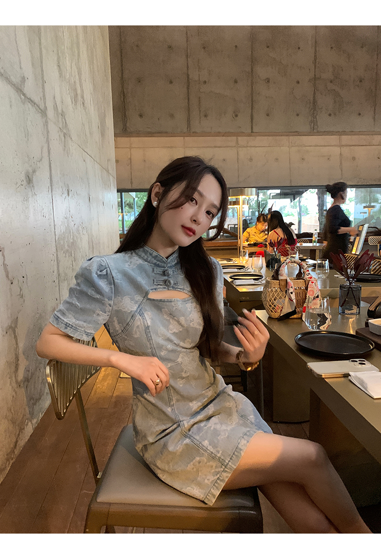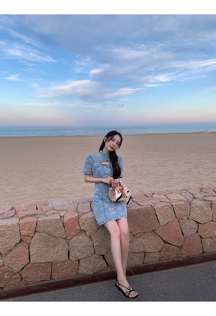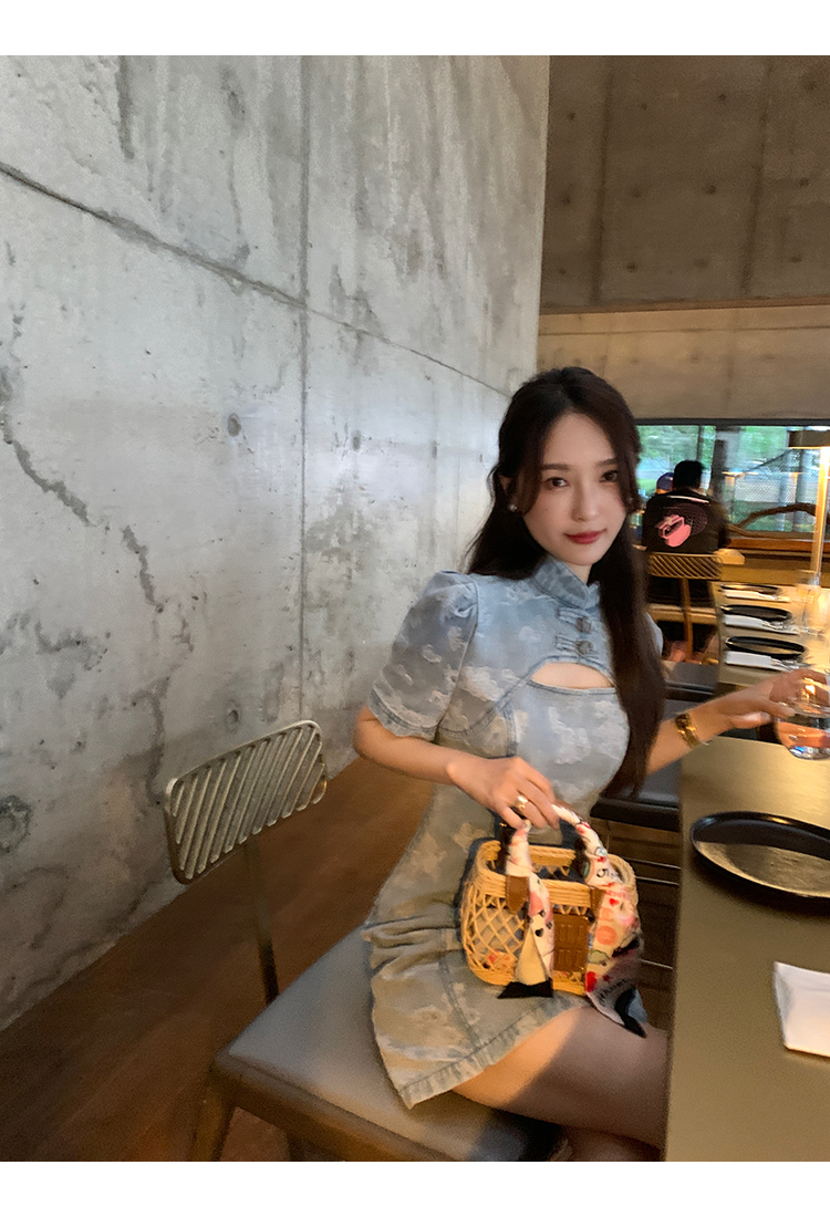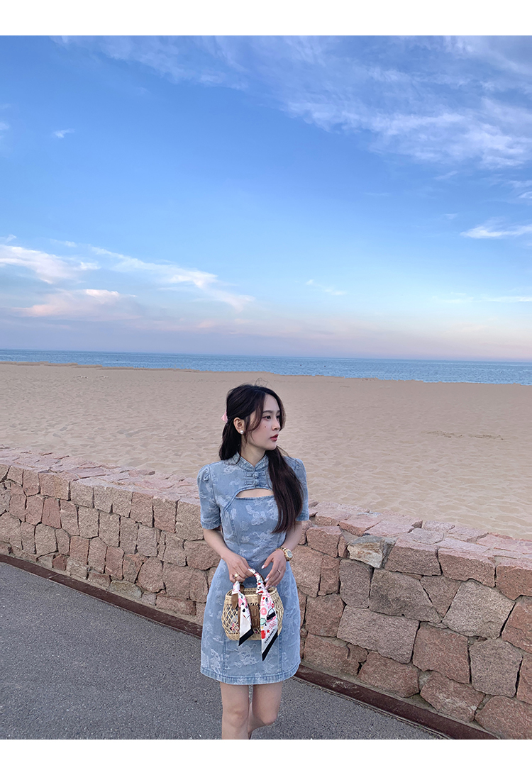 *o-ha-you*【FMQL2042084】青瓷盞新中式連衣裙純棉提花牛仔小個子旗袍改良短洋裝