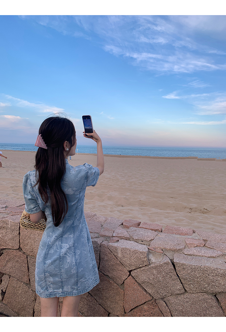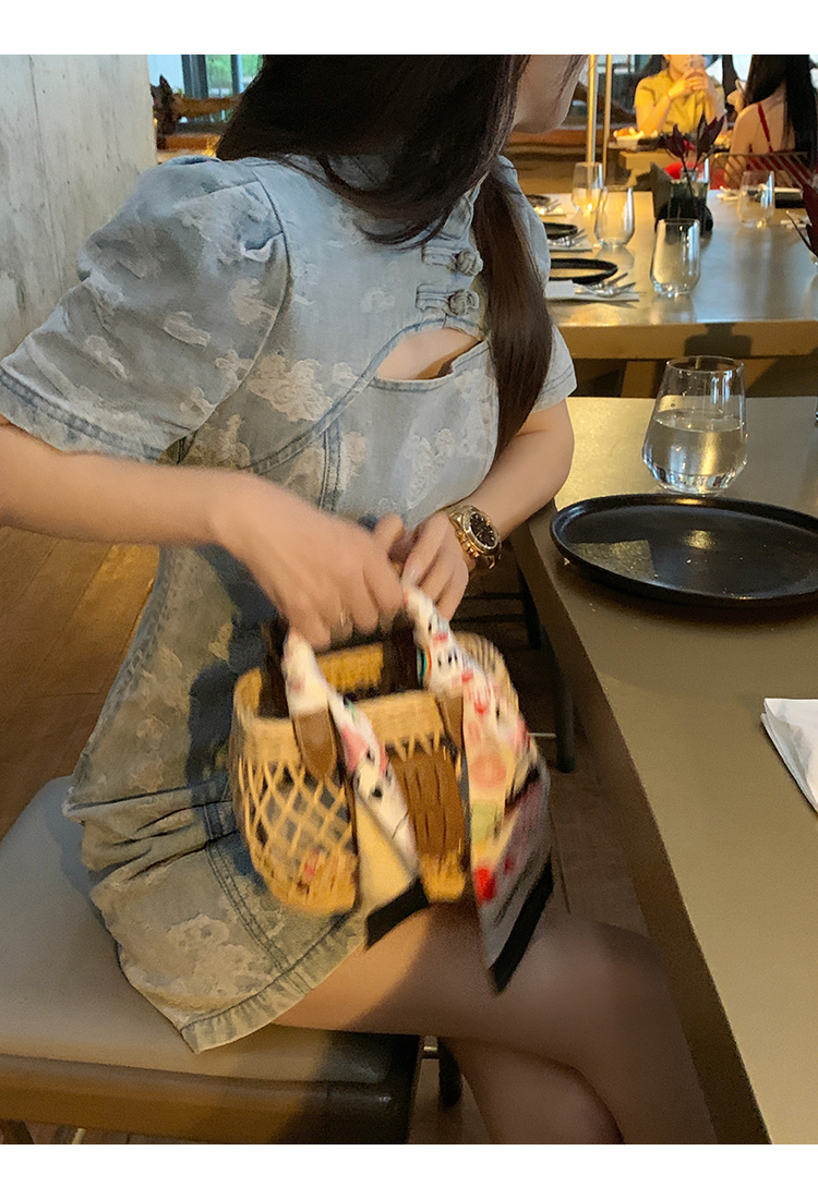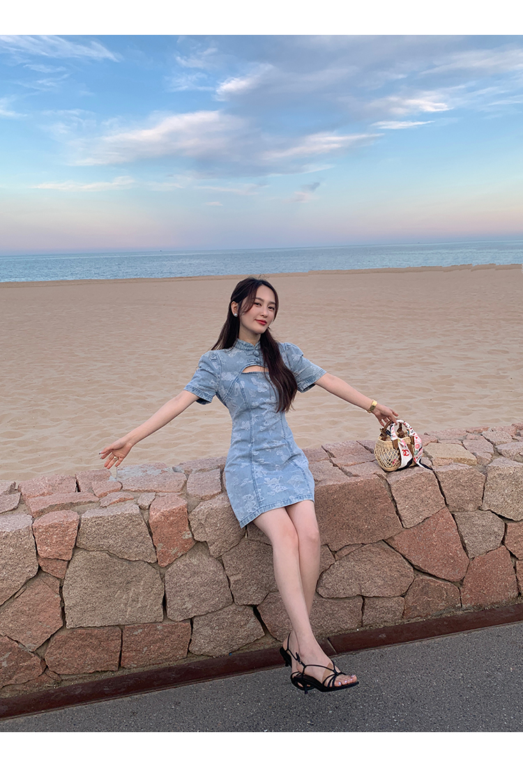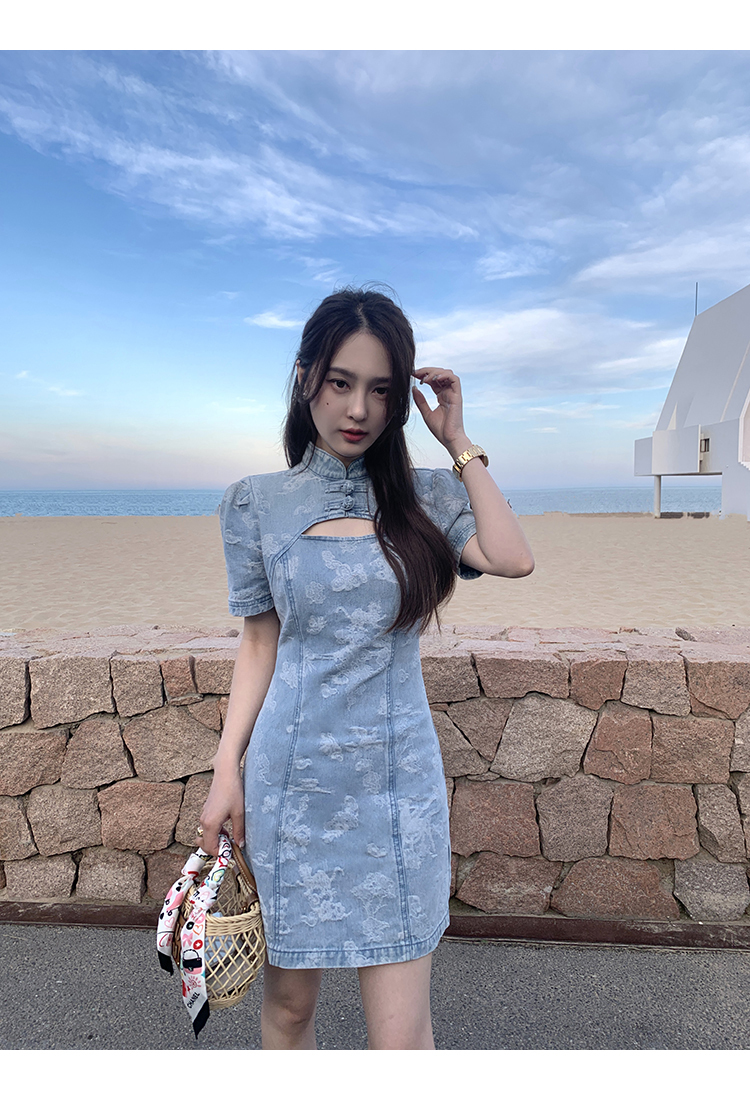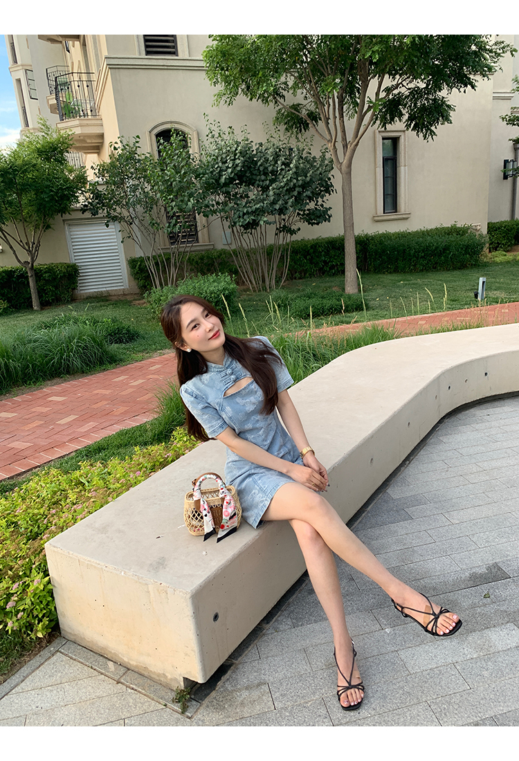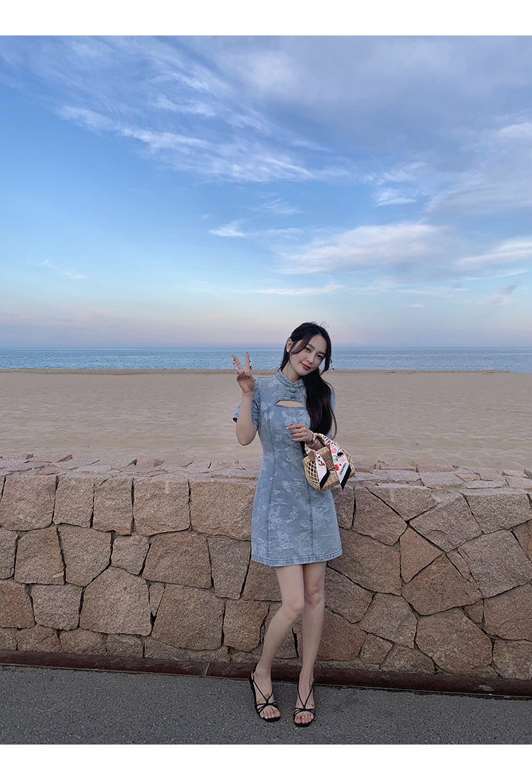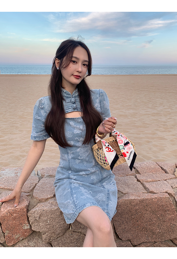 *o-ha-you*【FMQL2042084】青瓷盞新中式連衣裙純棉提花牛仔小個子旗袍改良短洋裝